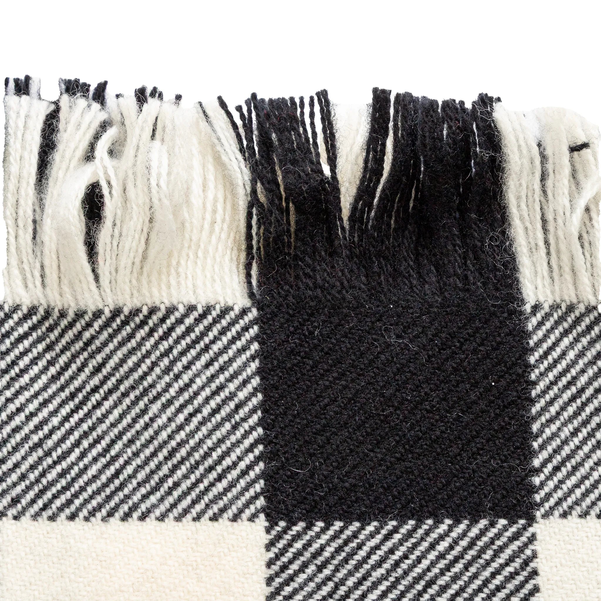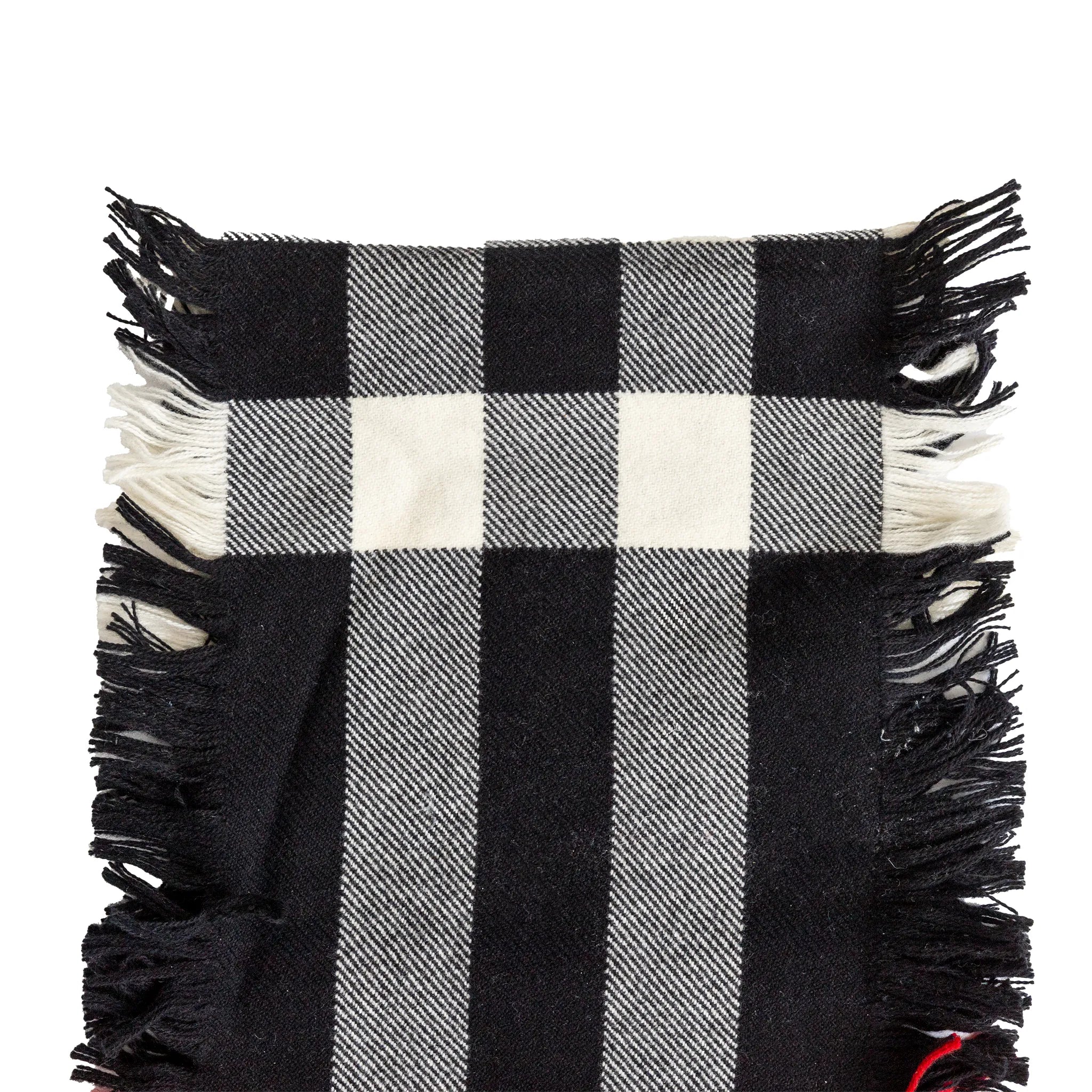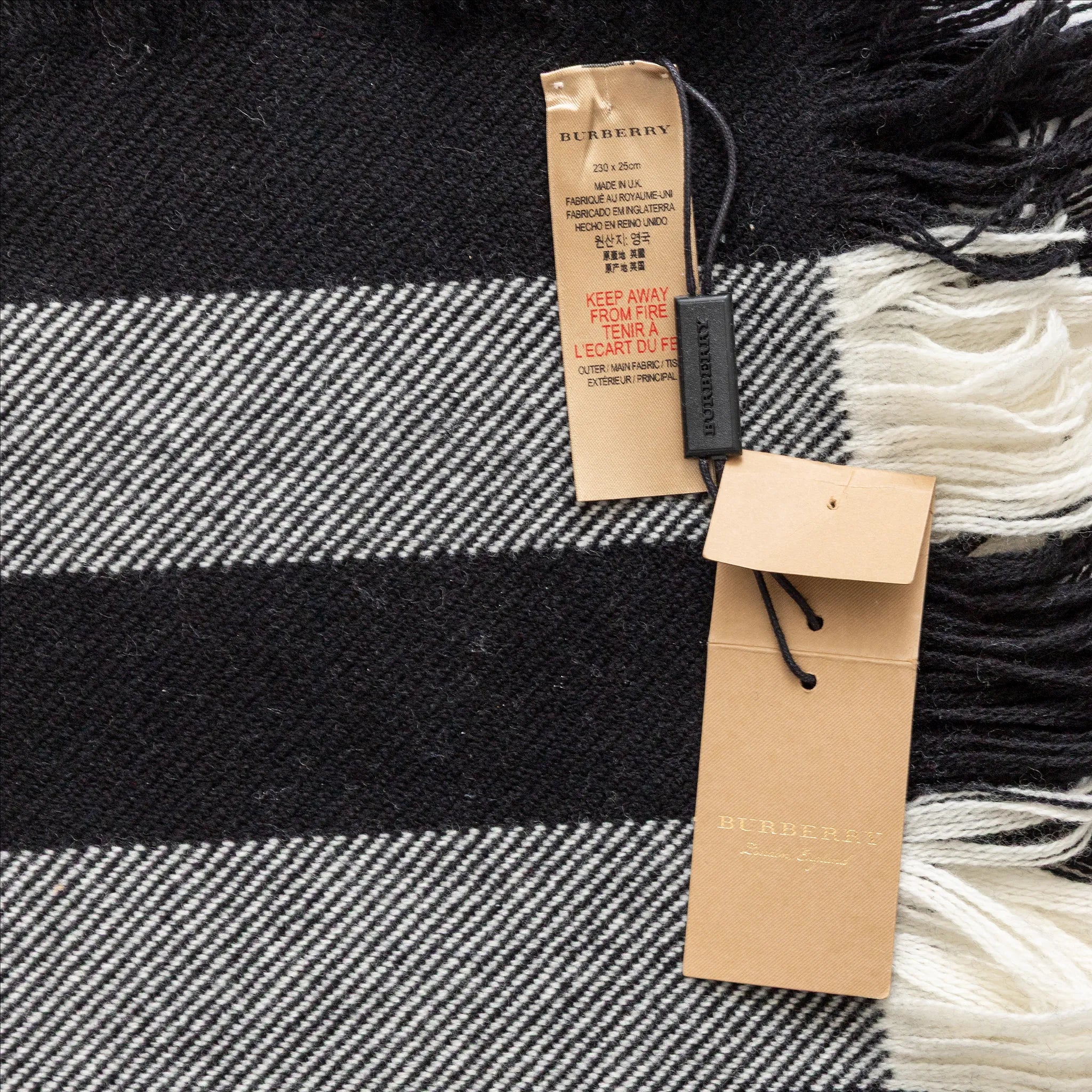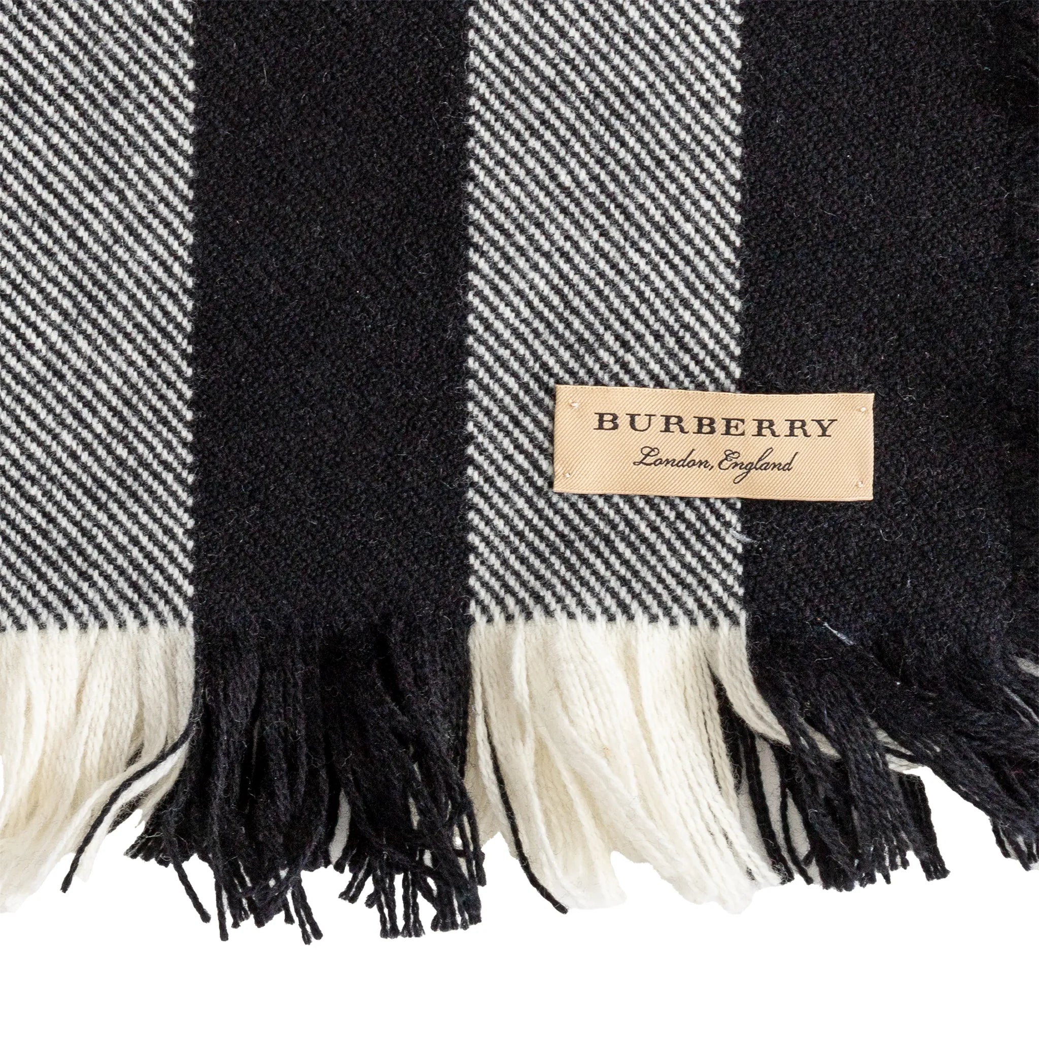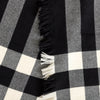 Classic Burberry plaid scarf in 100% soft wool, featuring bold black, white, and red checks with chic fringed edges.