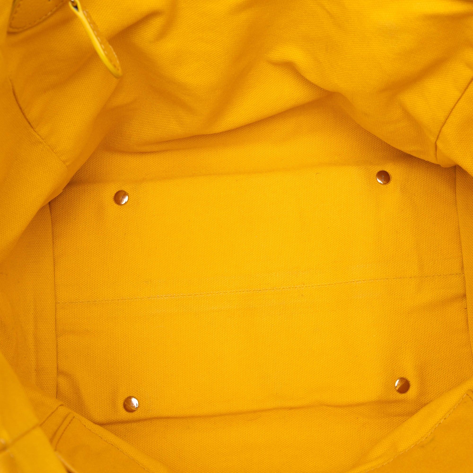 The Canterbury tote bag features a printed coated canvas body with leather trim, flat leather top handles, an open top with snap button closures, and interior zip and slip pockets. Retail Price: 895.00