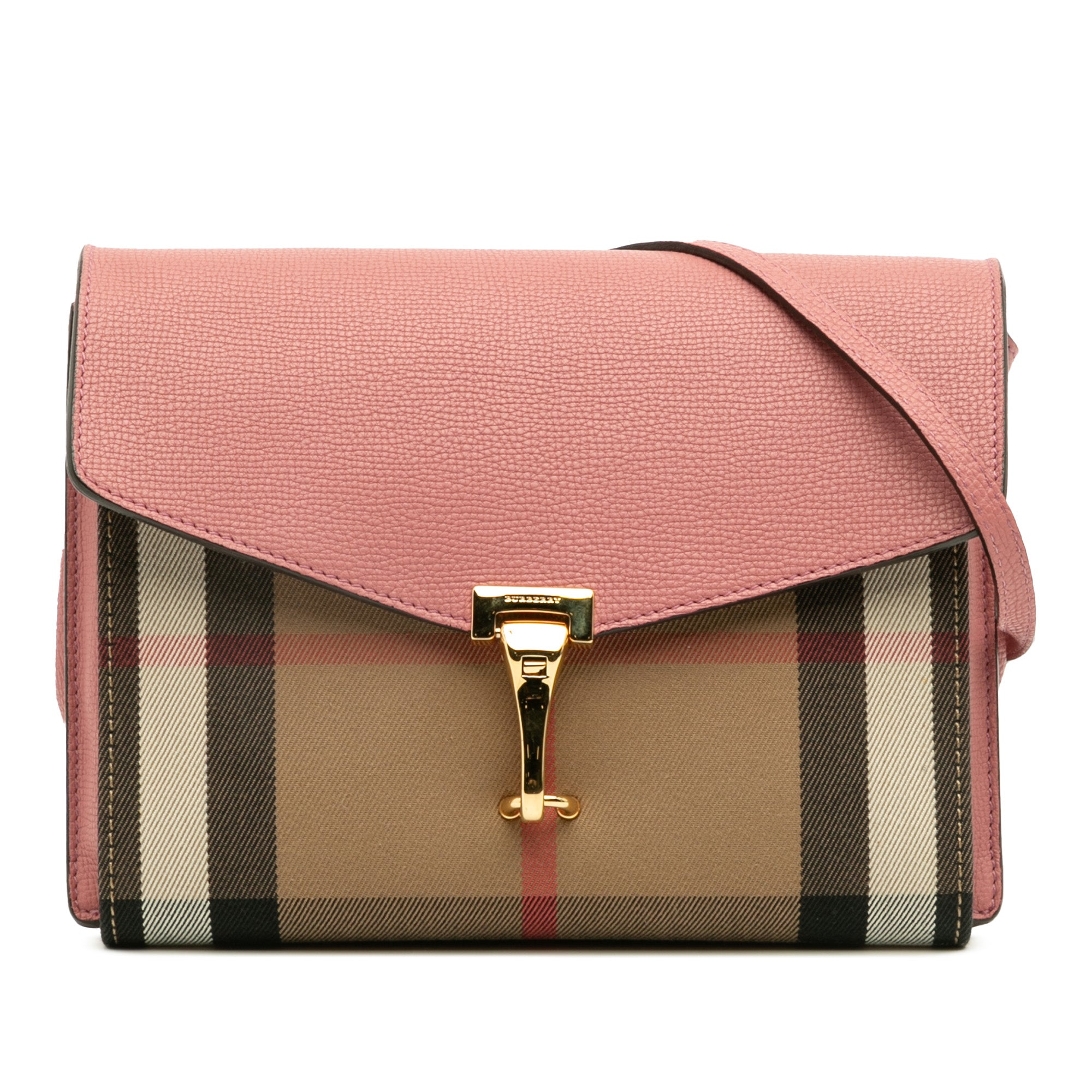 The Macken features a leather and house check canvas body, an adjustable flat leather strap, a flap with a clasp closure, an exterior back zip pocket, and an interior slip pocket. Retail Price: 1095.00