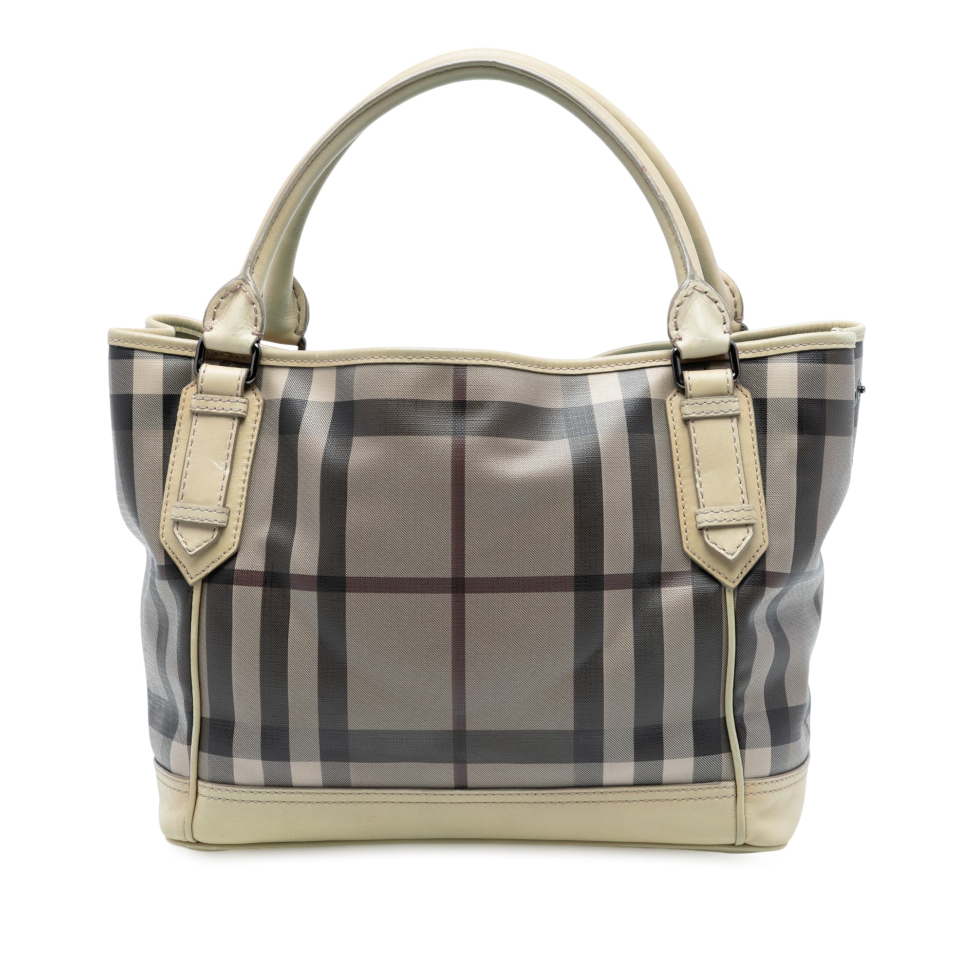 This handbag features a smoked check coated canvas body with leather trim, rolled leather handles, a top zip closure, and interior zip and slip pockets. Retail Price: 760.00