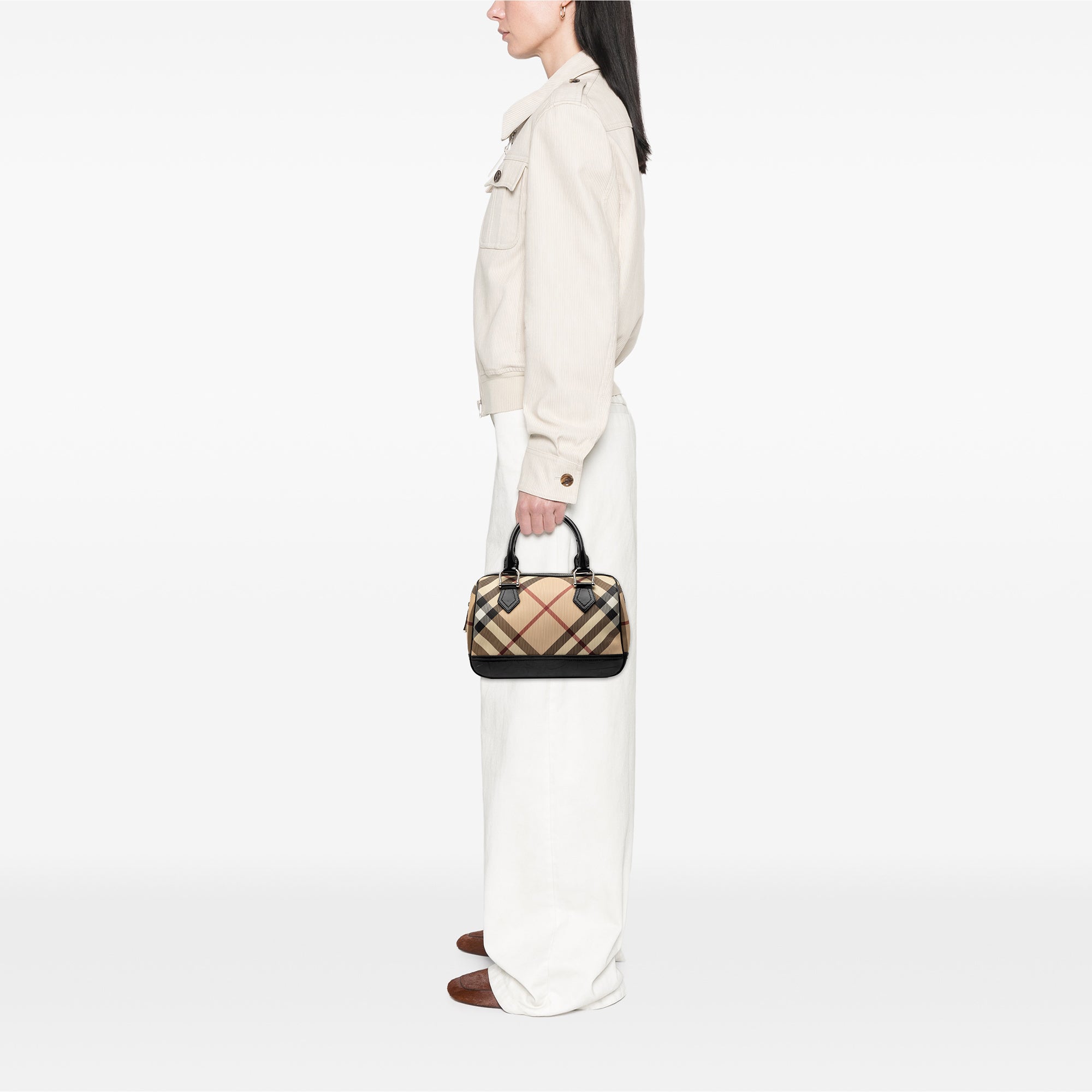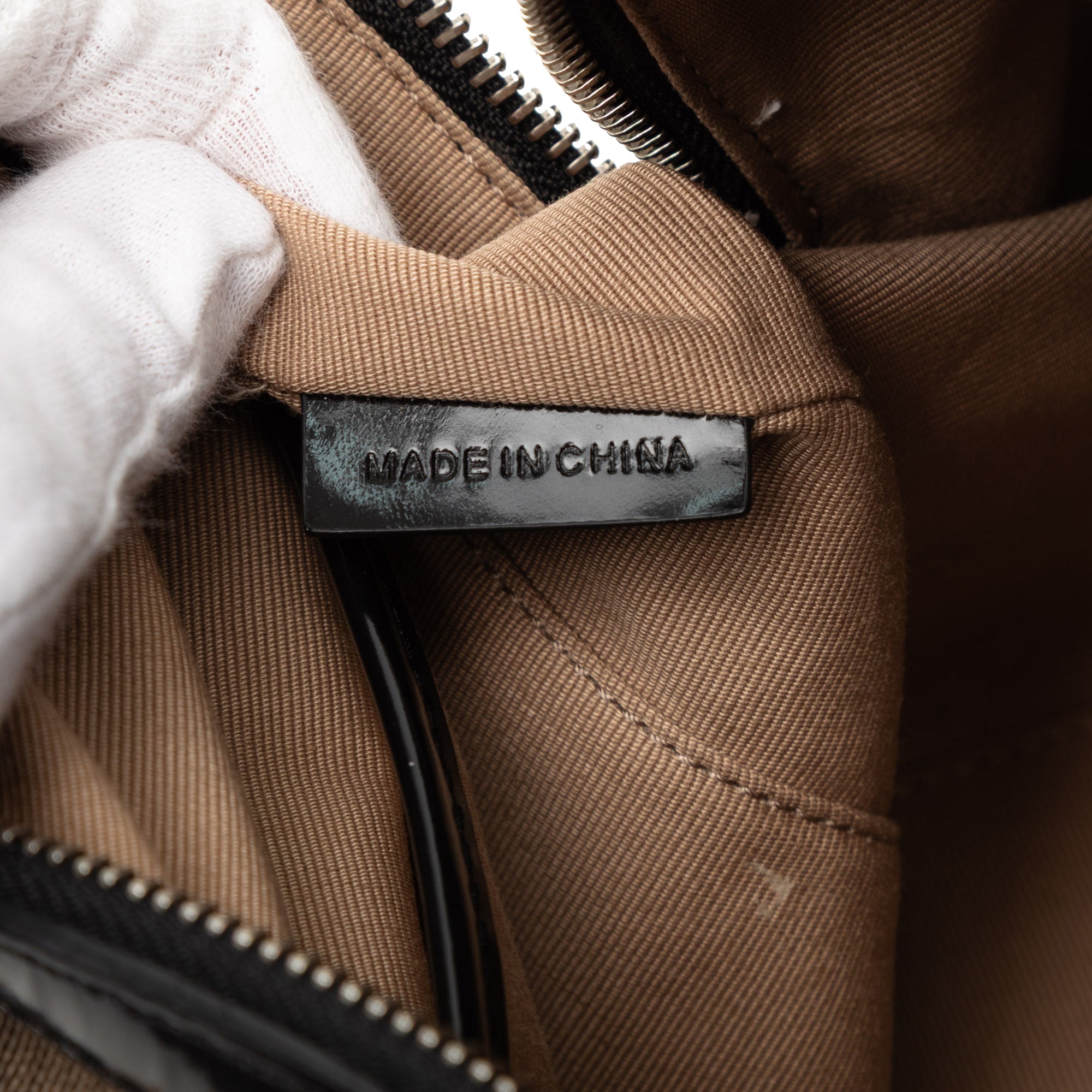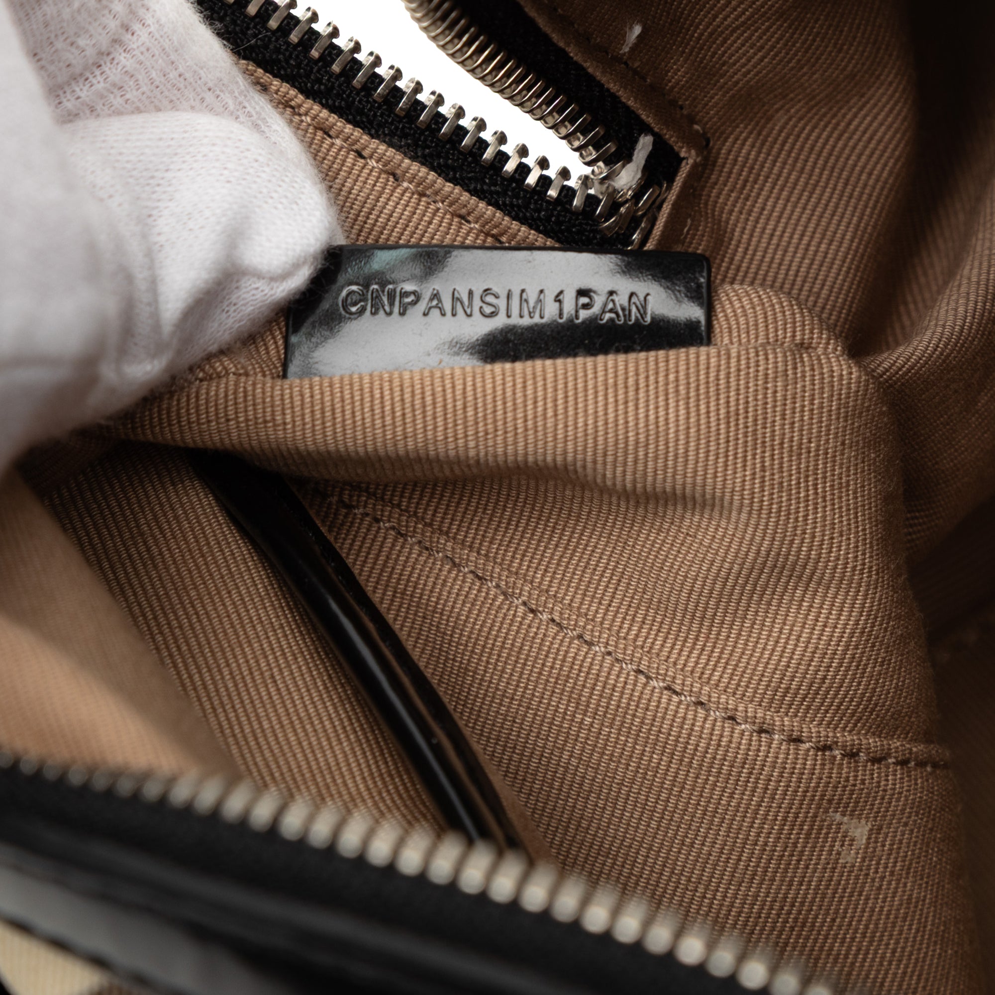 This boston bag features a supernova check coated canvas body with patent leather trim, rolled leather handles, a top zip closure, and interior slip pockets. Retail Price: 900.00