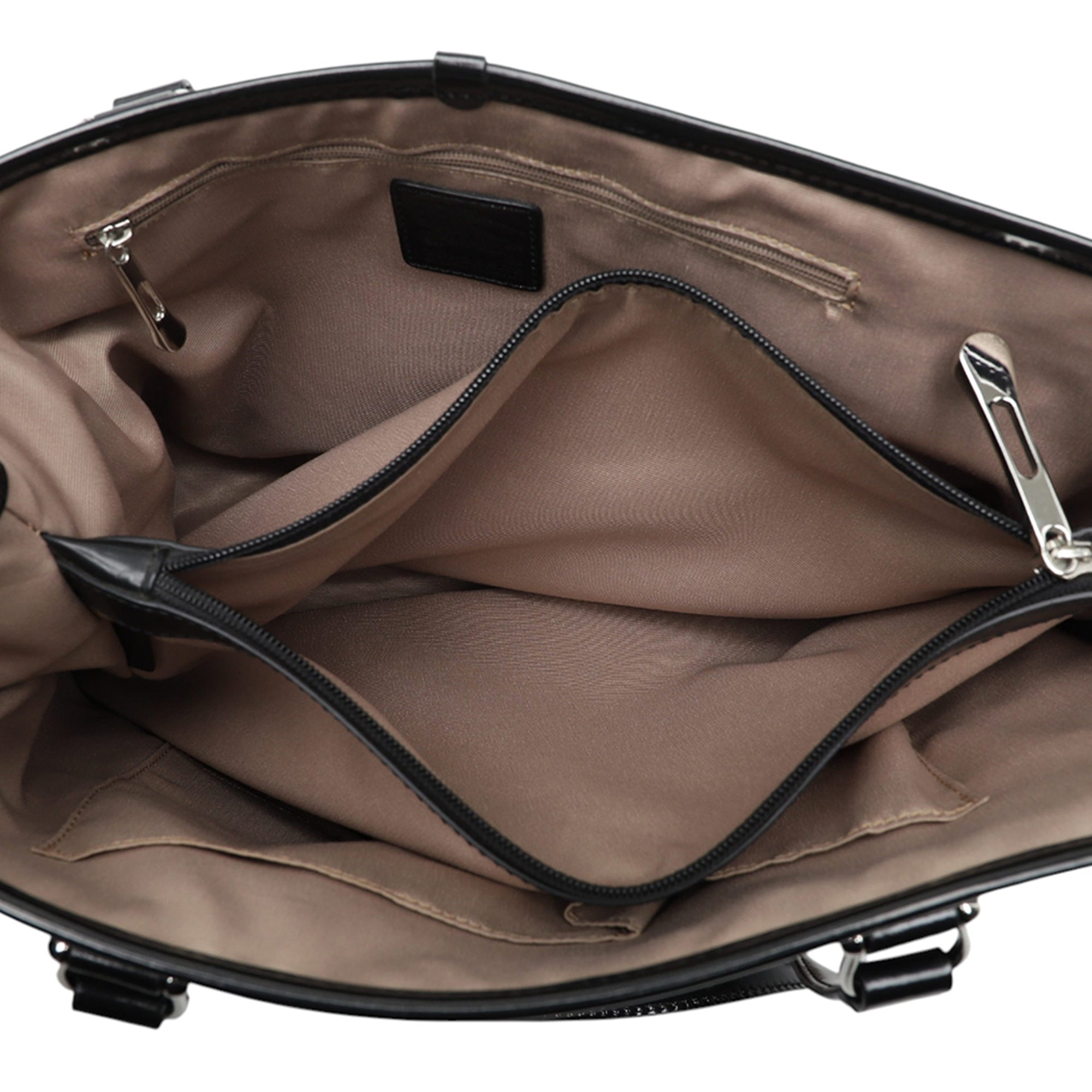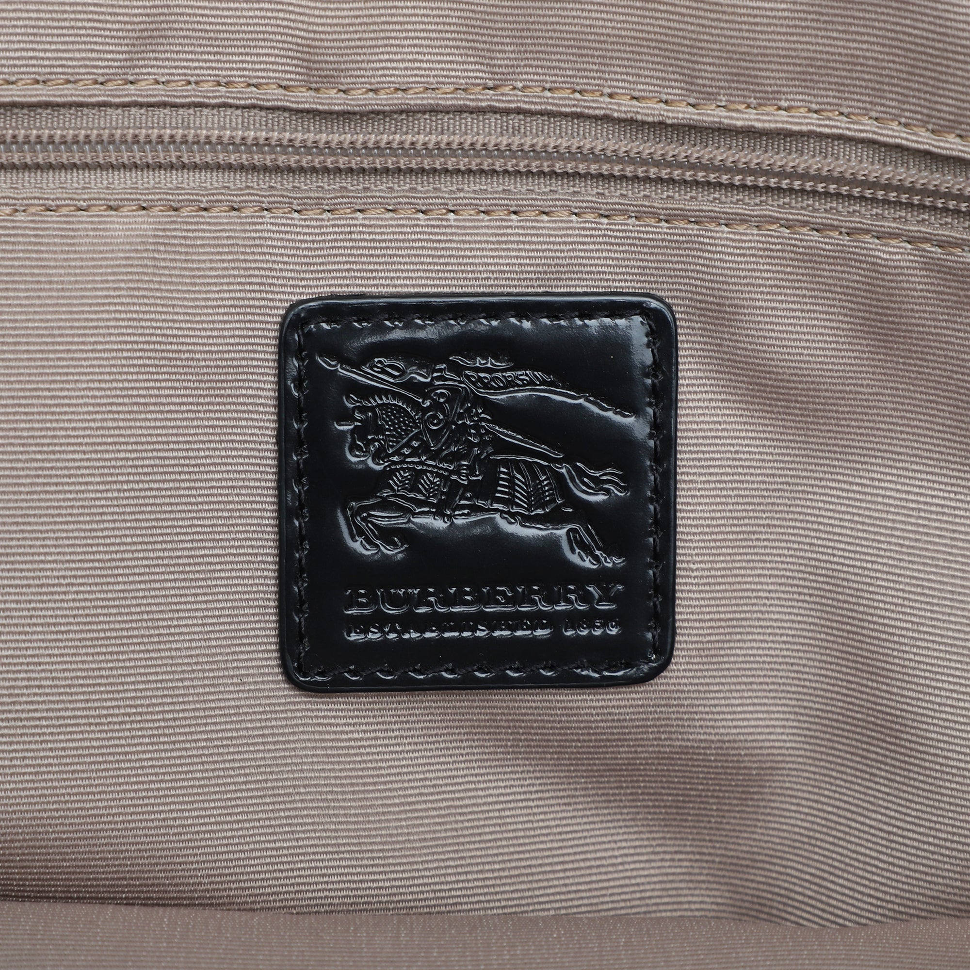 This tote bag features a supernova check coated canvas body with patent leather trim, flat leather straps, an open top, an exterior slip pocket, and interior zip and slip pockets. Retail Price: 1395.00
