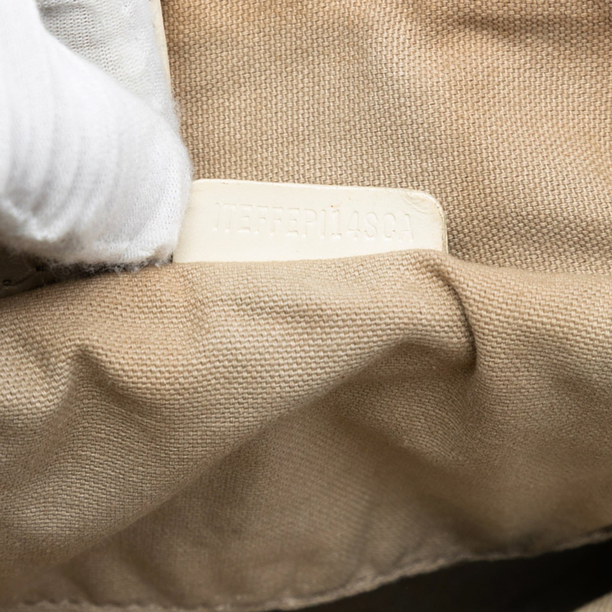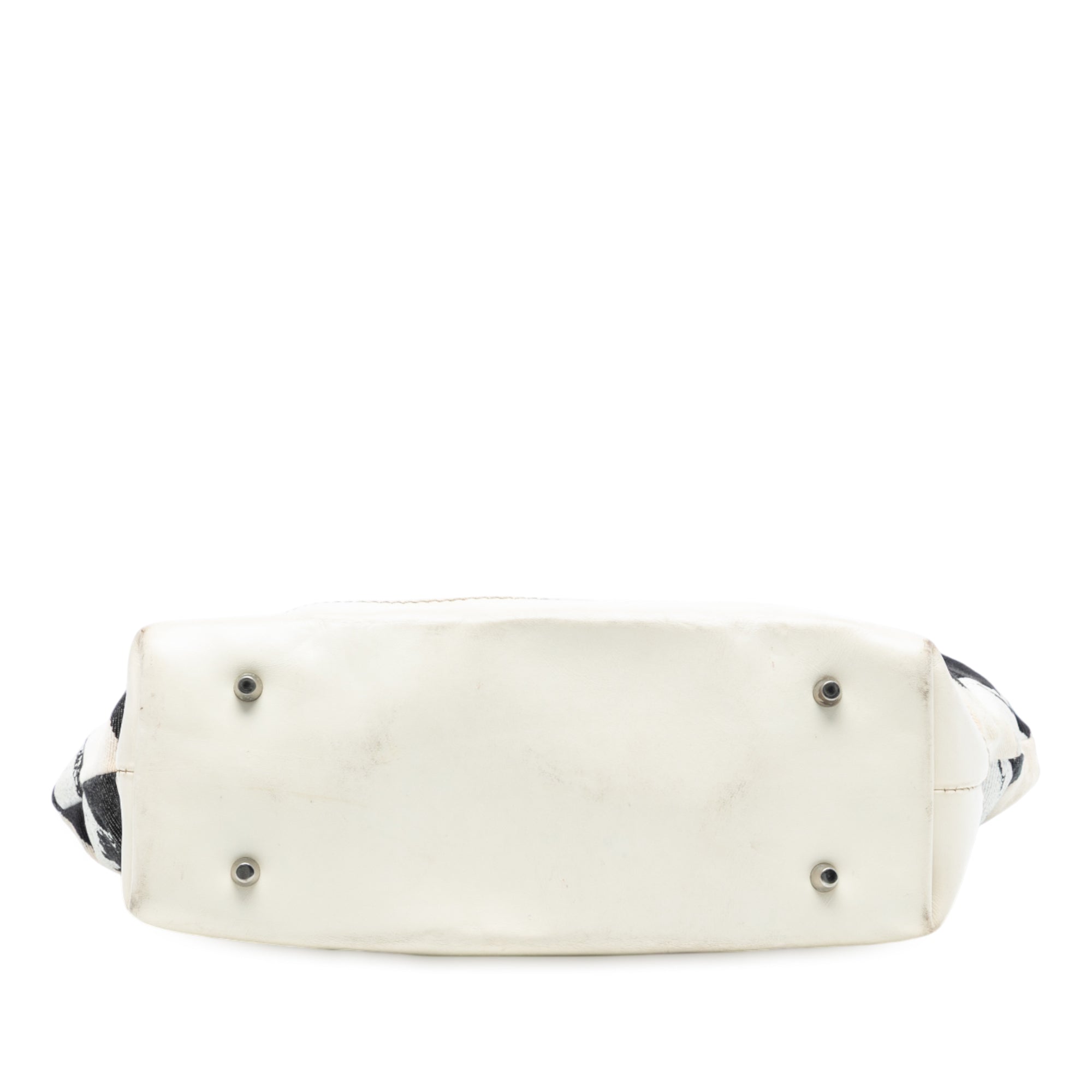 This tote bag features a painted supernova check canvas body with leather trim, rolled leather handles, an open top with magnetic snap closure, and an interior zip pocket. Retail Price: 890.00
