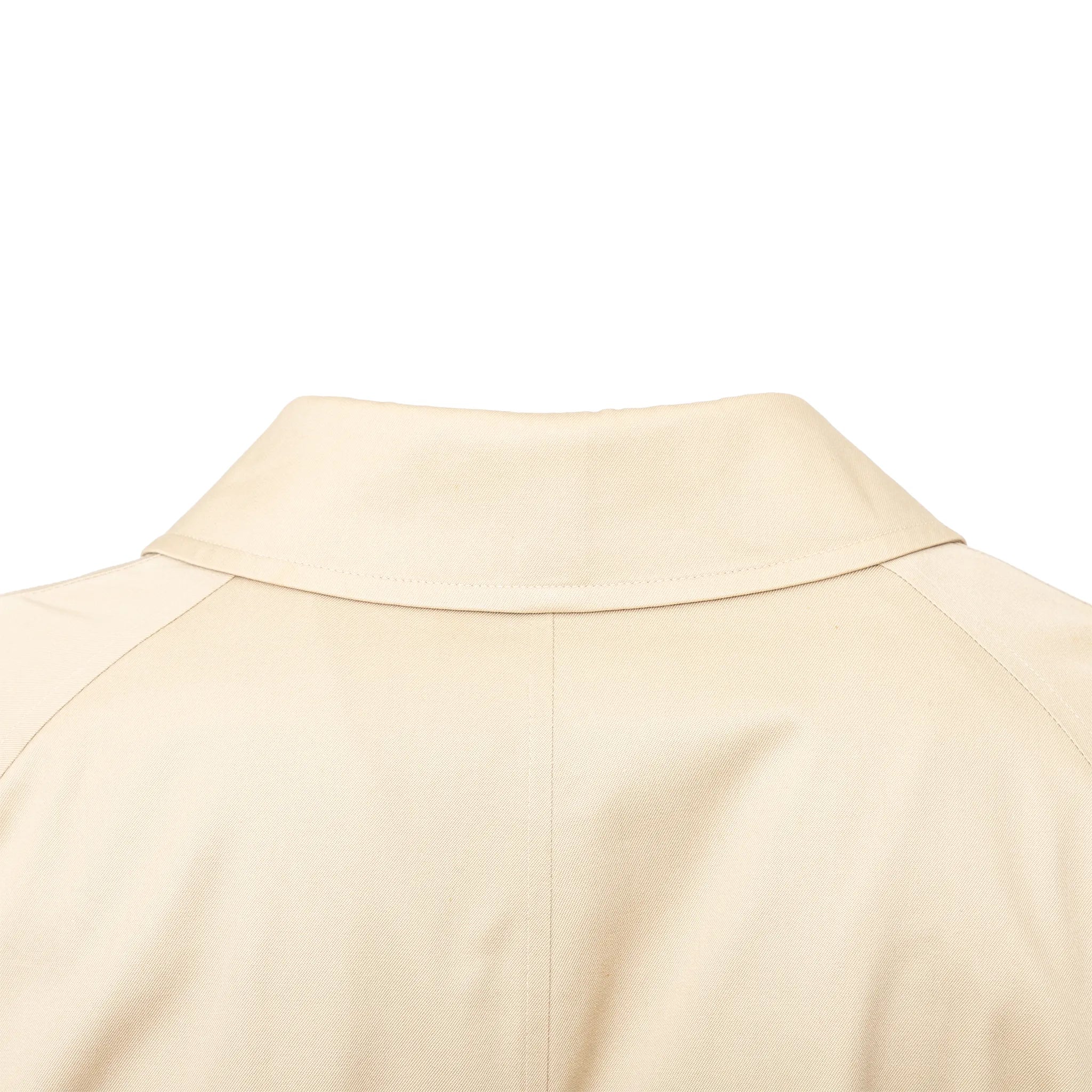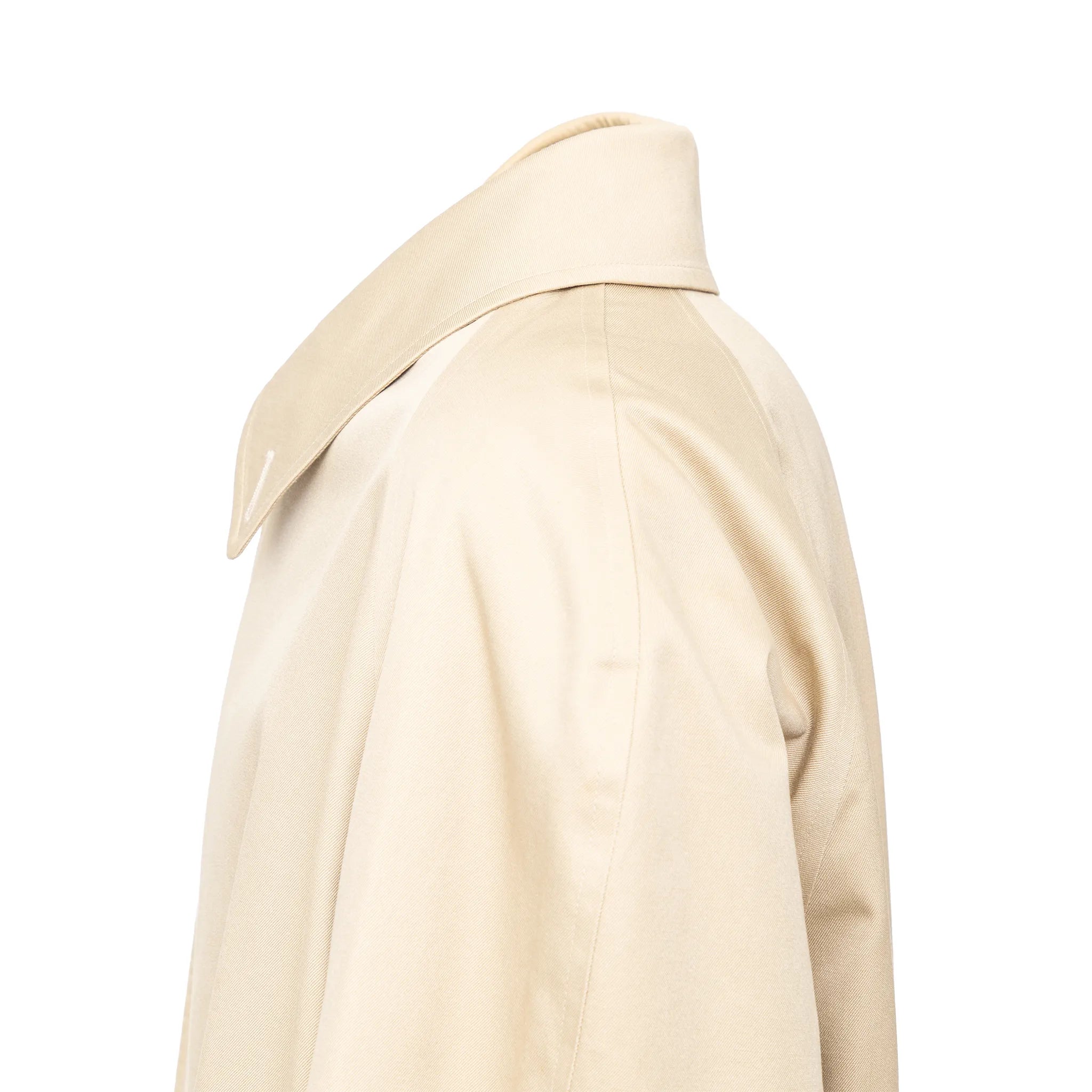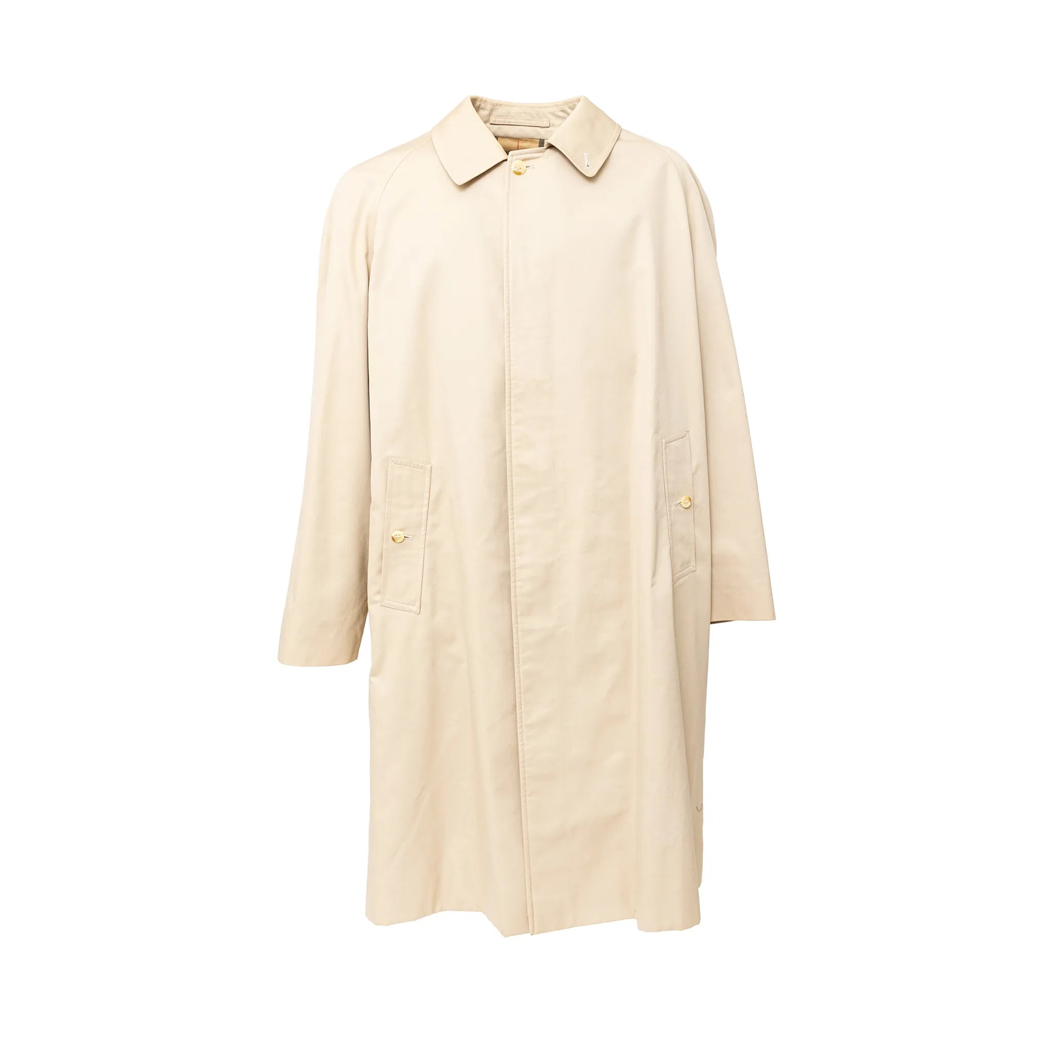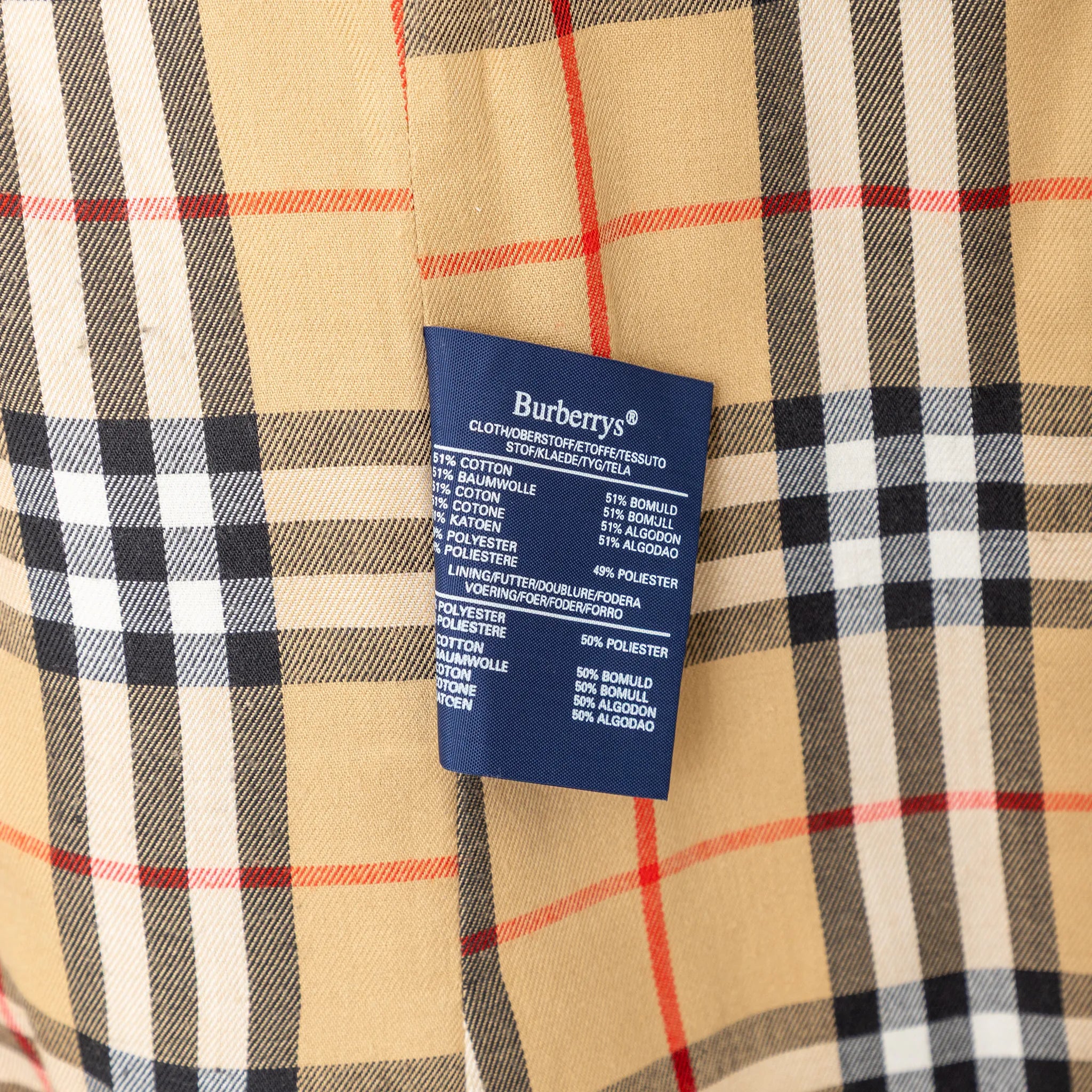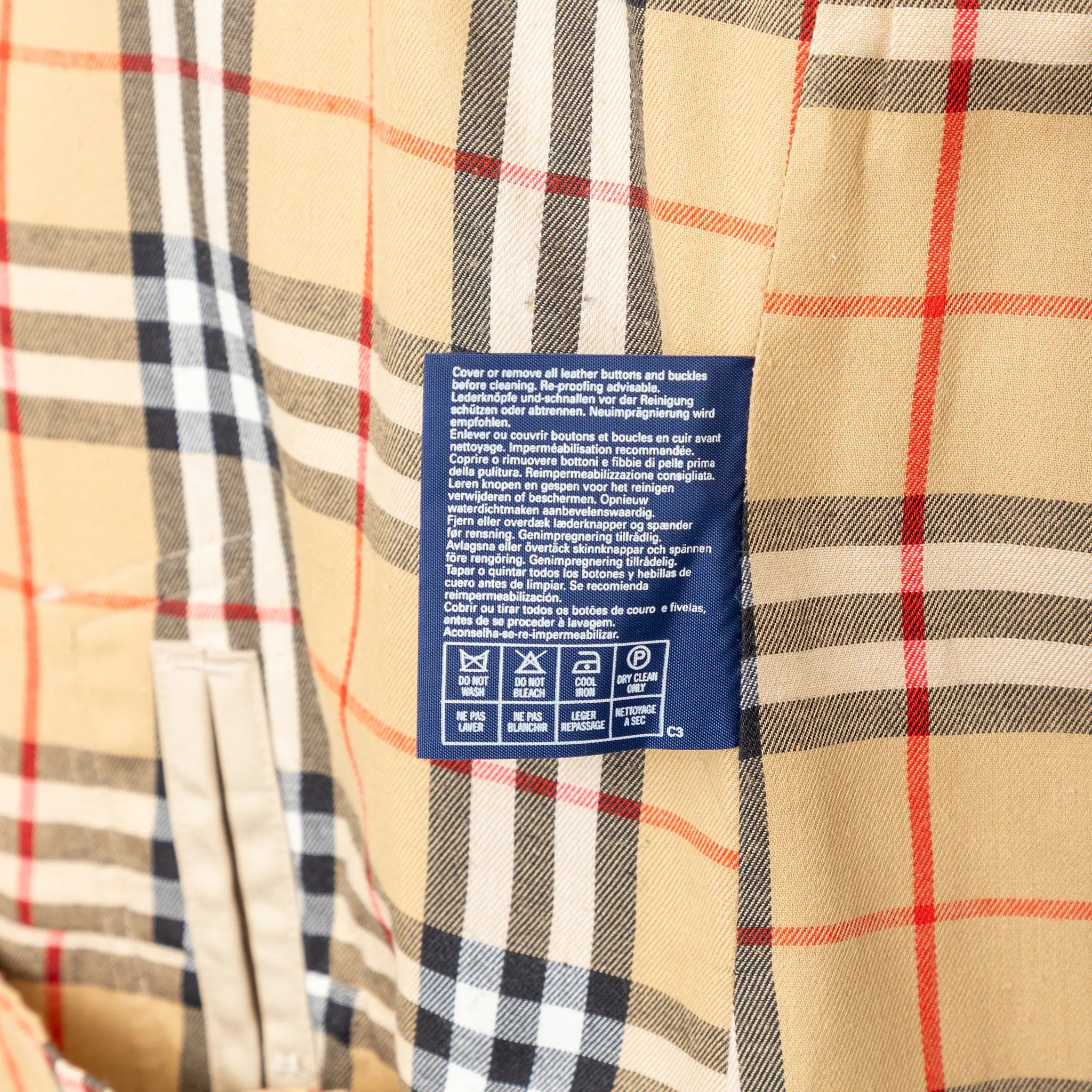 Burberry trench coat with relaxed raglan shoulders, iconic checkered lining, slanted pockets, and a hidden button stand. A signature outerwear essential.