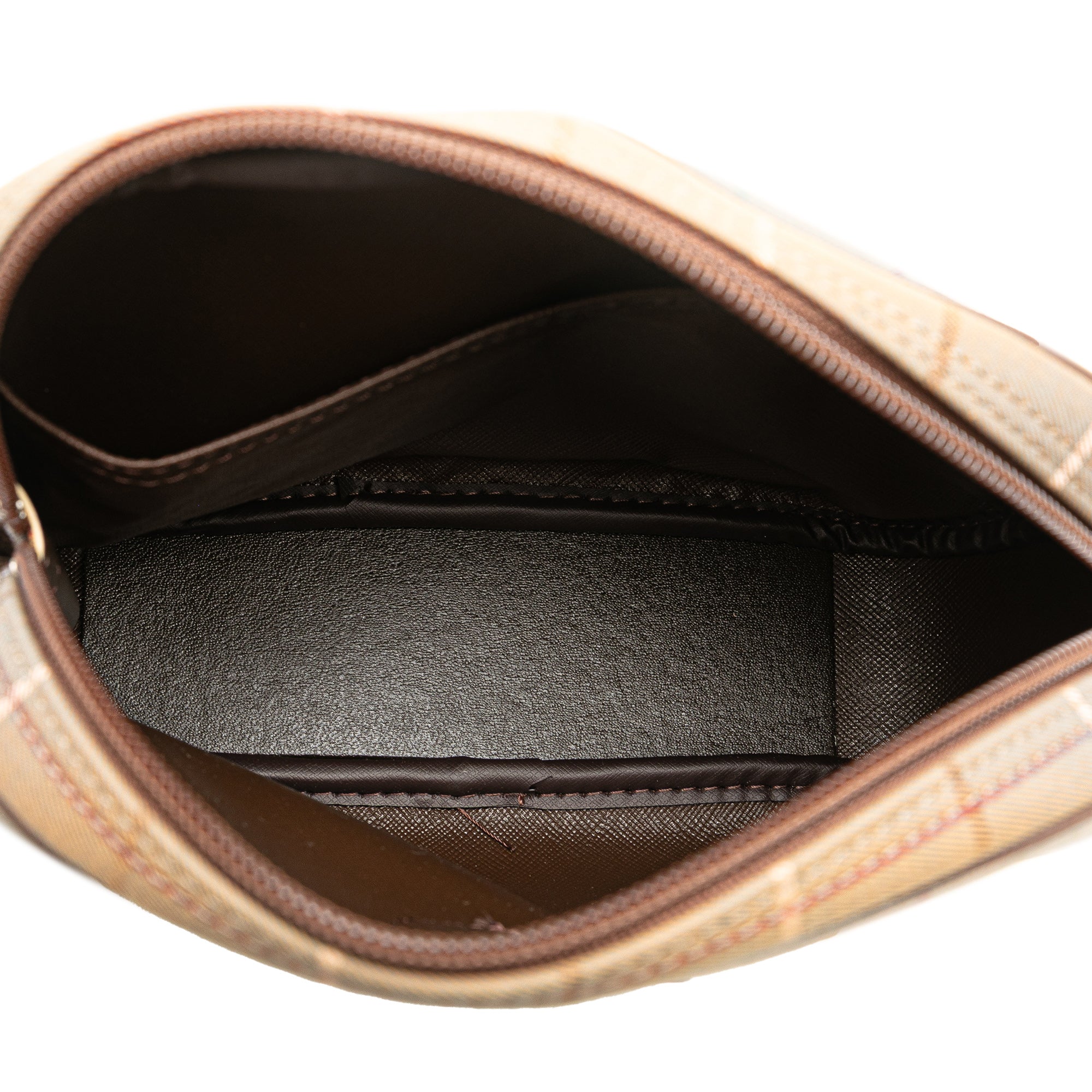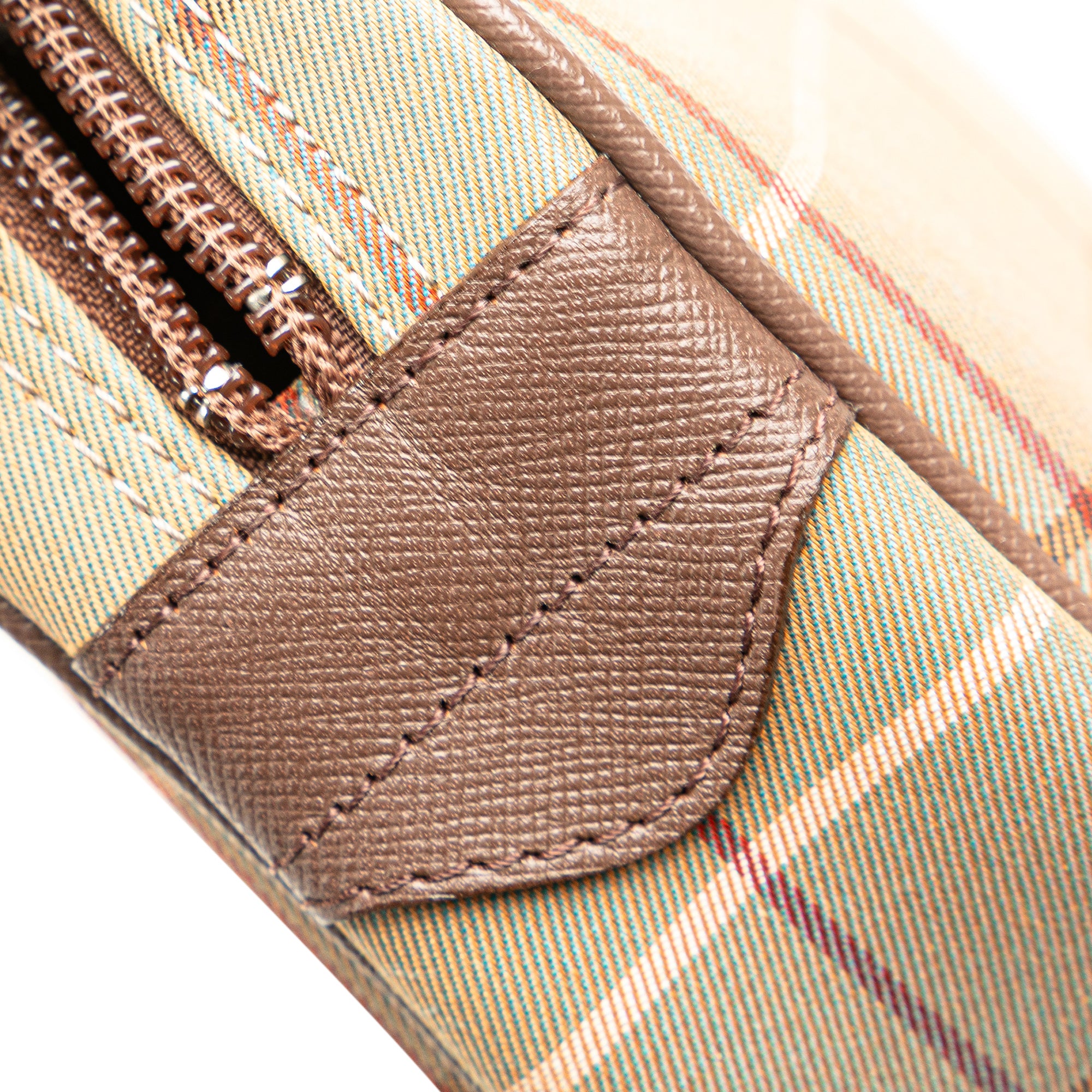 This clutch bag features a canvas body with leather trim, a top zip closure, and an interior slip pocket. Retail Price: 425.00