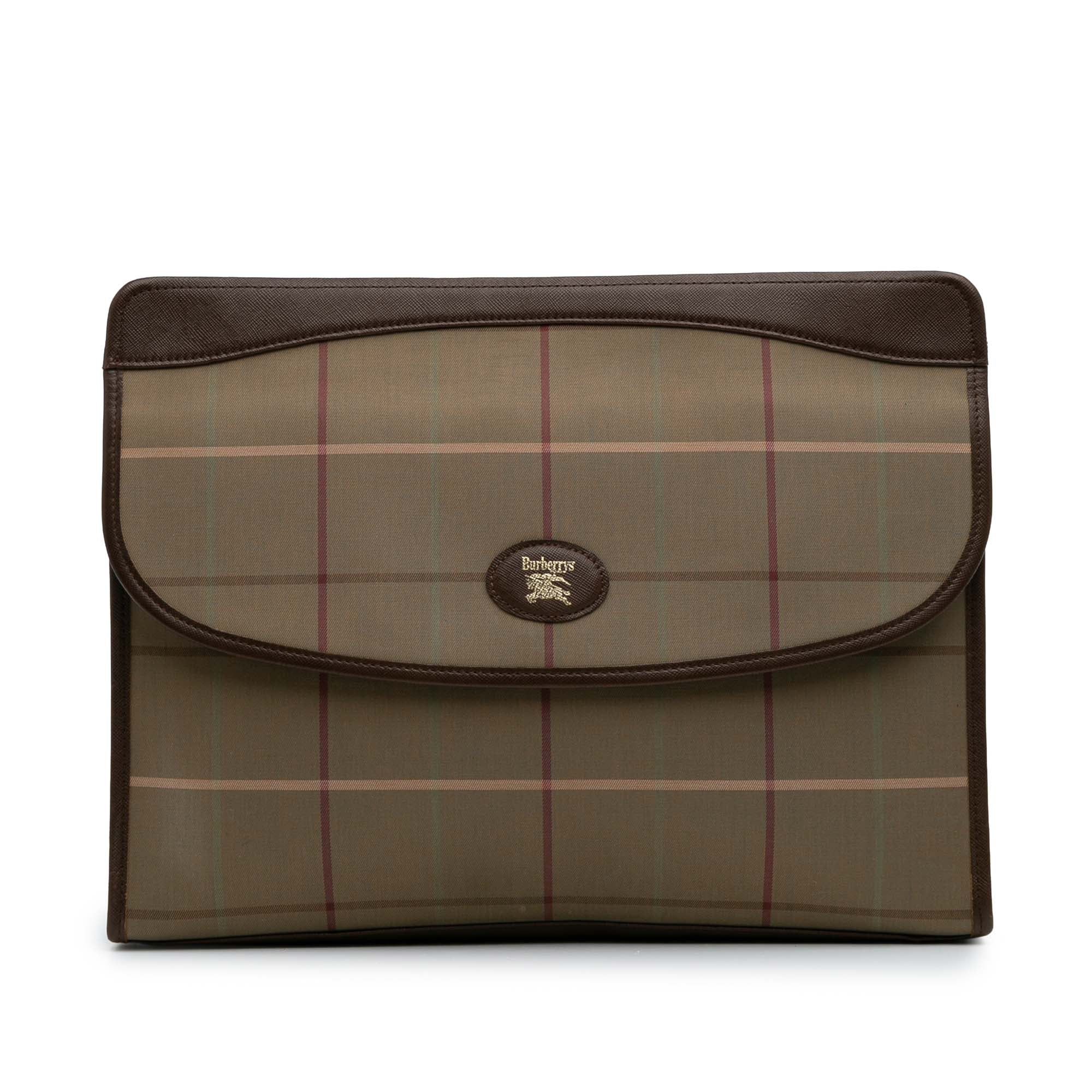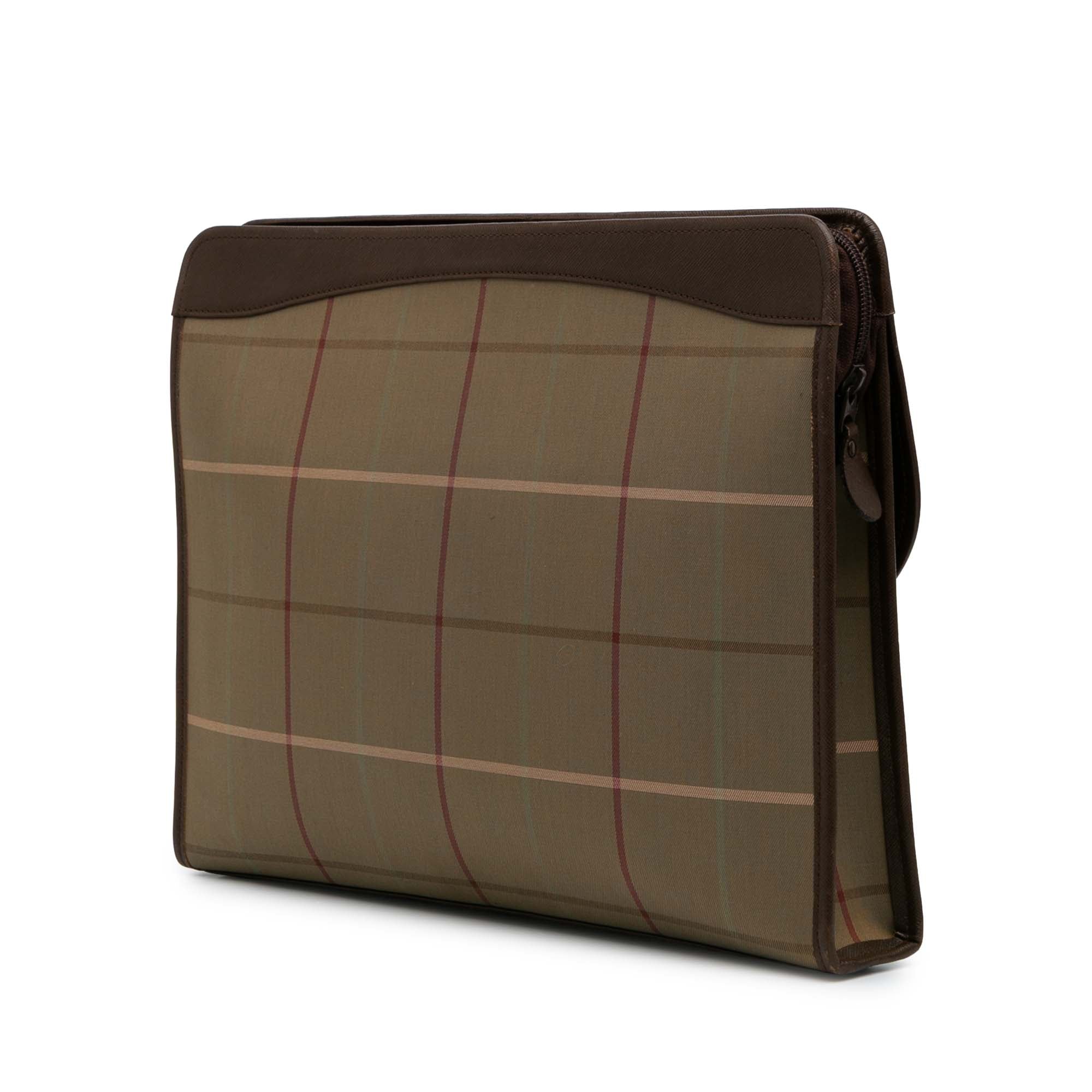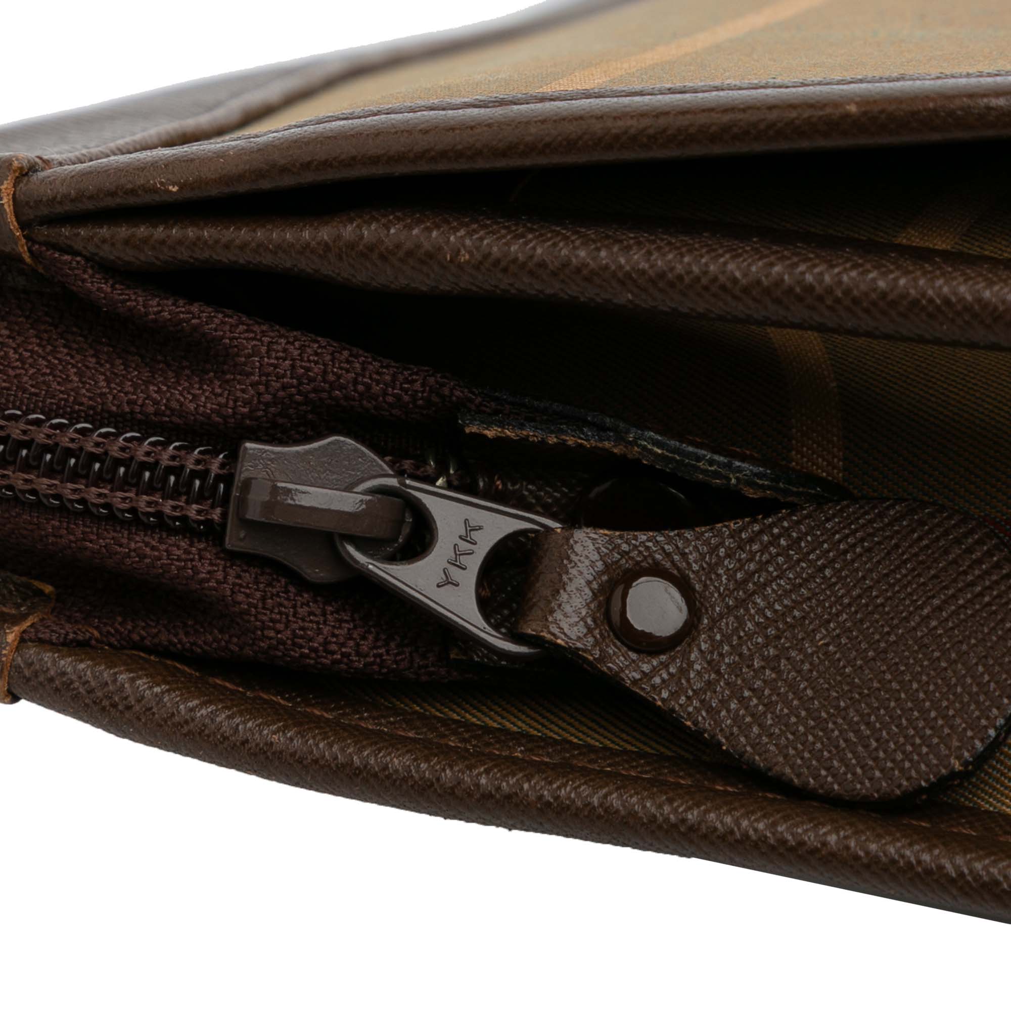 This clutch features a nylon body with leather trim, a top zip closure, an exterior flap pocket with magnetic snap button closure, and interior slip pockets. Retail Price: 500.00