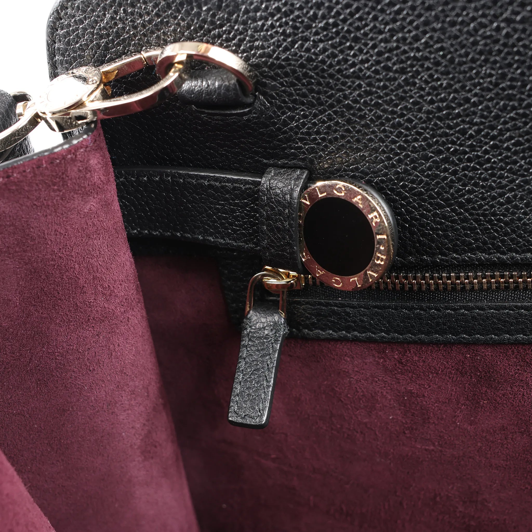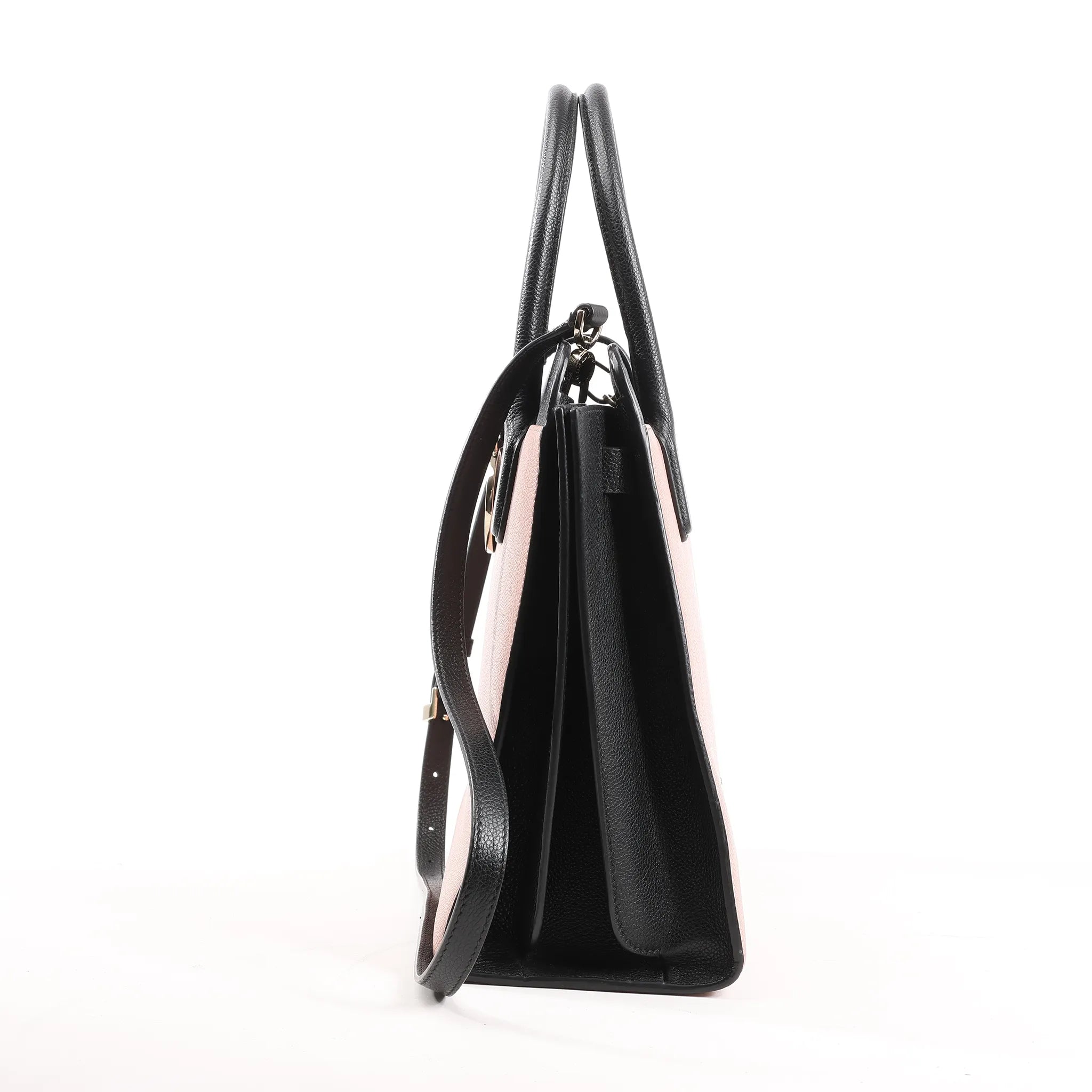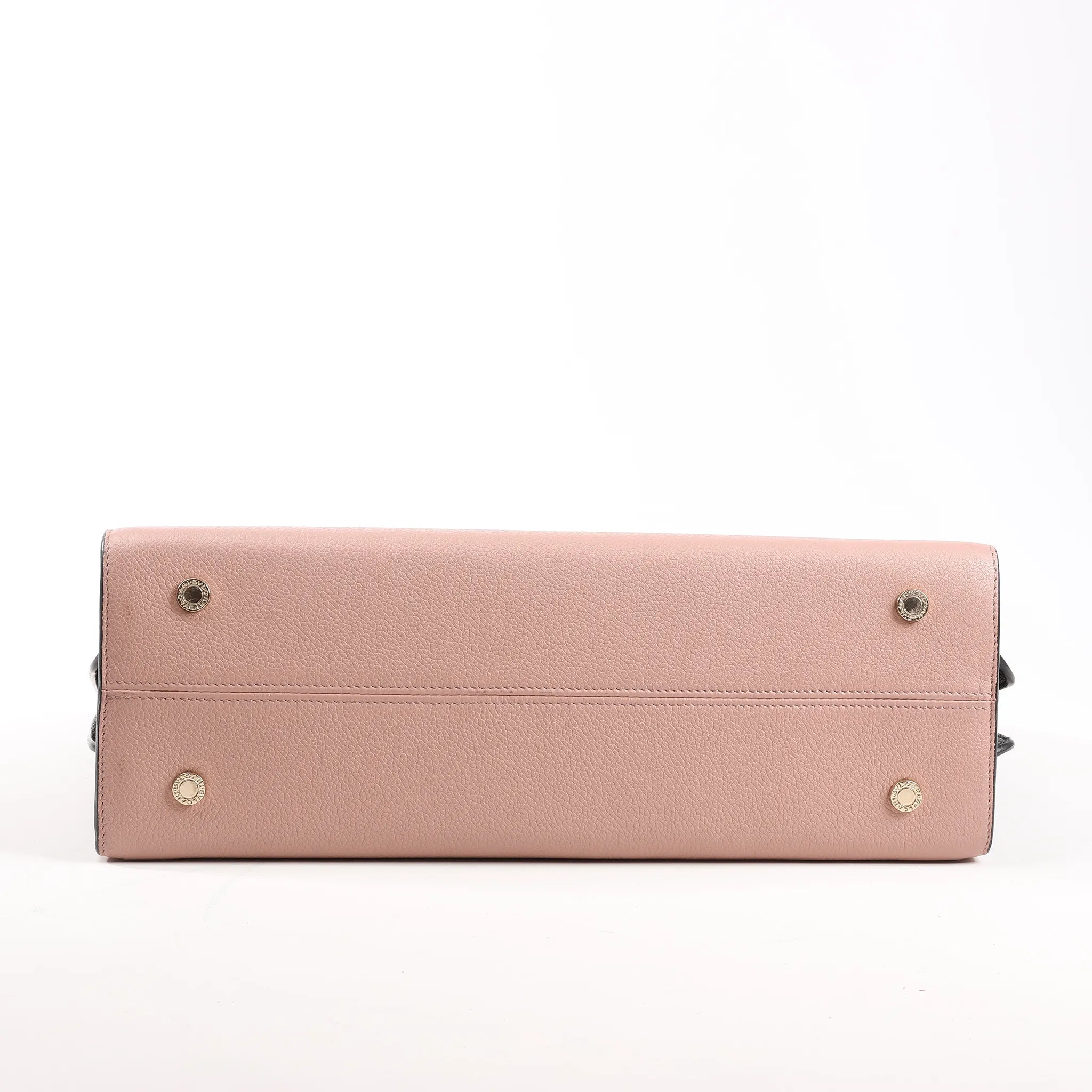 The BVLGARI Alba 2Way Handbag in Pink and Black leather exudes modern elegance with its structured silhouette and signature logo medallion. Crafted from fine grained leather, this versatile piece offers both top-handle sophistication and crossbody ease.