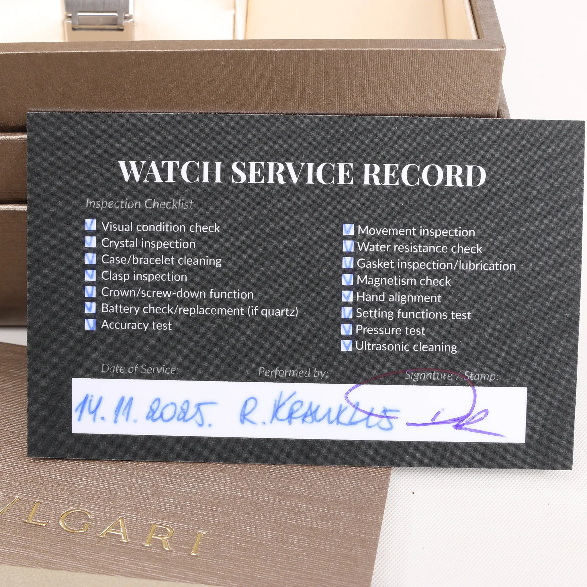 Brand: BvlgariModel: BulgariReference: BB23SSeial No.: BU2KKIB Condition: ExcellentCondition Details: Light signs of use, including subtle surface marks barely visible to the eye. Please see photos for the exact condition.Dial Colour: SilverDial Material: Stainless steel Starp Colour: SilverStrap material: Stainless steelMovement: QuartzFace Diameter: 23 mm Approx. circumference: 18 cmComes With: Brand bag, Box, Case, Papers, Certificate, Extra links, Service card, Ribbon