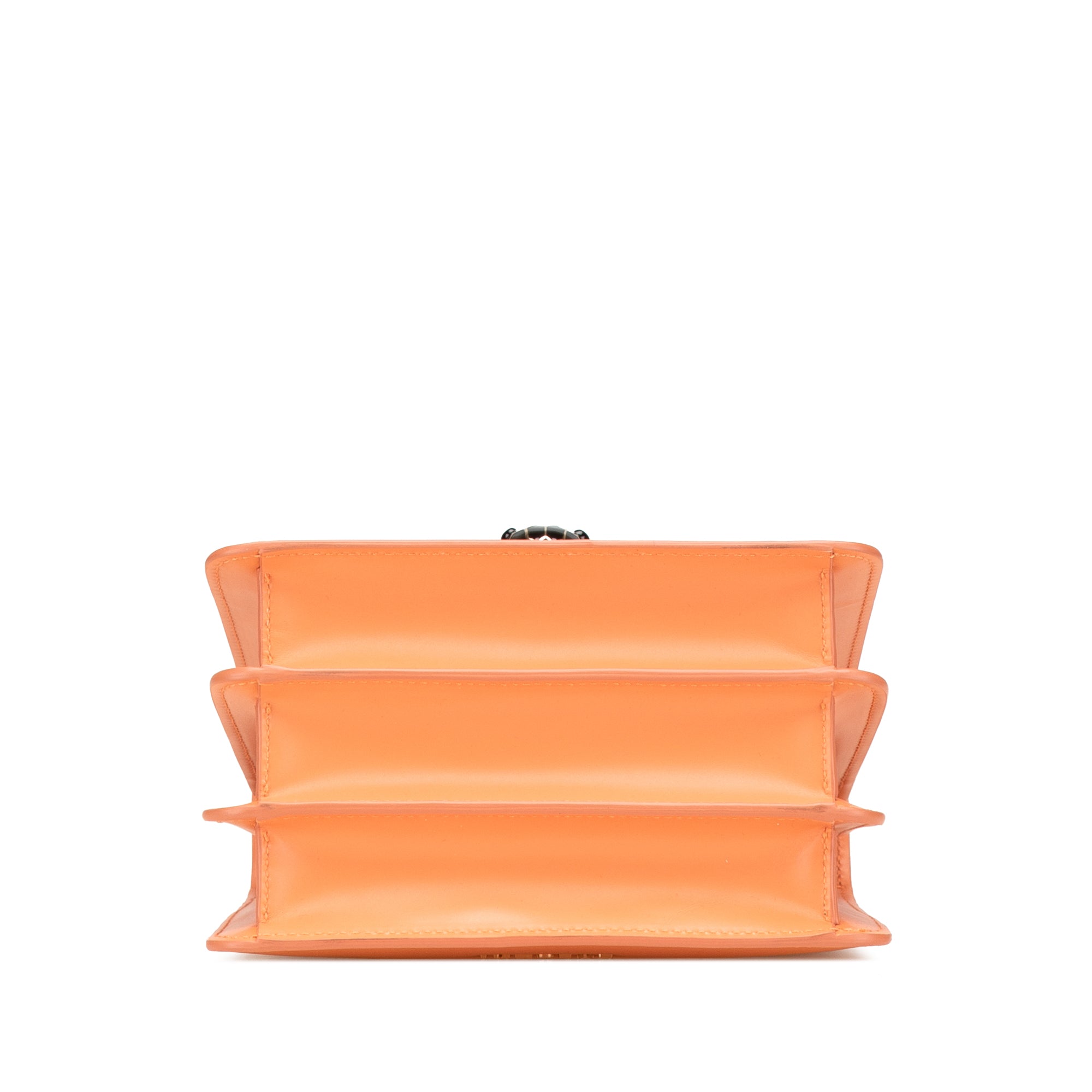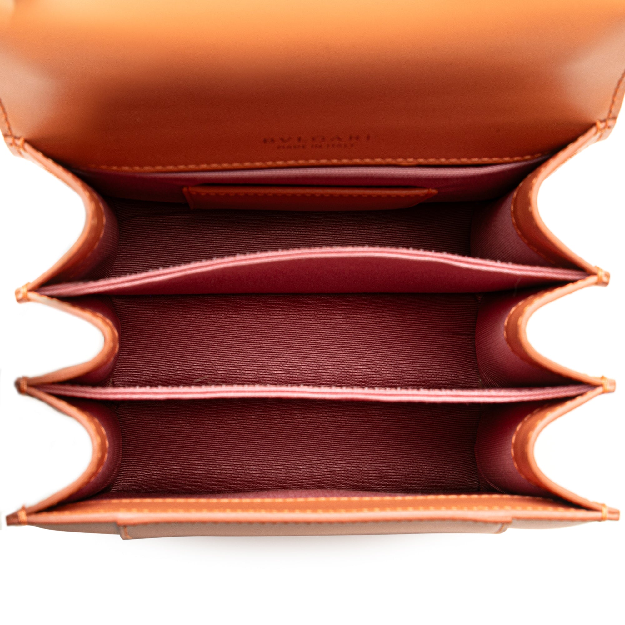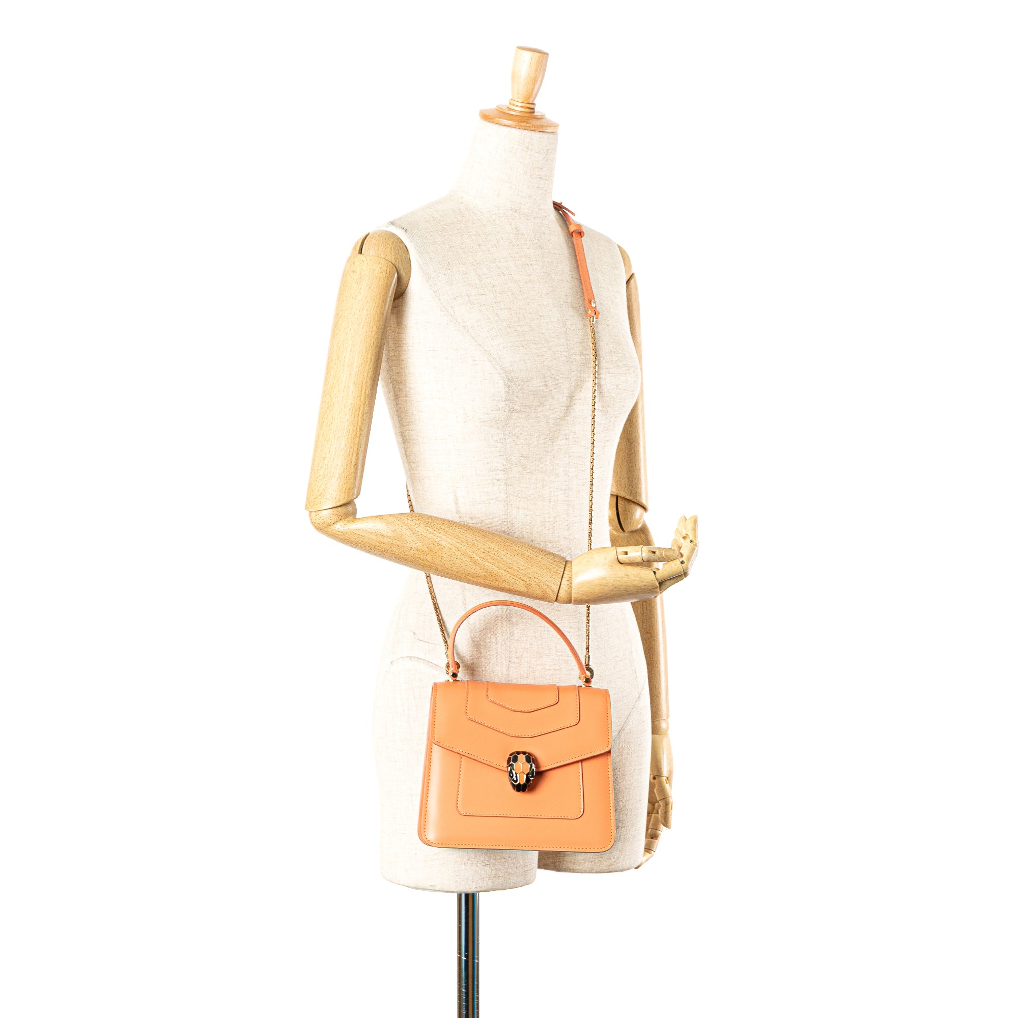 The Serpenti satchel features a leather body, a flat top handle, a detachable gold-tone chain strap, a front flap with snap closure and serpenti adornment, and an interior slip pocket. Inclusion: Dust bag, authenticity card. Retail Price: 2400.00