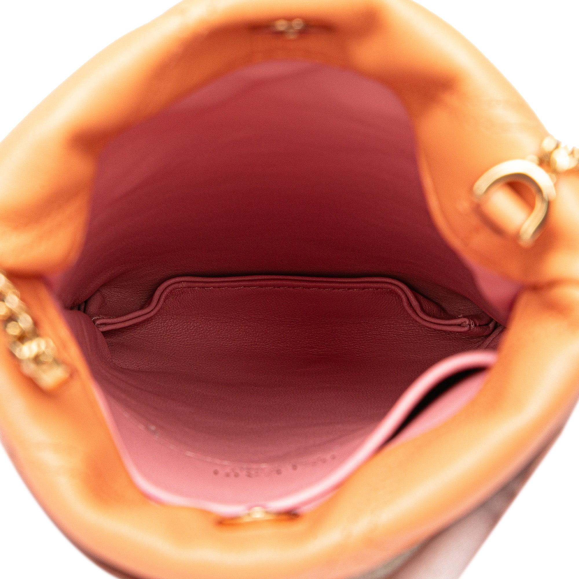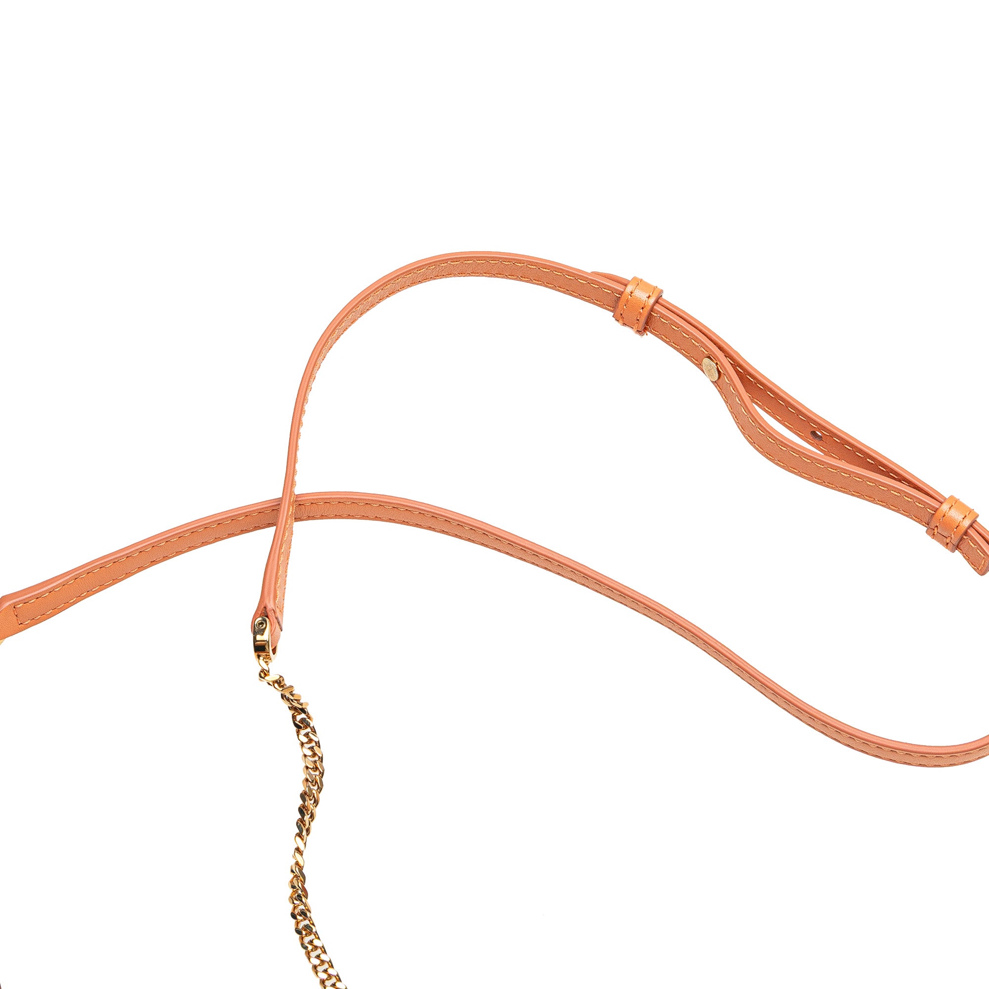 This crossbody bag features a leather body, a chain link and adjustable leather strap, an open top with snap closure, an exterior back slip pocket, and an interior slip pocket. Retail Price: 1150.00