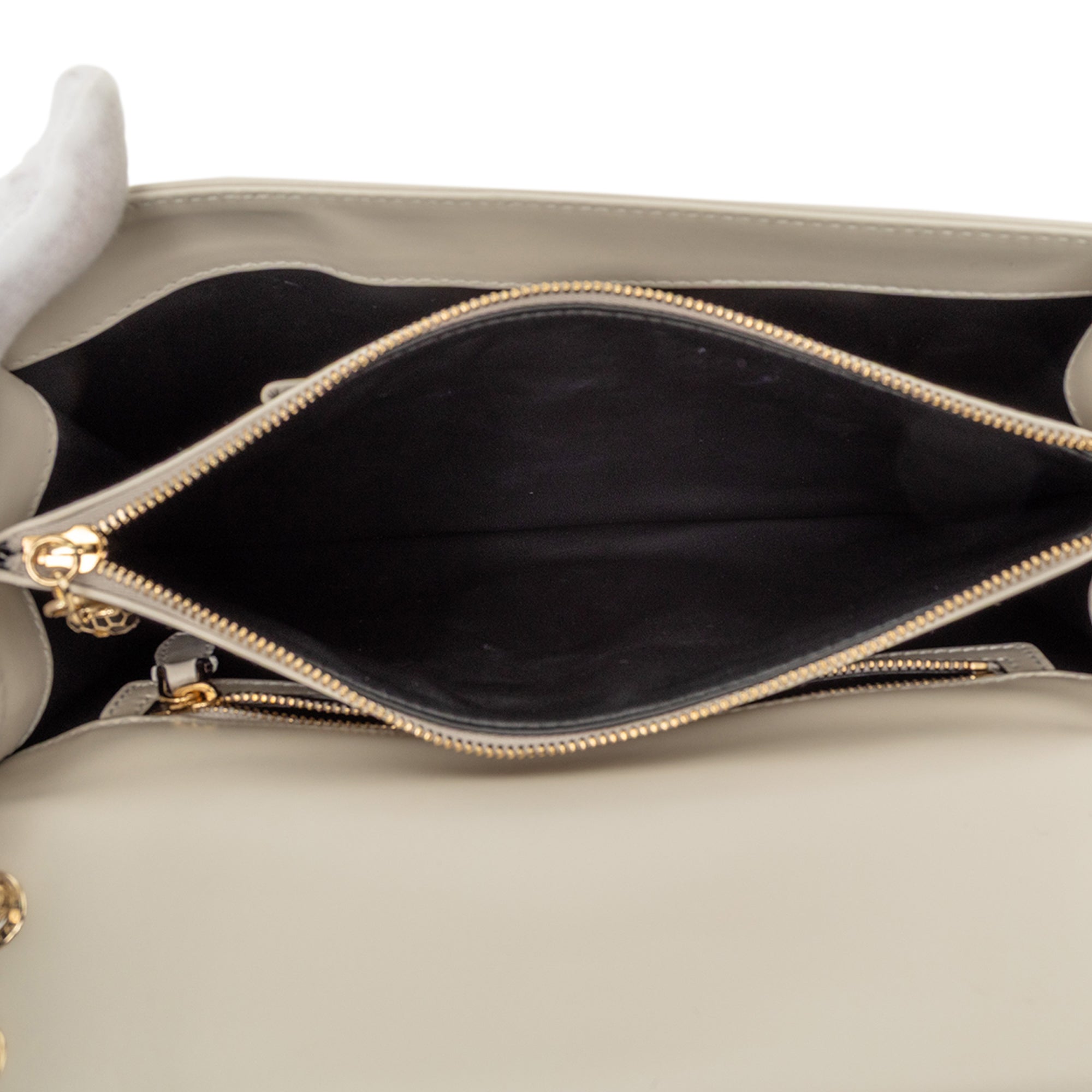 The Serpenti Forever shoulder bag features a leather body with floral embellishment, chain link shoulder straps, a front flap with magnetic snap closure and serpenti adornment, interior center zip compartment, and interior zip and slip pockets. Inclusion: Dust bag. Retail Price: 2600.00