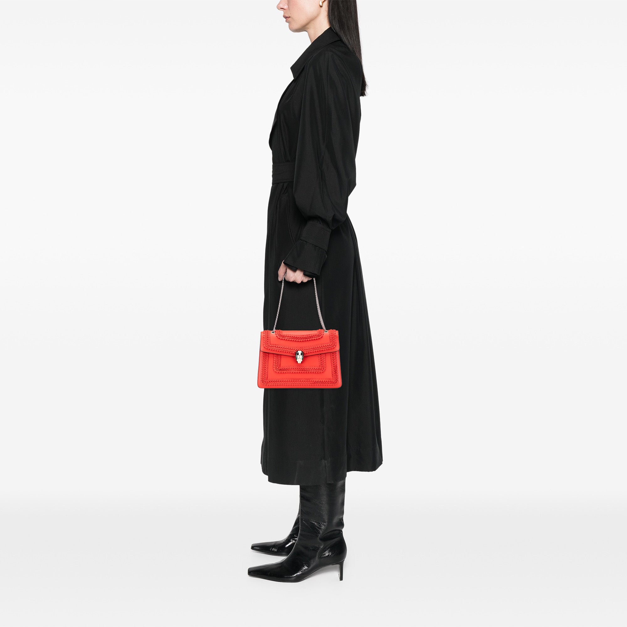 The Serpenti Forever shoulder bag features a leather body, a silver-tone chain link shoulder strap, a front flap with magnetic snap closure and serpenti adornment, an interior zip compartment, and interior zip and slip pockets. Retail Price: 1700.00