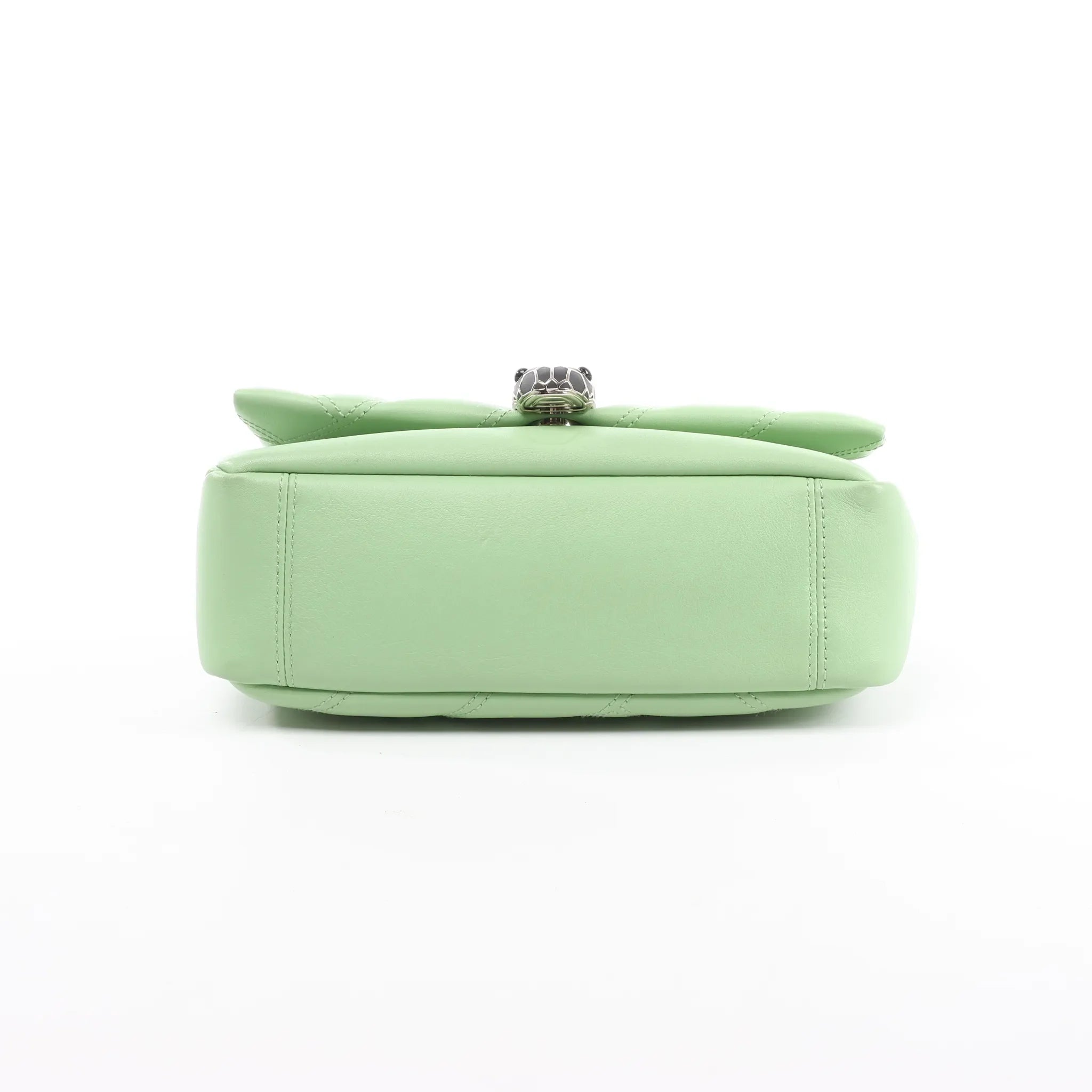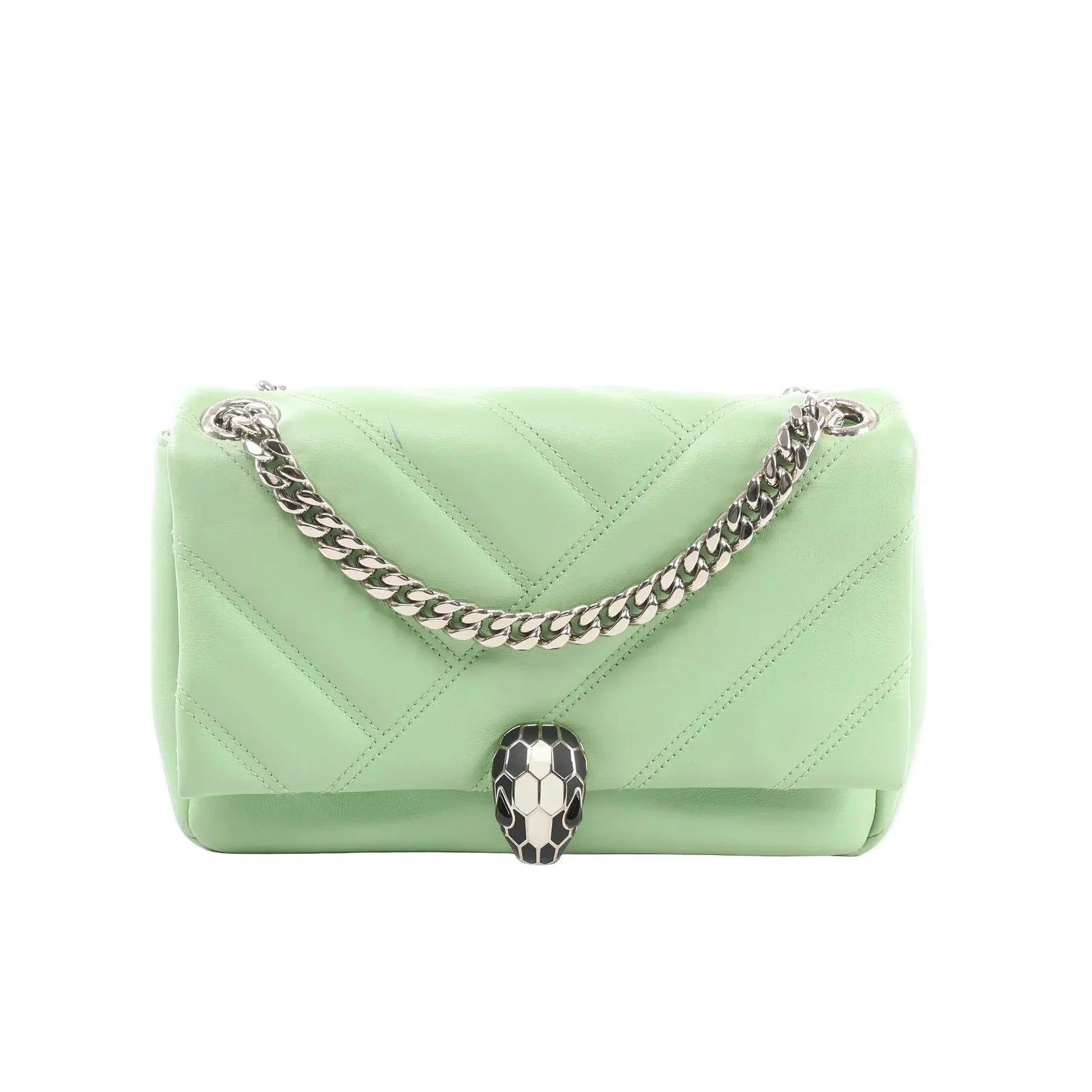 BVLGARI Serpenti Cabochon in green leather—an elegant chain crossbody with chevron quilting and the iconic Serpenti snakehead clasp. A compact, polished piece that adds luxe shine to day-to-night styling.