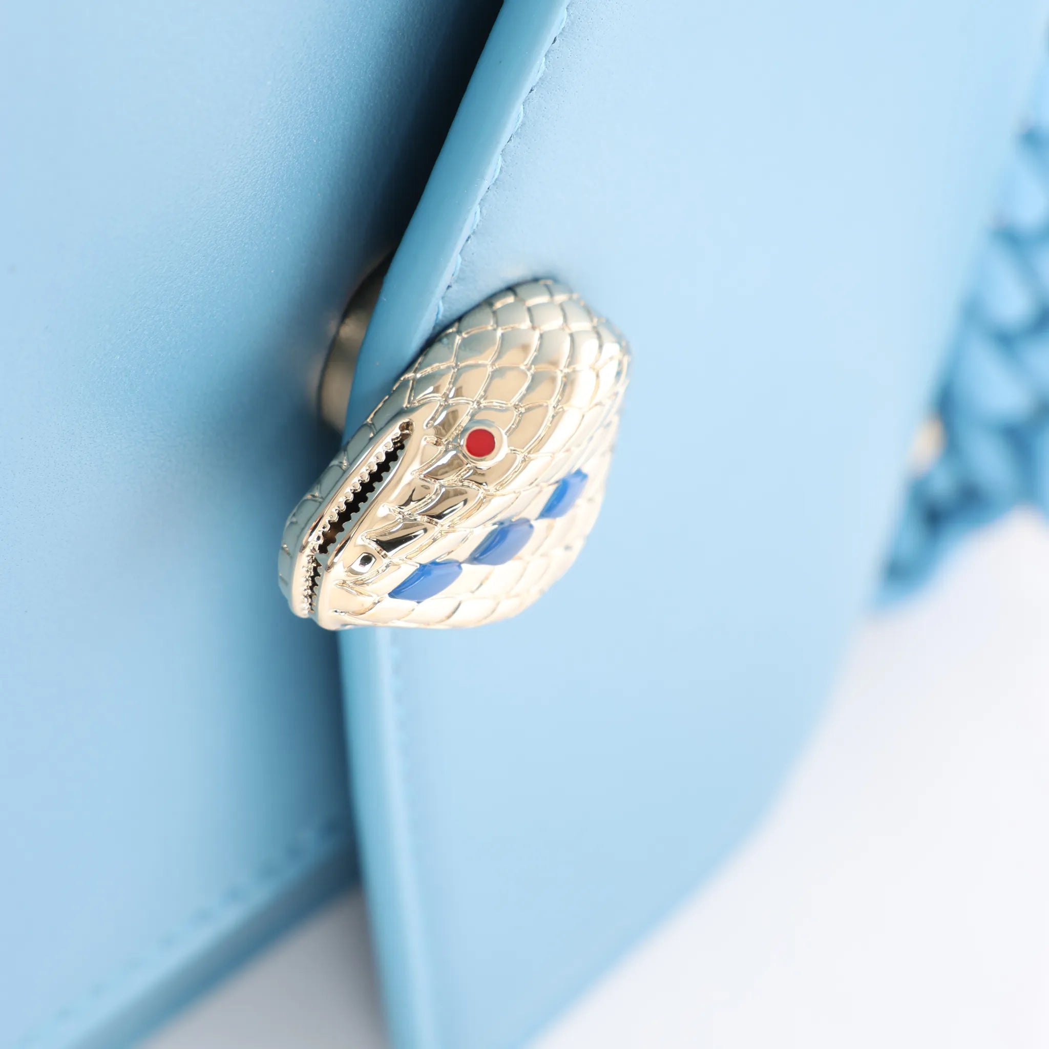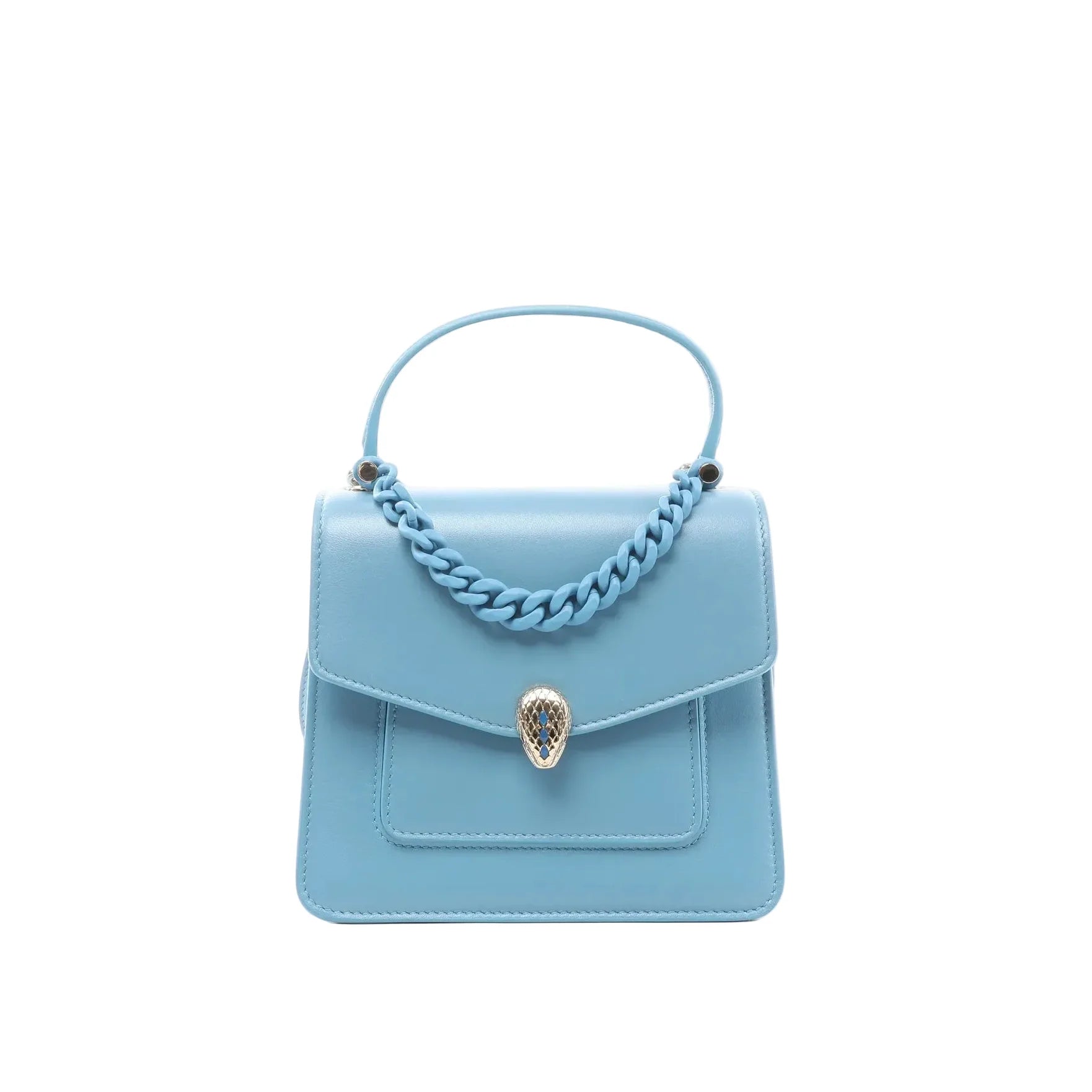 BVLGARI Serpenti Forever in blue leather—a compact 2-way handbag with a sleek top handle, chain detail, and signature Serpenti snakehead clasp. A polished mini silhouette that transitions effortlessly from day plans to evening.