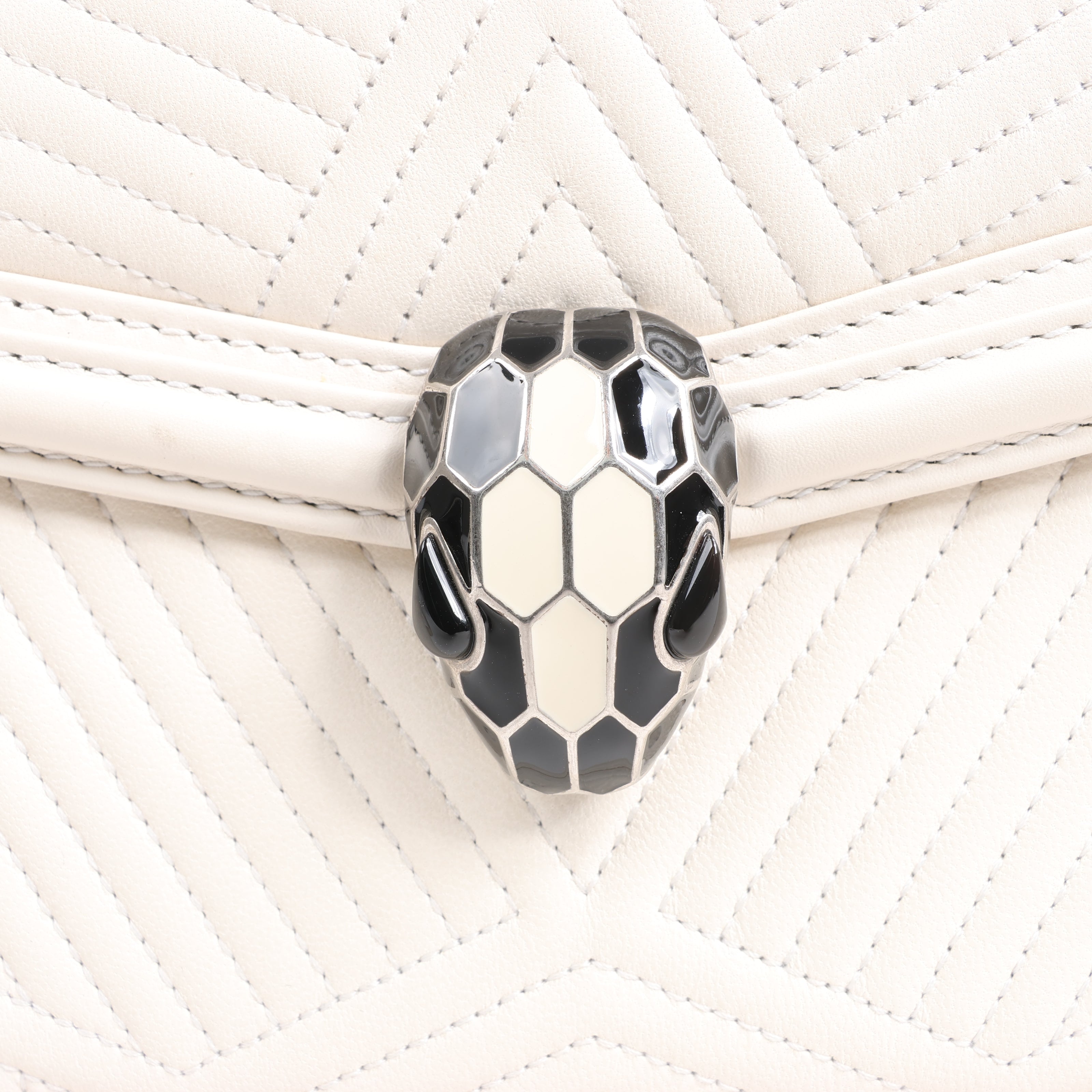 BVLGARI Serpenti Chain Shoulder Bag in rich whiteleather, featuring the iconic enamel serpenthead clasp and gold-tone chain. A striking symbol of glamour and timeless Italian allure.
