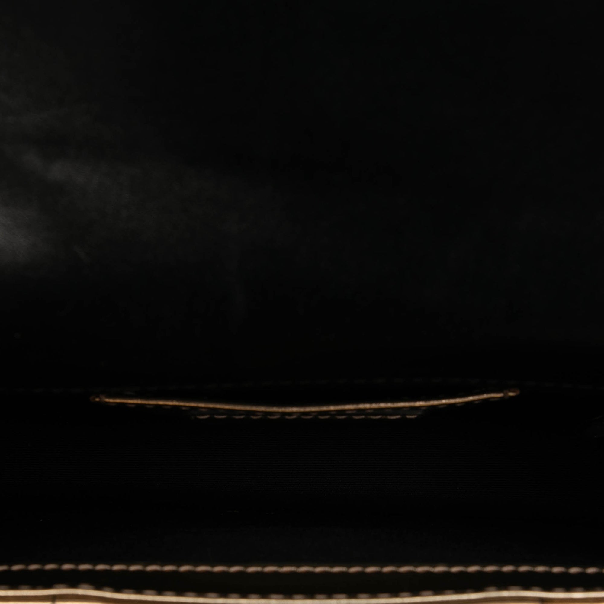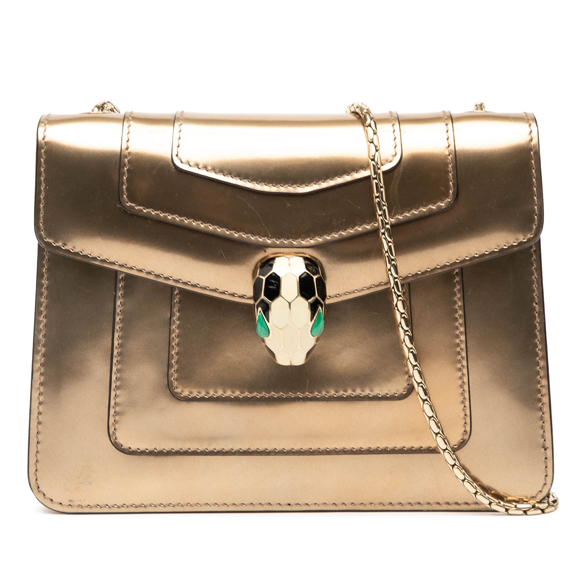 The Serpenti Forever features a patent leather body, a chain link shoulder strap, a front flap with magnetic snap closure, and an interior slip pocket. Retail Price: 3500.00