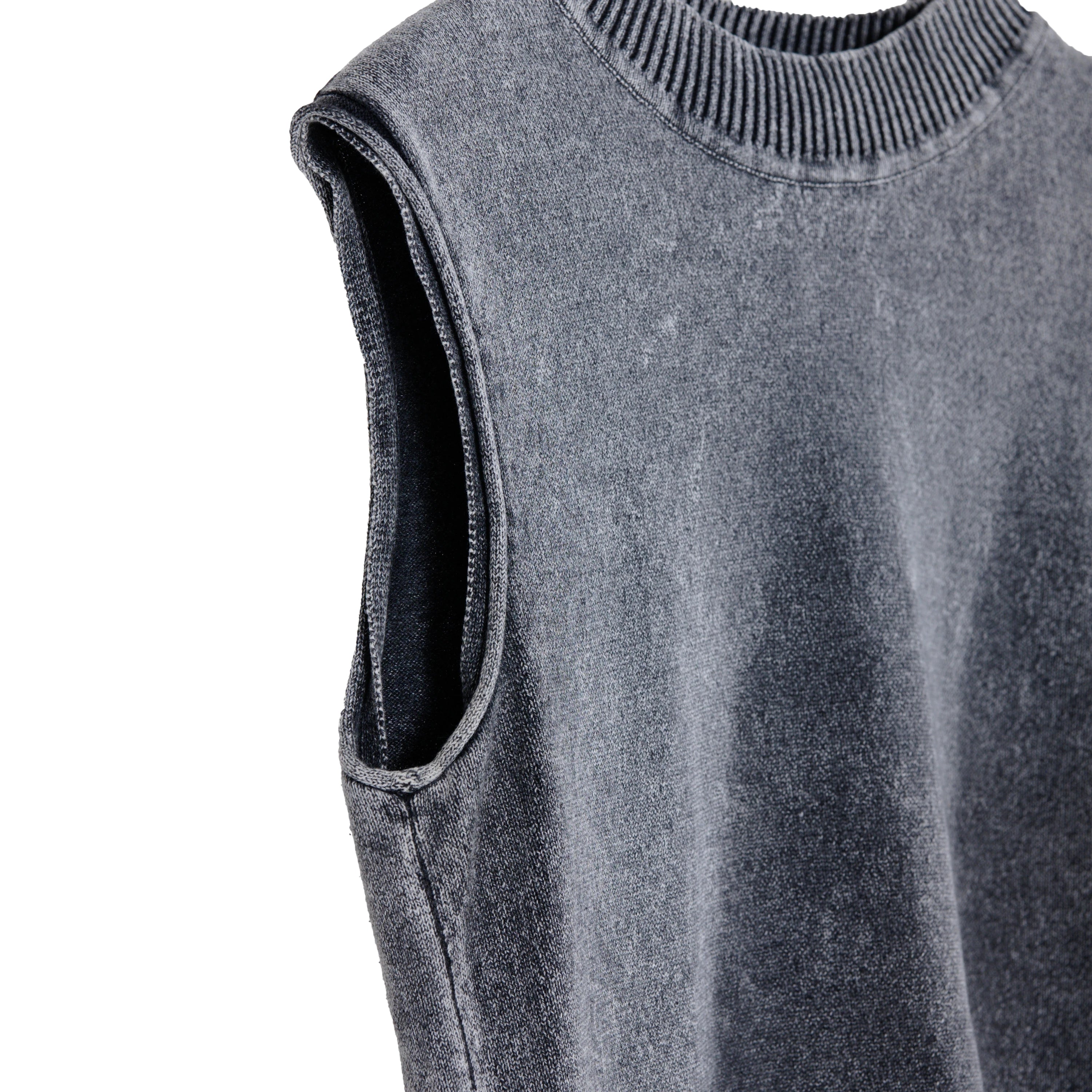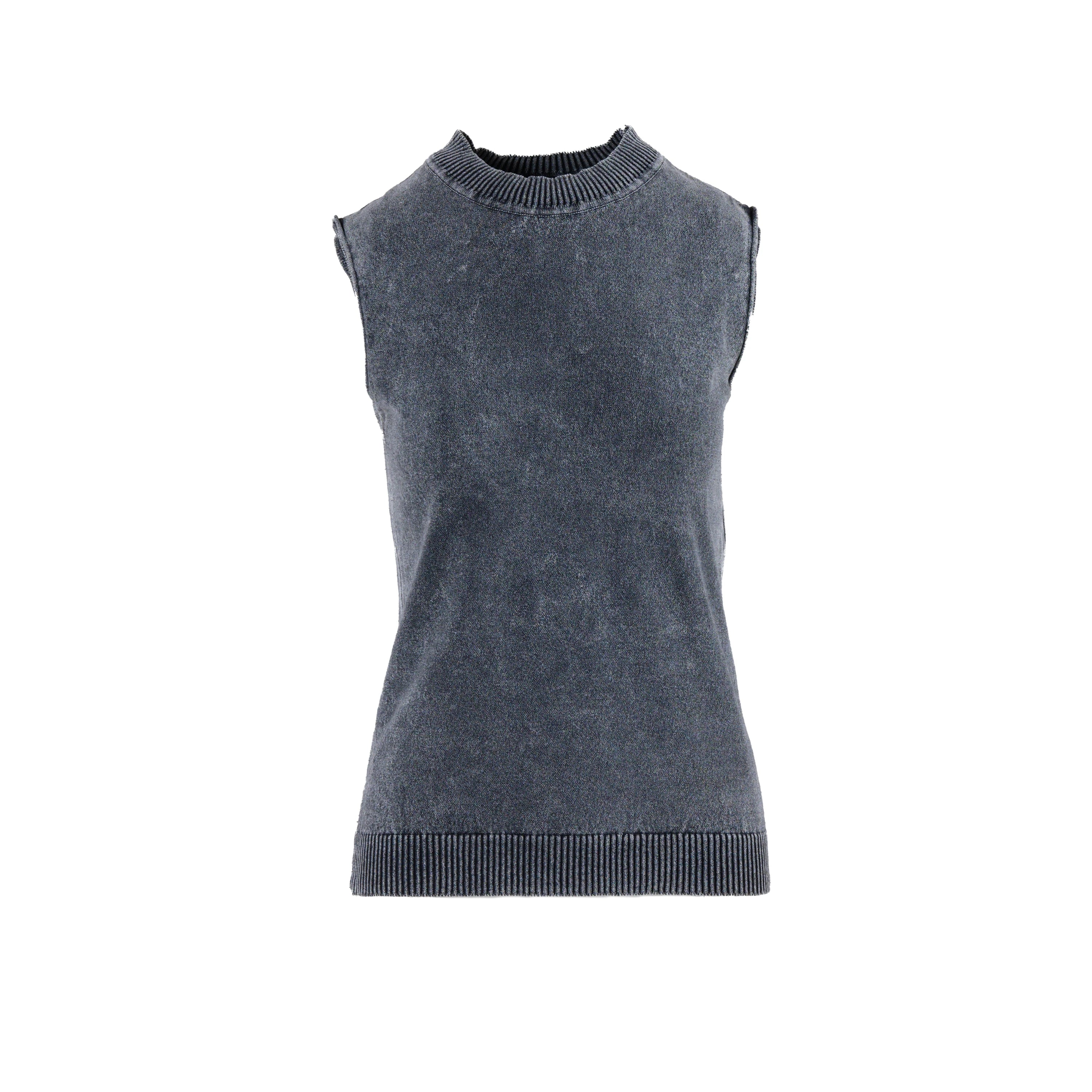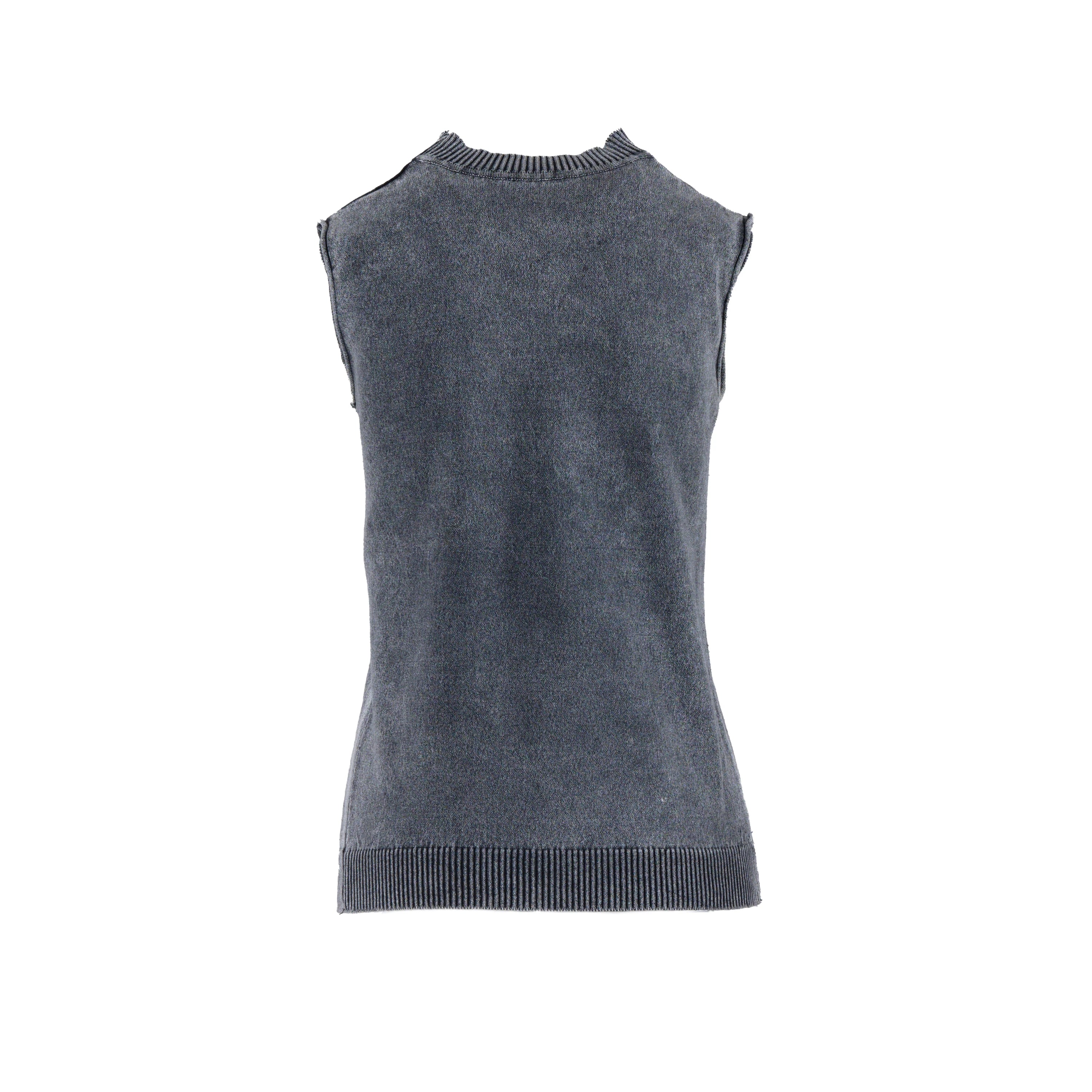 A timeless minimalist piece from Callaghan by Nicolas Ghesquière, crafted from 100% soft cotton. This sleeveless knit top showcases a vintage-wash finish in deep charcoal grey, offering a refined yet lived-in aesthetic. The ribbed neckline, armholes, and hem lend subtle structure while preserving a comfortable, flexible fit.