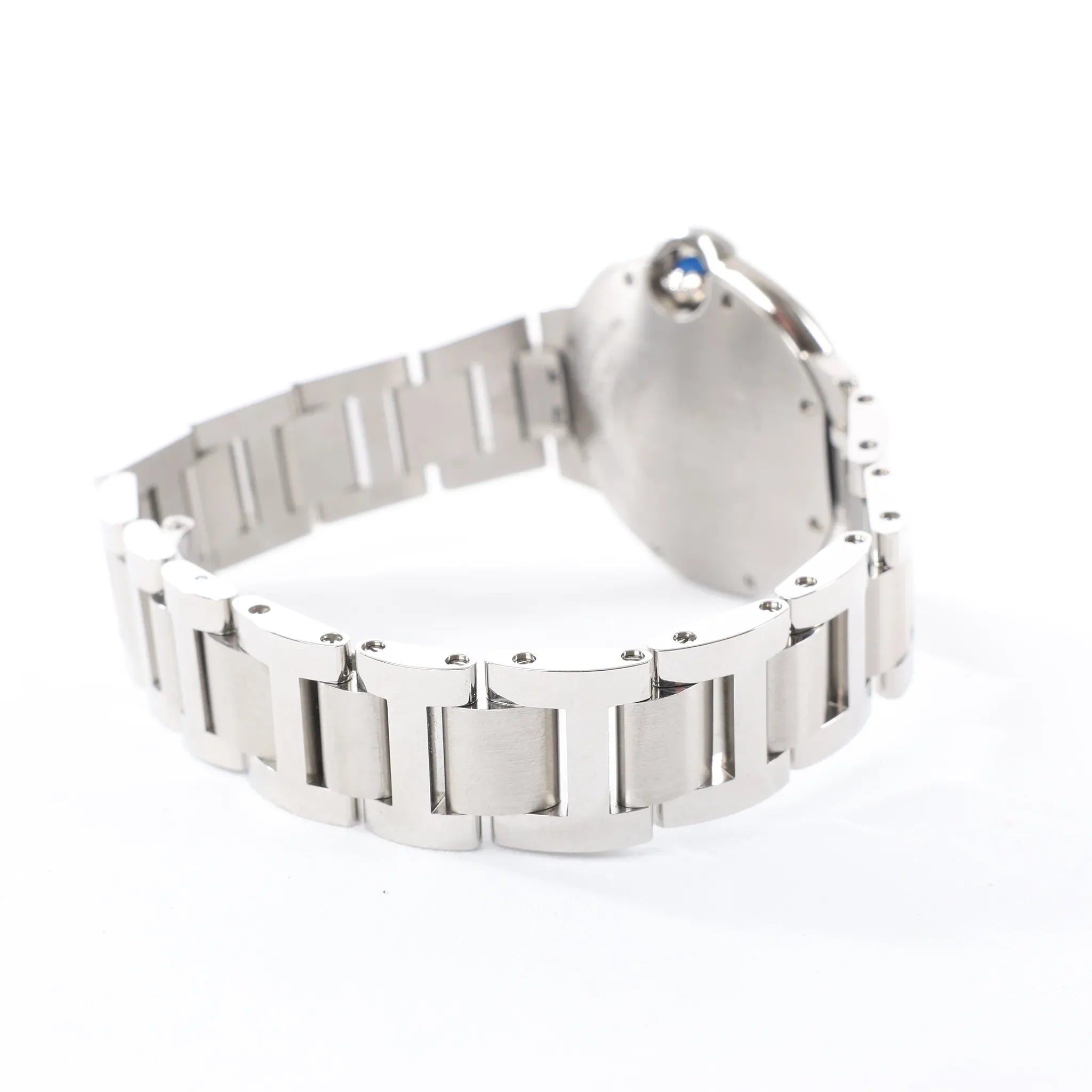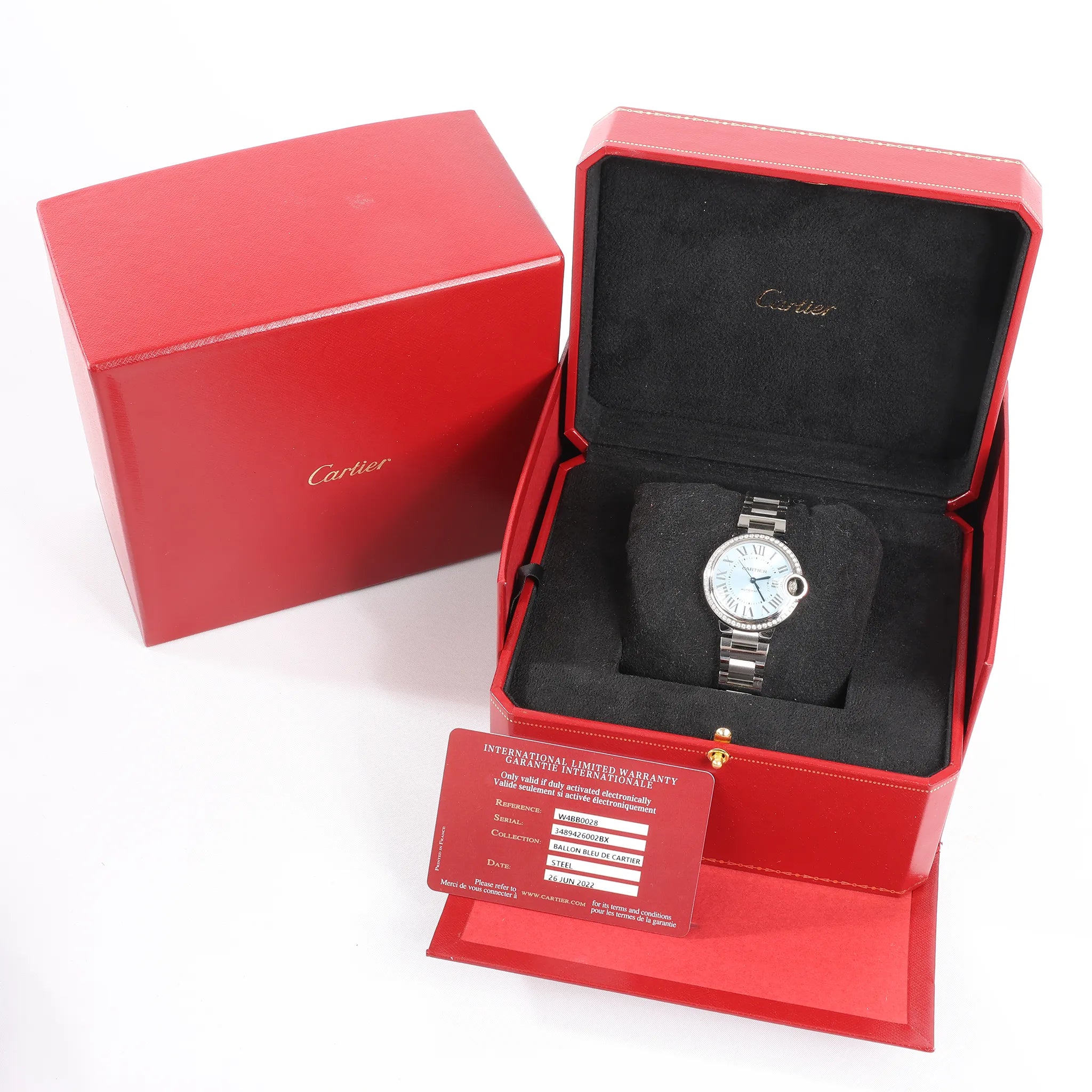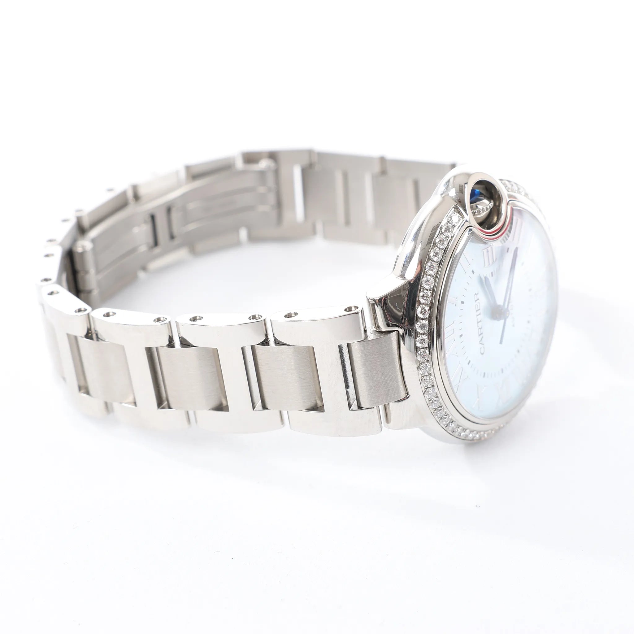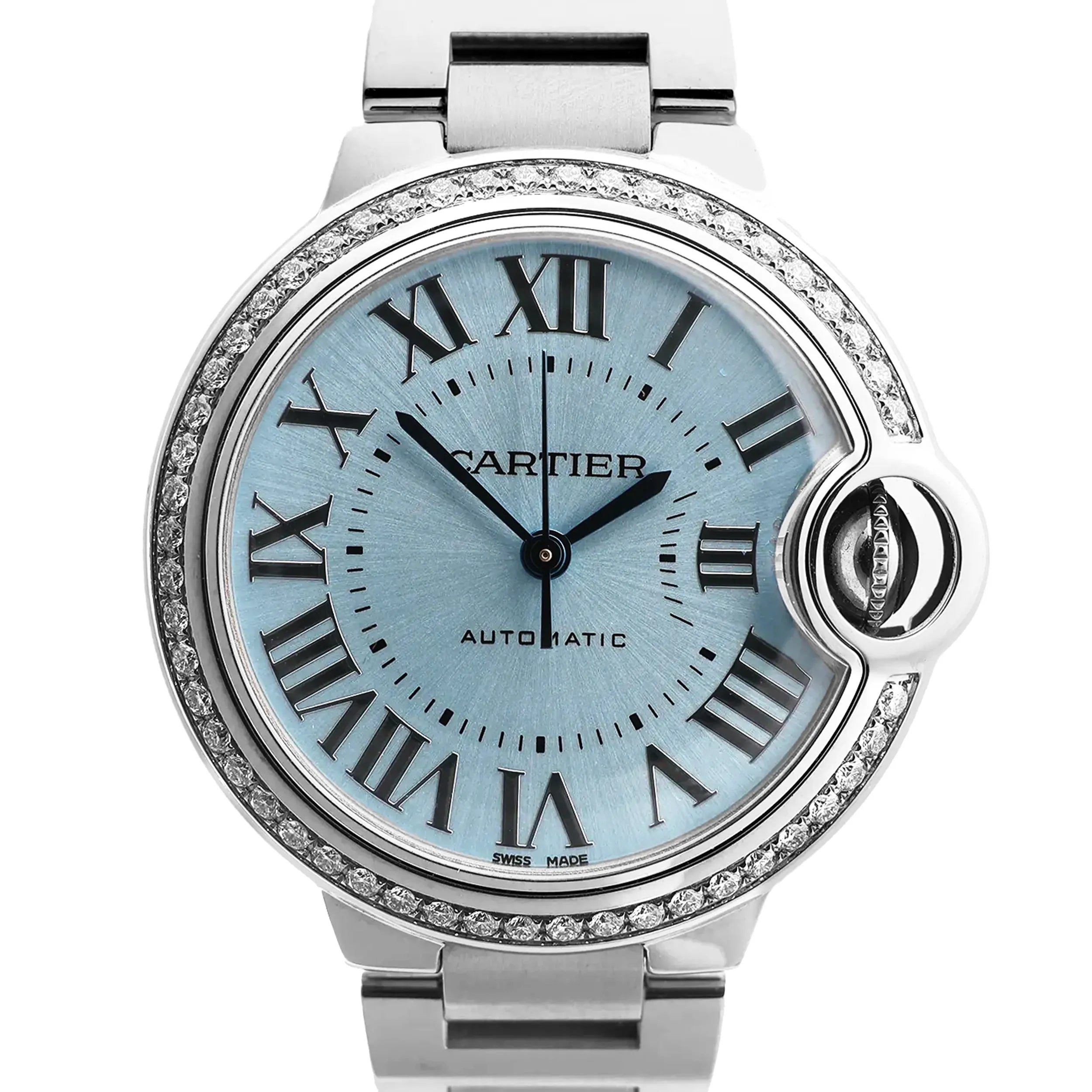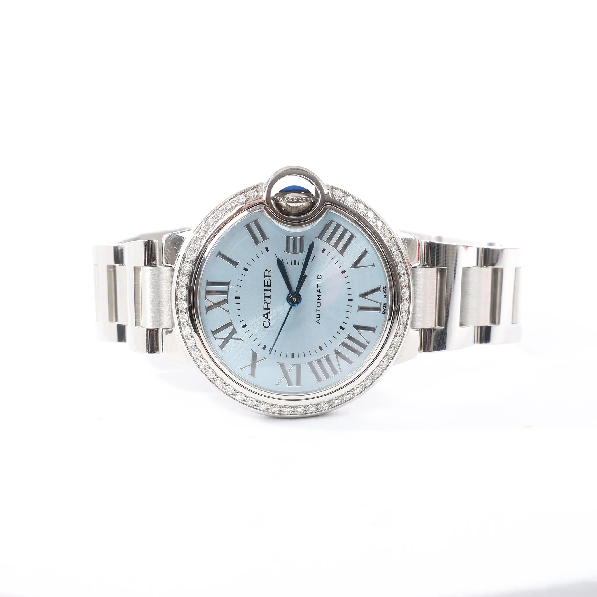 Cartier Ballon Bleu W4BB0028 stainless steel automatic watch with ice-blue dial—iconic rounded case, Roman numerals, and sparkling diamond-set bezel for elevated everyday luxury.