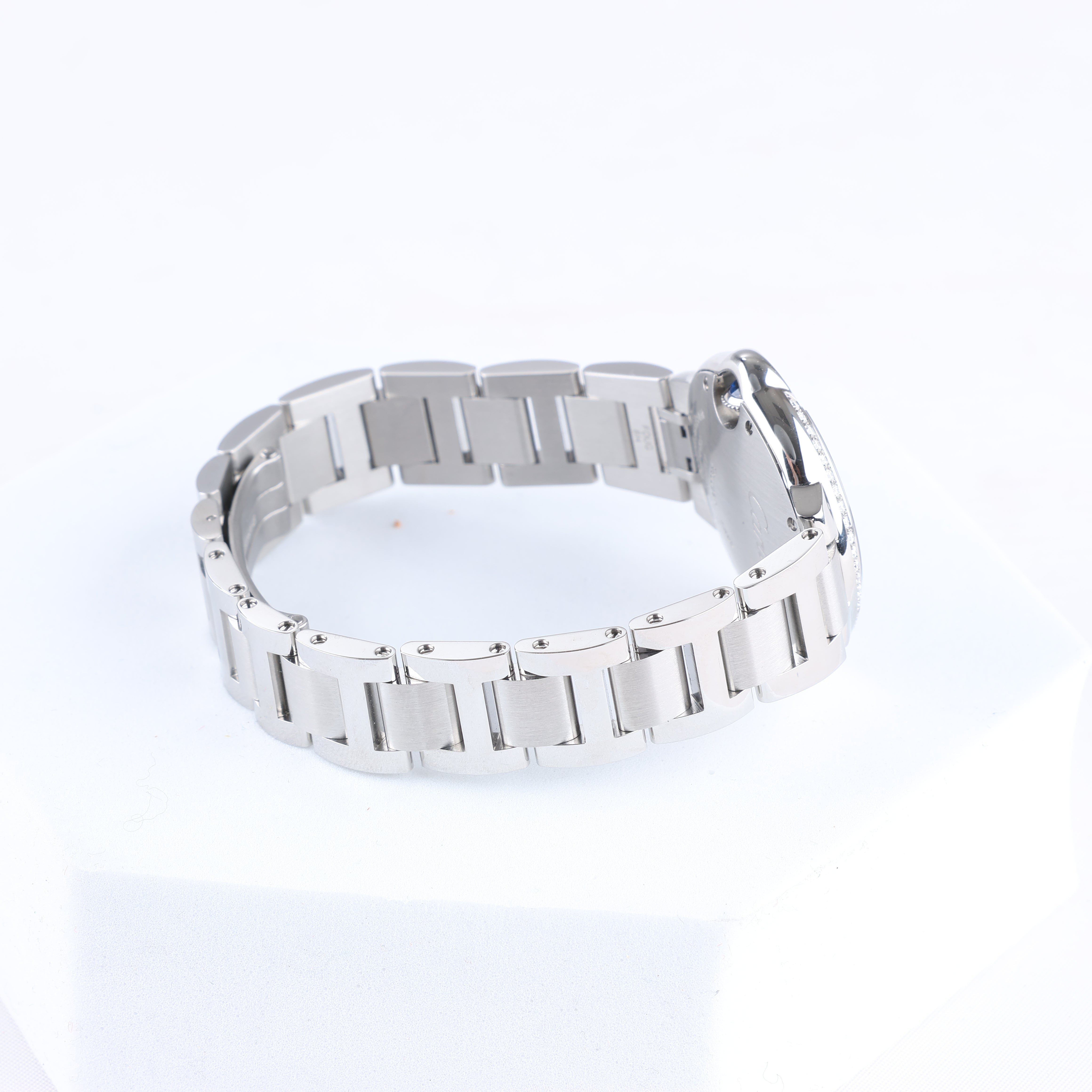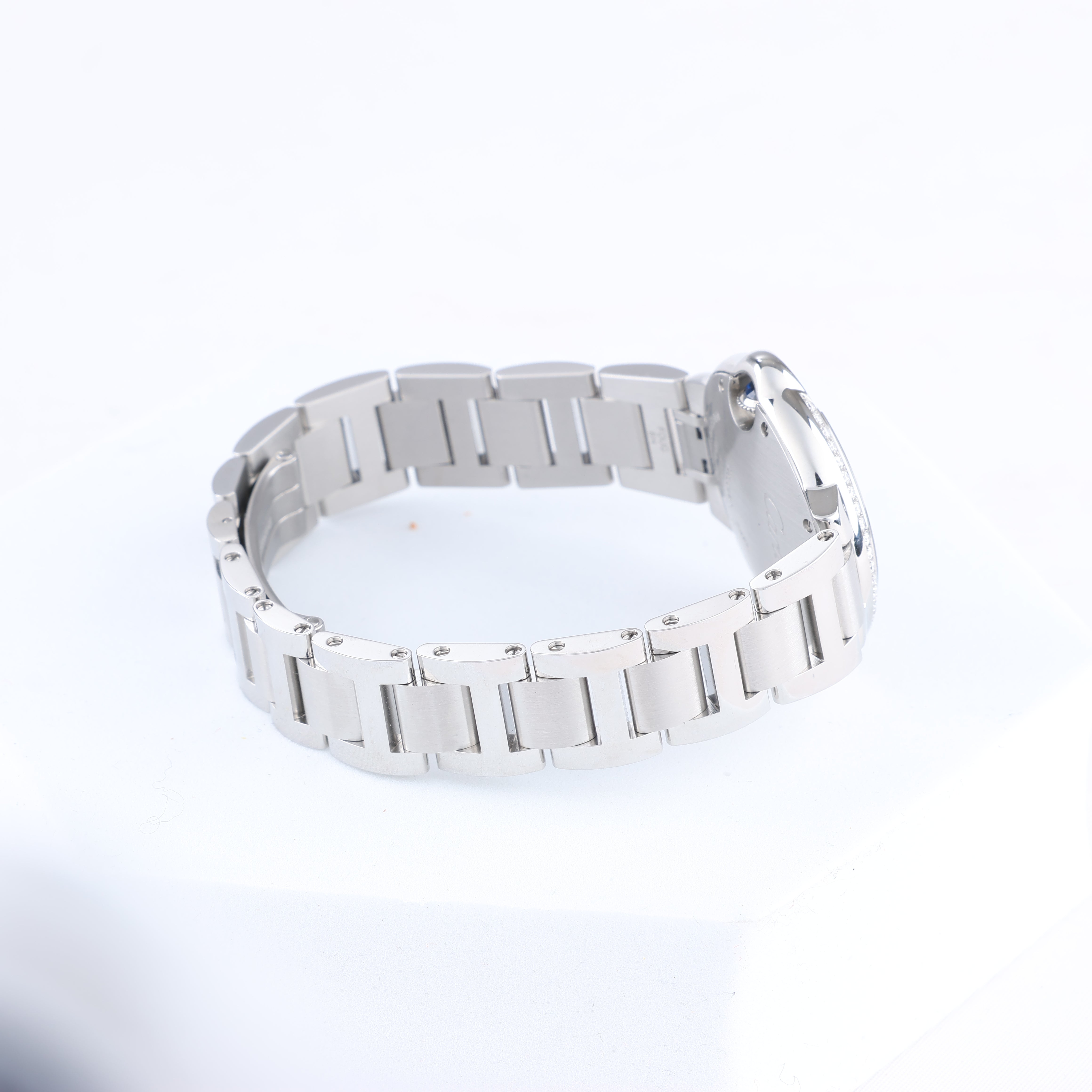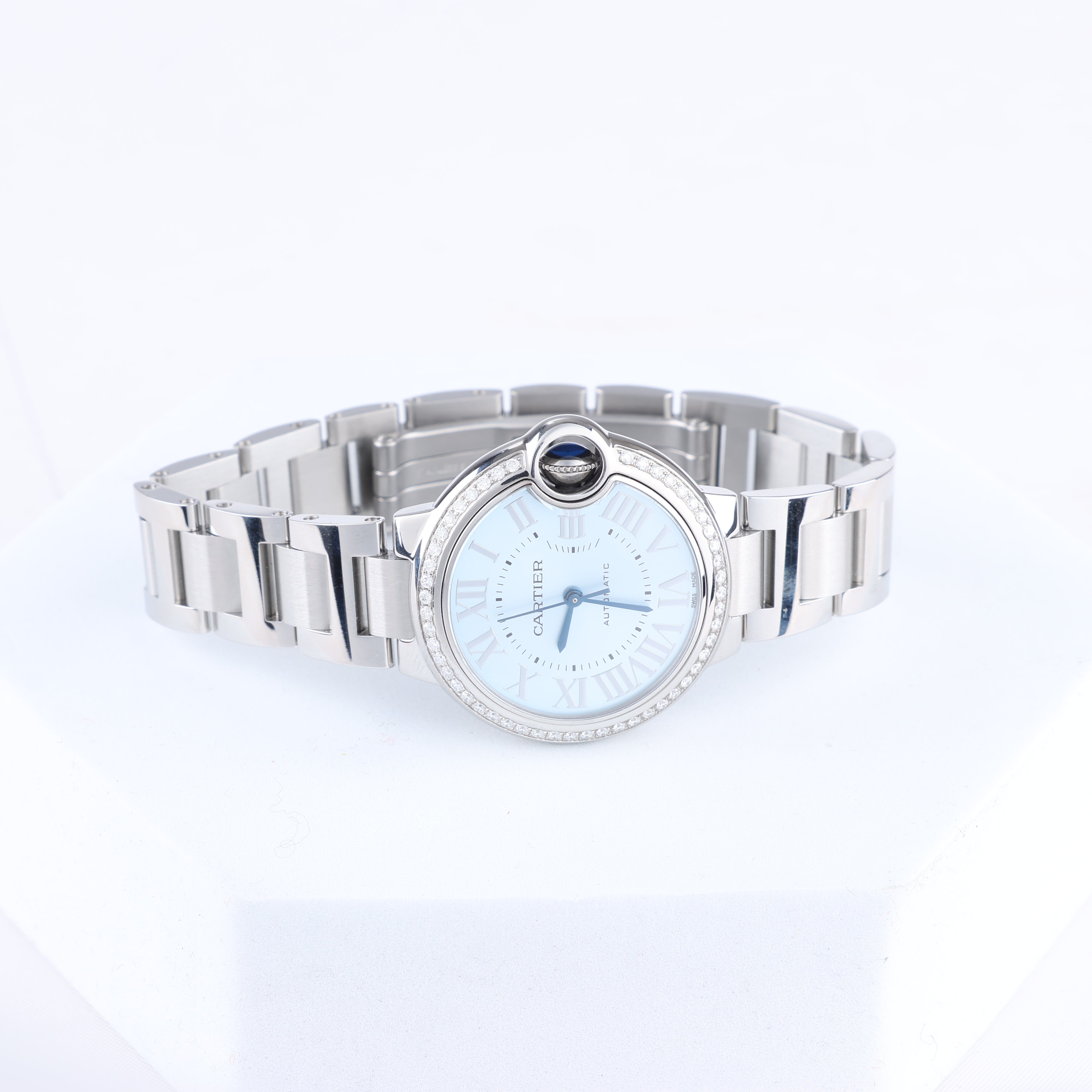 The Cartier Ballon Bleu W4BB0028 is an elegant timepiece featuring a diamond bezel, stainless steel case and bracelet. It has a blue face with Roman numerals, blue steel hands, and a signature sapphire cabochon crown, blending classic sophistication with modern luxury.