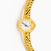 This rare Cartier timepiece from the 1950s is crafted in 18k yellow gold and features a beautifully textured chevron-pattern bracelet. The oval case measures approximately 1.3 cm in width and 2.4 cm in length, offering a delicate yet distinctive silhouette on the wrist. Weighing 35.6 grams, it houses a highly sought-after back-winding EWC movement. The minimalist ivory dial, paired with blued steel hands, reflects Cartier’s refined Parisian elegance — a true gem for collectors and vintage connoisseurs.
