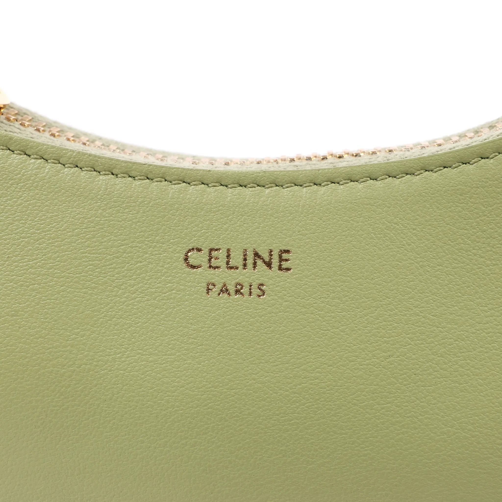 Add a pop of color to your wardrobe with the CELINE Ava Shoulder Bag in green. This sleek, crescent-shaped model is crafted from smooth leather and features minimalist gold-tone branding—perfect for effortless, everyday chic.