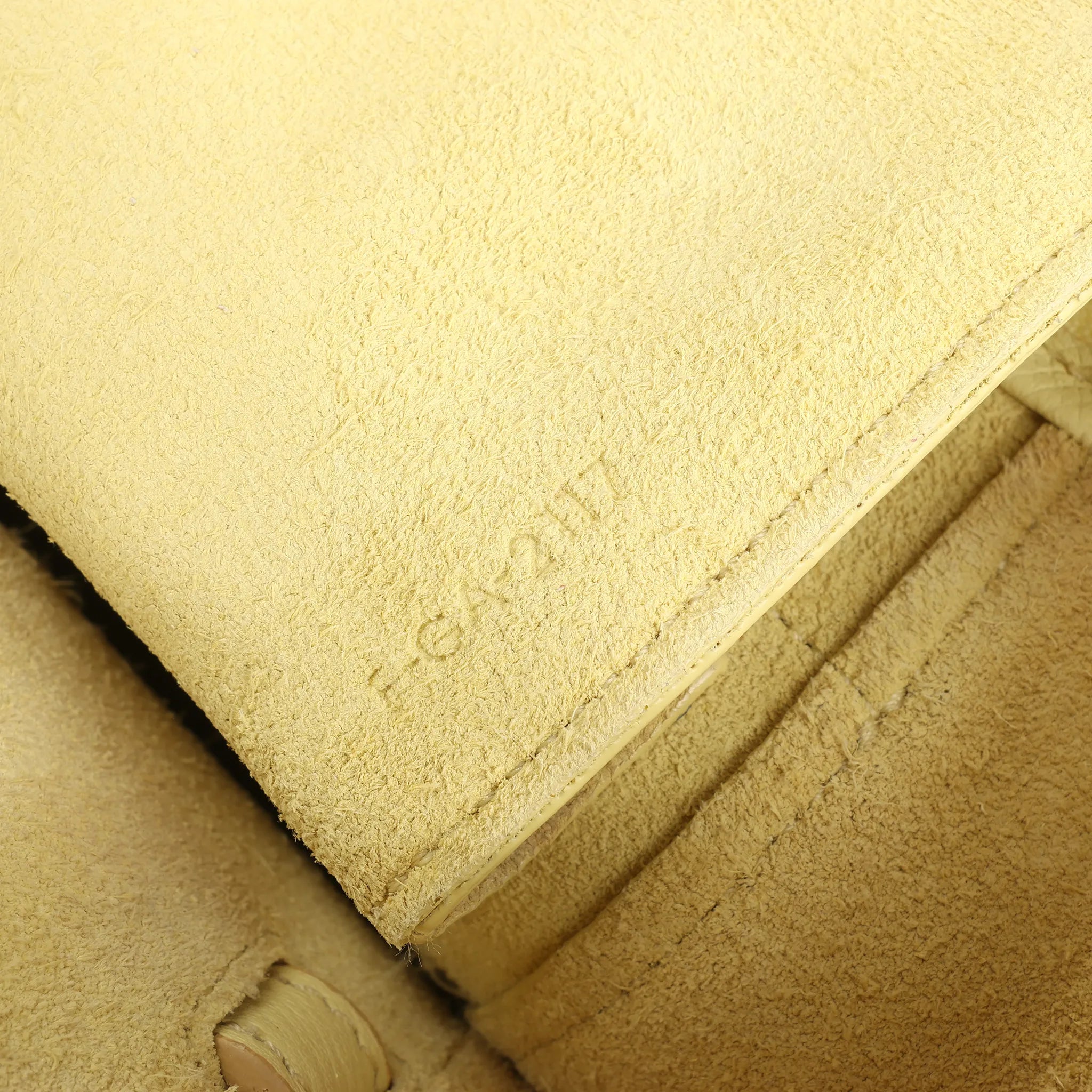 Brand: CELINEModel: BeltSize: MicroWidth: 23 cmHeight: 19 cm Exterior Condition: ExcellentInterior Condition: ExcellentCondition Details: Exterior leather is beautiful and in excellent condition with light rubbings at the bottom. The handle and shoulder strap is clean and firm in very good condition. The hardware remains bright and shiny, but has light surface scratches. The interior lining remains great condition, but has usage rubbings. The width at the top is 33 cm.Colour: YellowInterior Colour: YellowHardware Colour: SilverMaterial: LeatherComes With: Shoulder strap