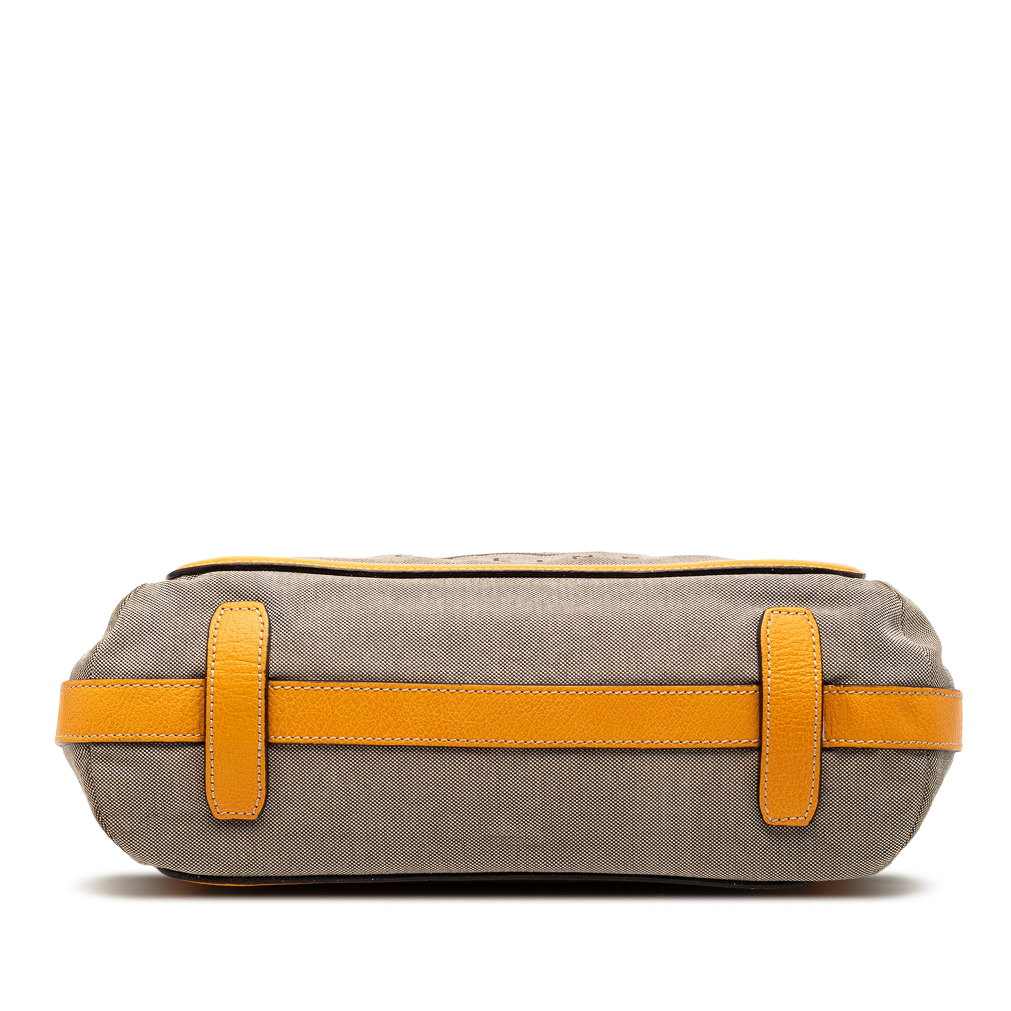 This tote bag features a canvas body with leather trim, flat leather straps, an open top with a clasp closure, and interior zip and slip pockets. Retail Price: 700.00
