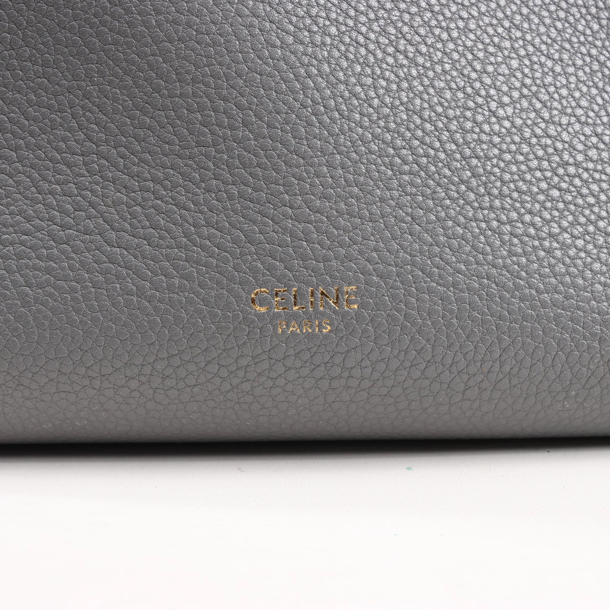 The CELINE Seau Sangle Bucket Mini bag in gray is crafted from supple grained leather and finished with gold-tone hardware. Compact yet spacious, this iconic shoulder bag delivers modern elegance with everyday versatility and a signature minimalist design.