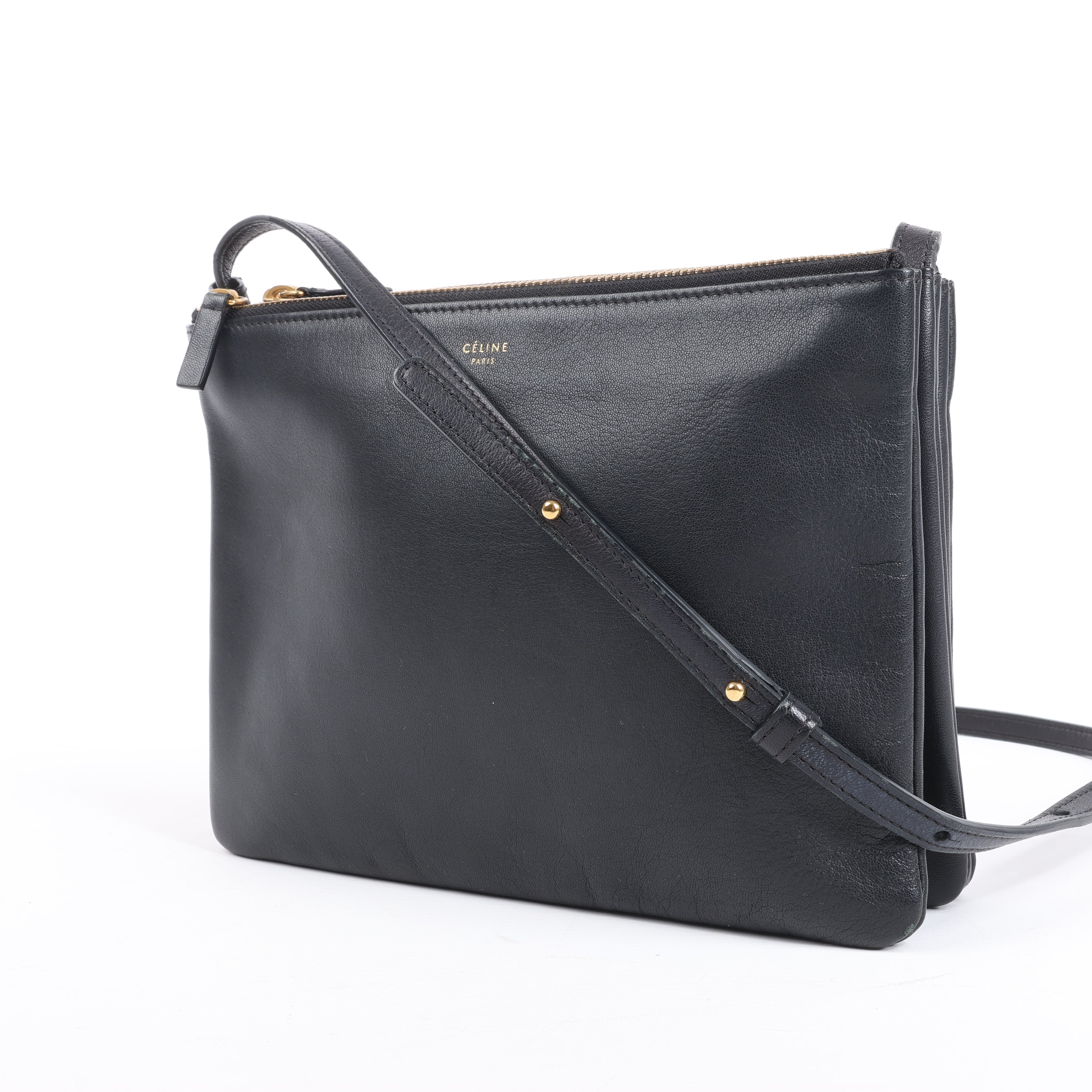 Brand: CELINEModel: Trio Size: LargeWidth: 24.5 cmHeight: 17 cmExterior Condition: ExcellentInterior Condition: ExcellentCondition Details: The exterior leather is clean in excellent condition. The hardware is bright and crisp. The shoulder strap is clean and in good condition The interior lining is clean and excellent condition Overall looks like NEW!Colour: BlackInterior Colour: BlackHardware Colour: GoldMaterial: LeatherComes With: Dustbag