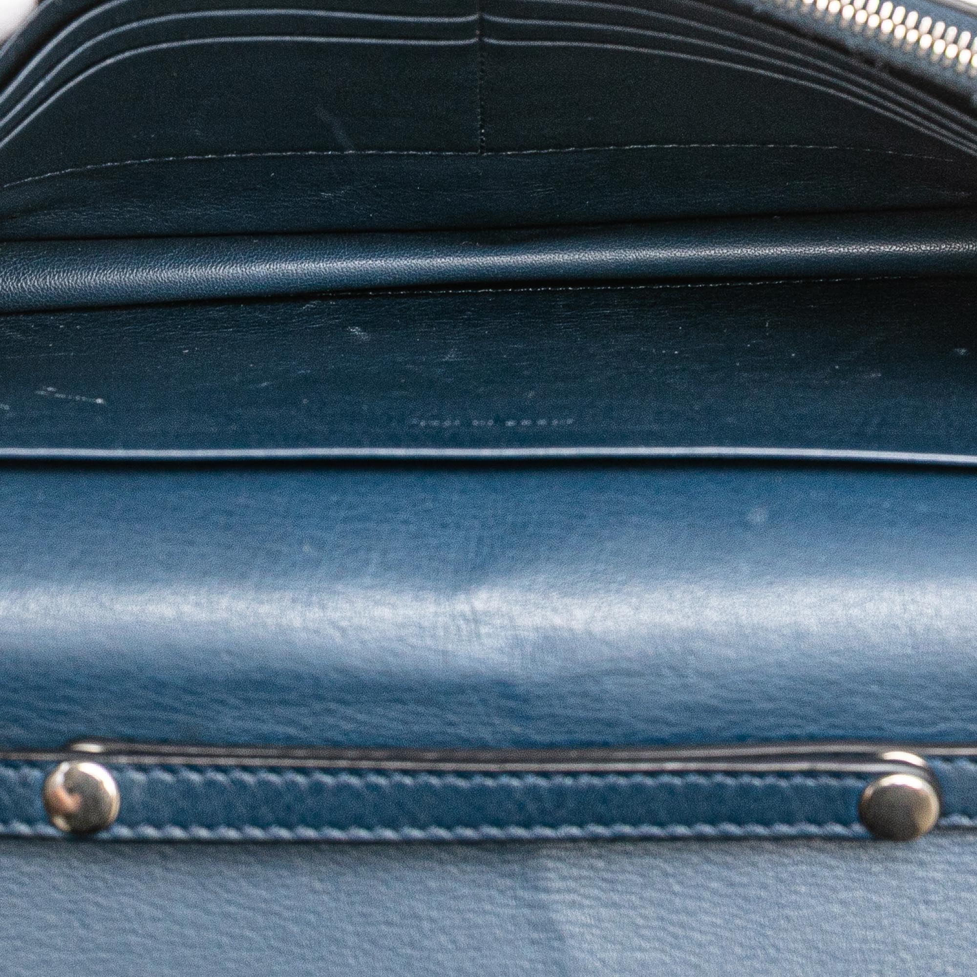 The Frame features a leather body, a chain link shoulder strap, a front flap with snap closure, and interior zip and slip pockets. Retail Price: 1400.00