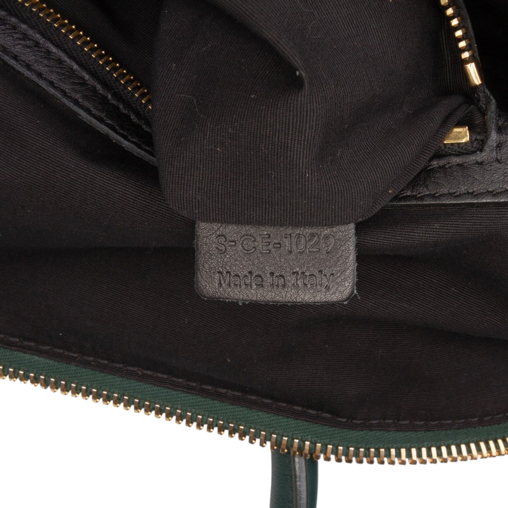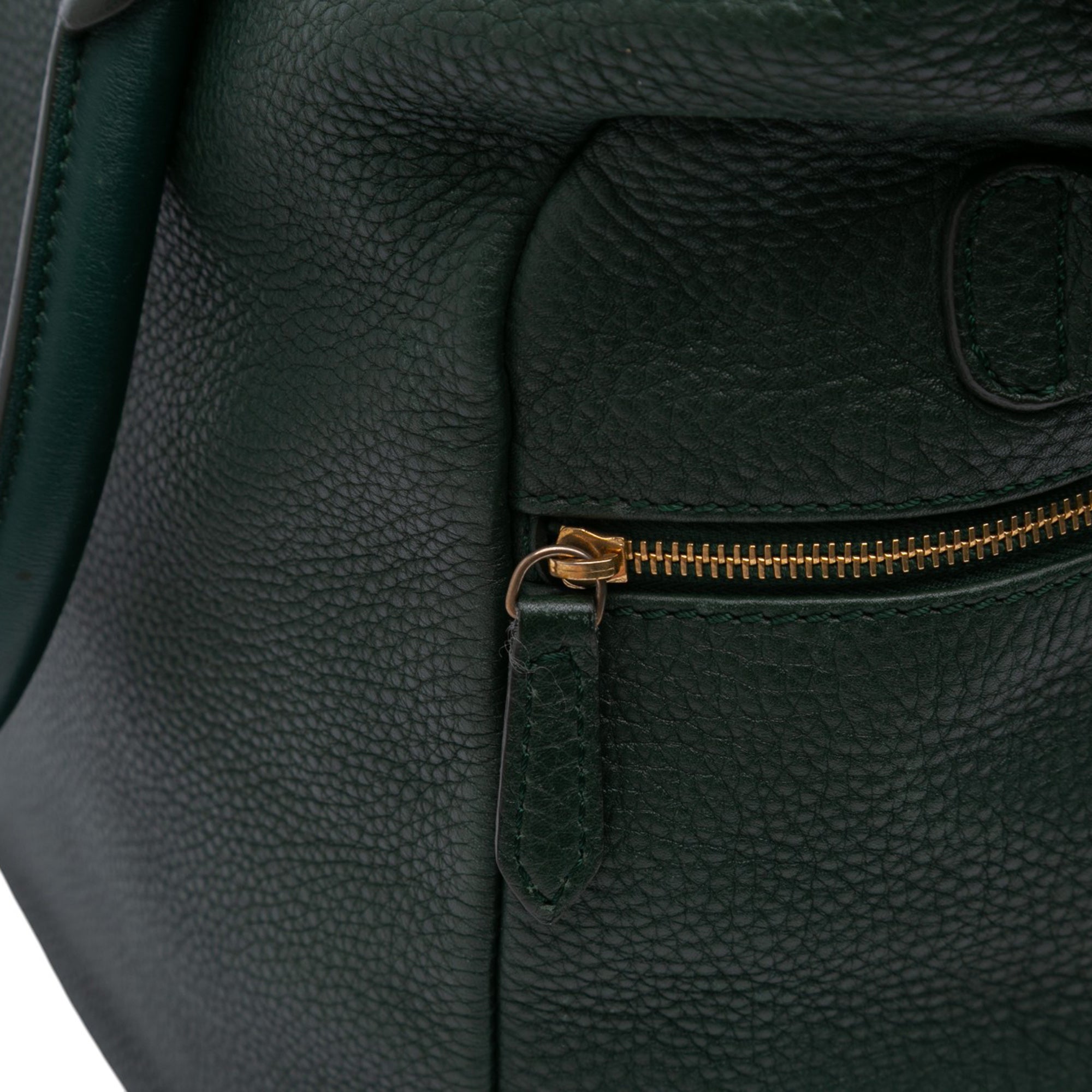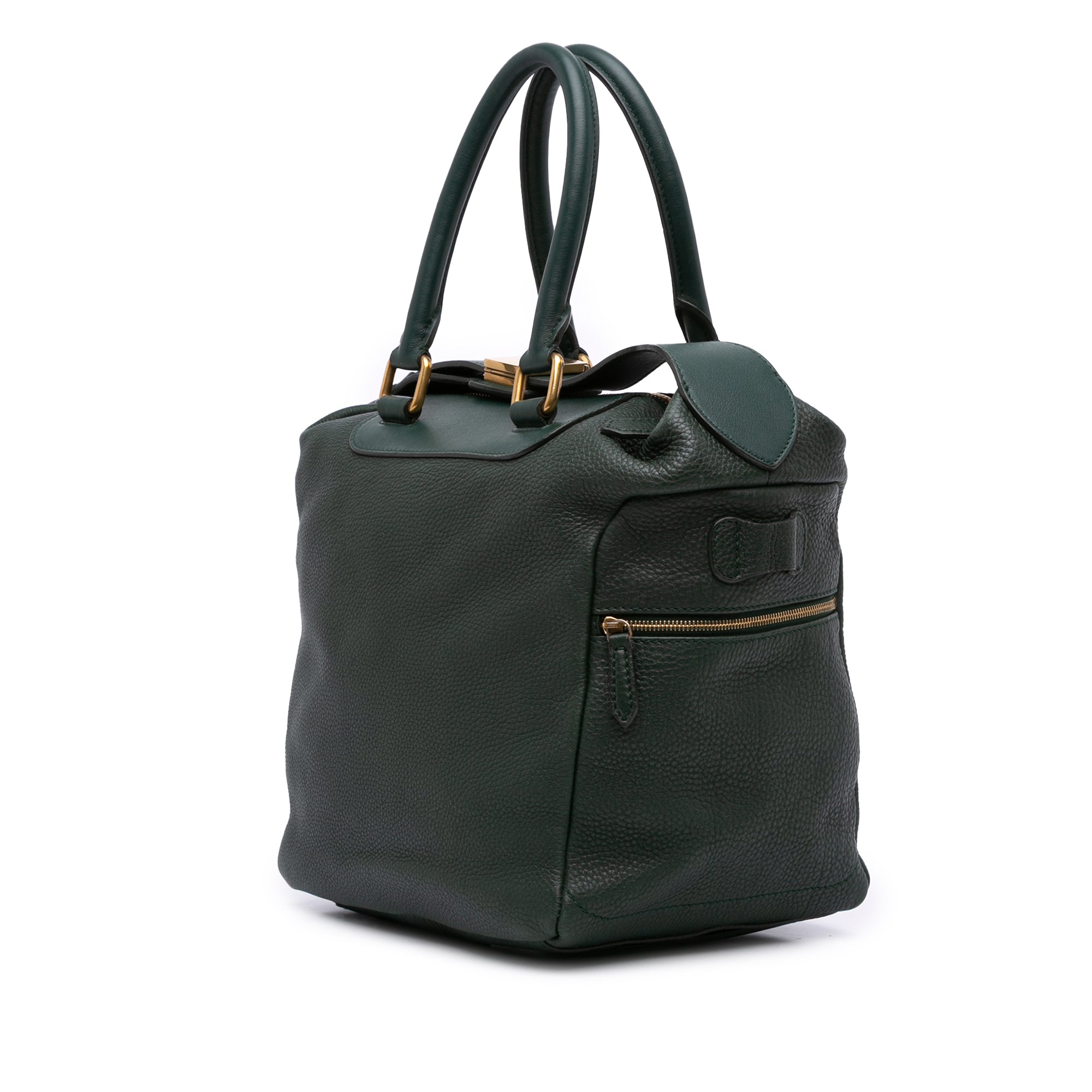 This satchel features a leather body, rolled top handles, a flat leather strap, a top zip closure, exterior zip pockets, and interior zip pockets. Retail Price: 600.00