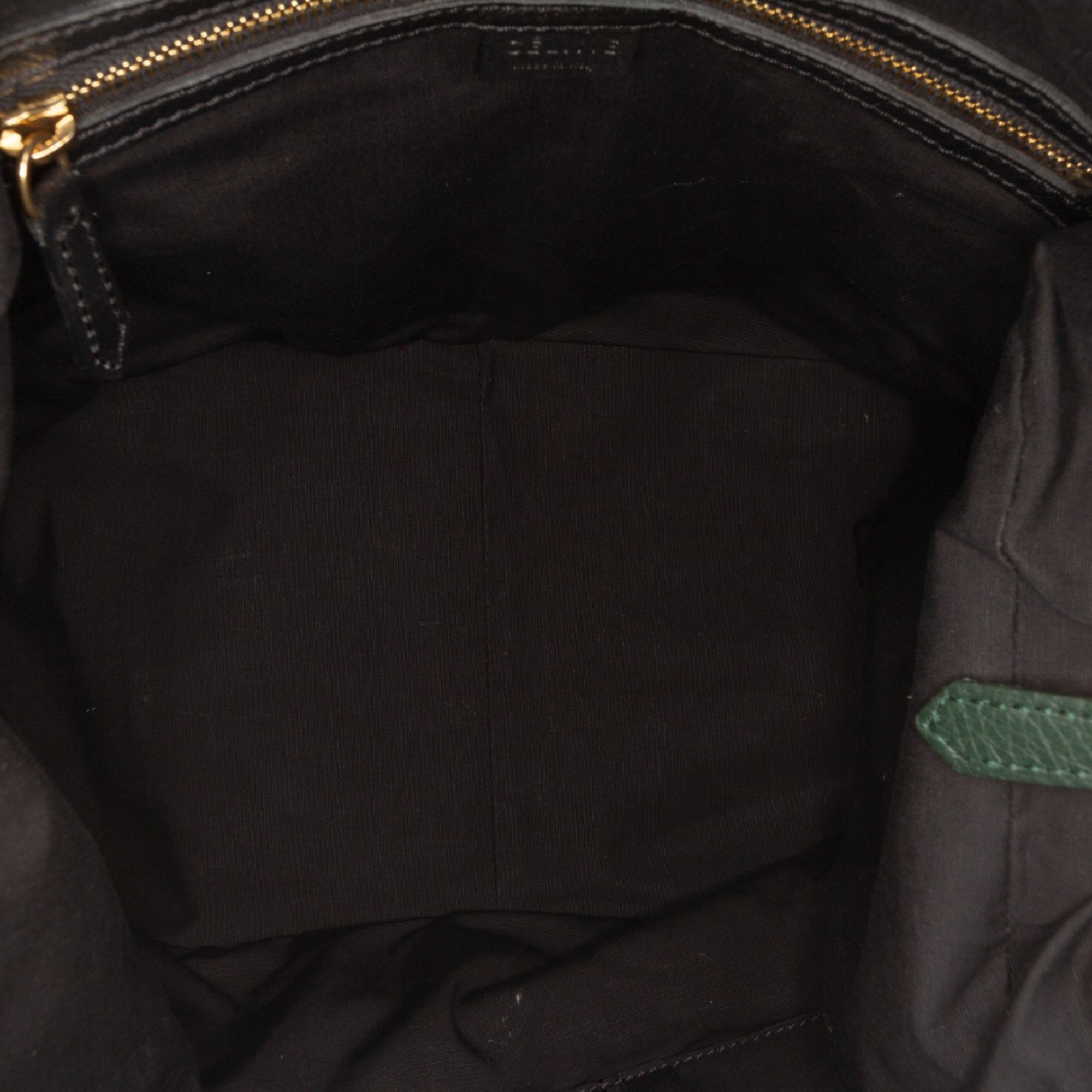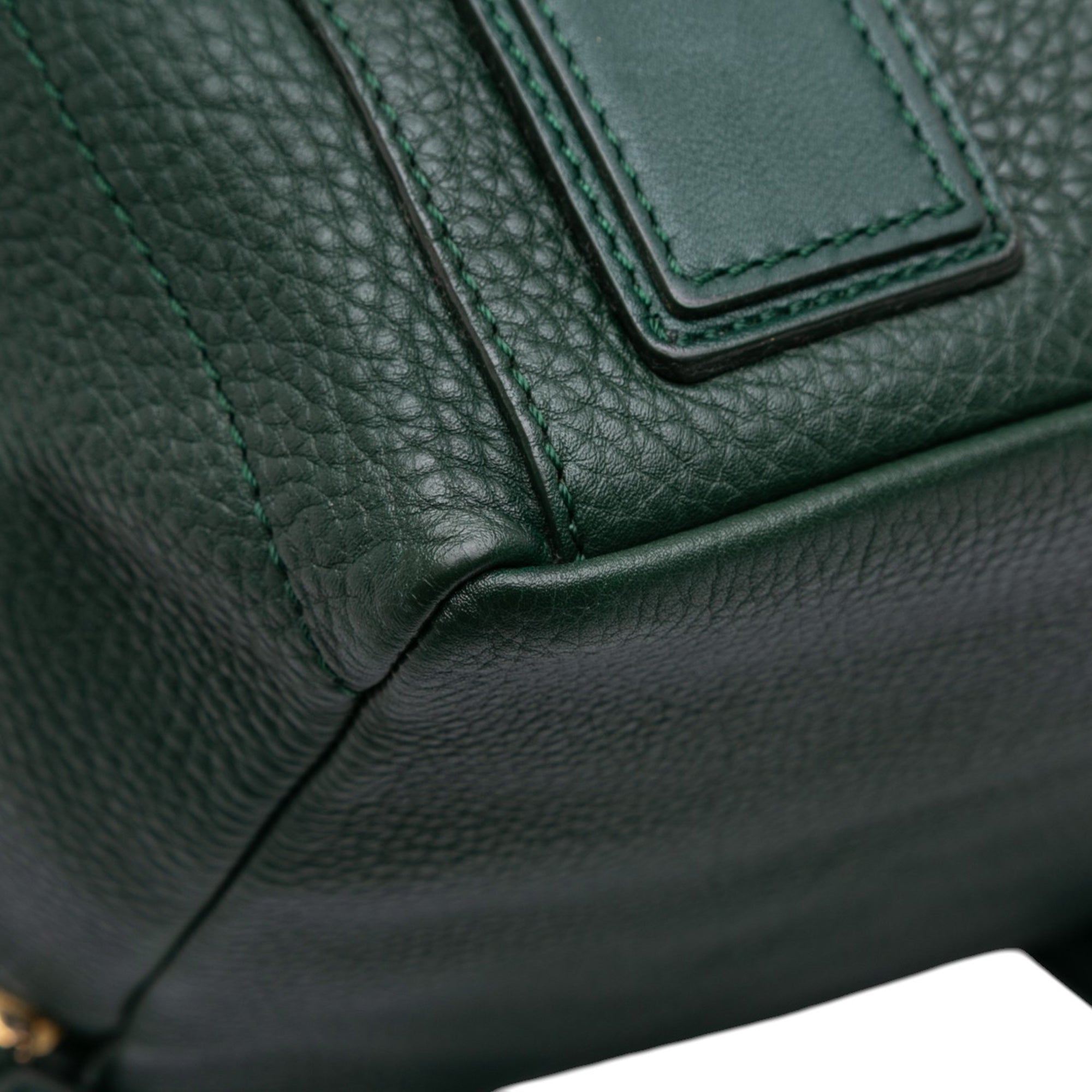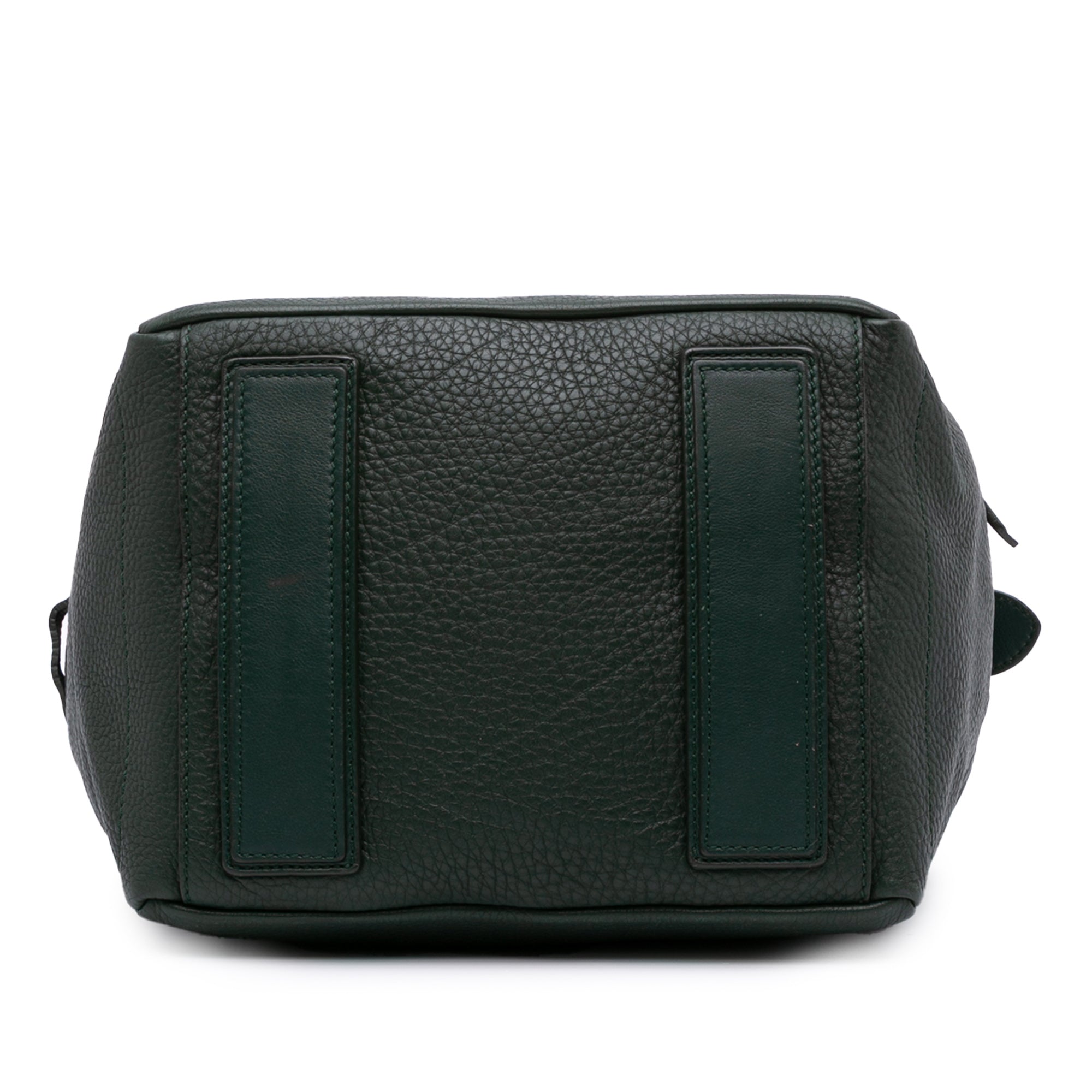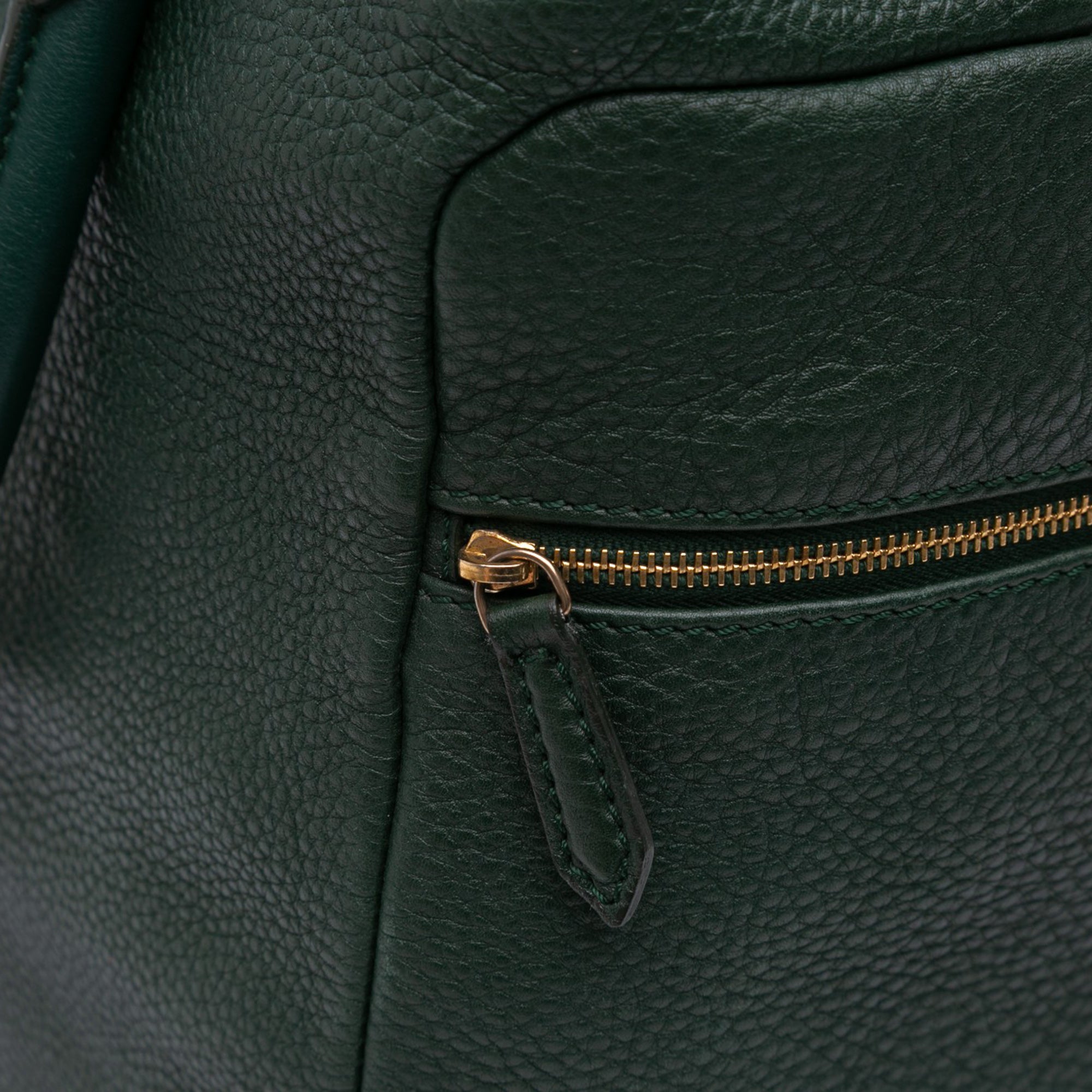 This satchel features a leather body, rolled top handles, a flat leather strap, a top zip closure, exterior zip pockets, and interior zip pockets. Retail Price: 600.00