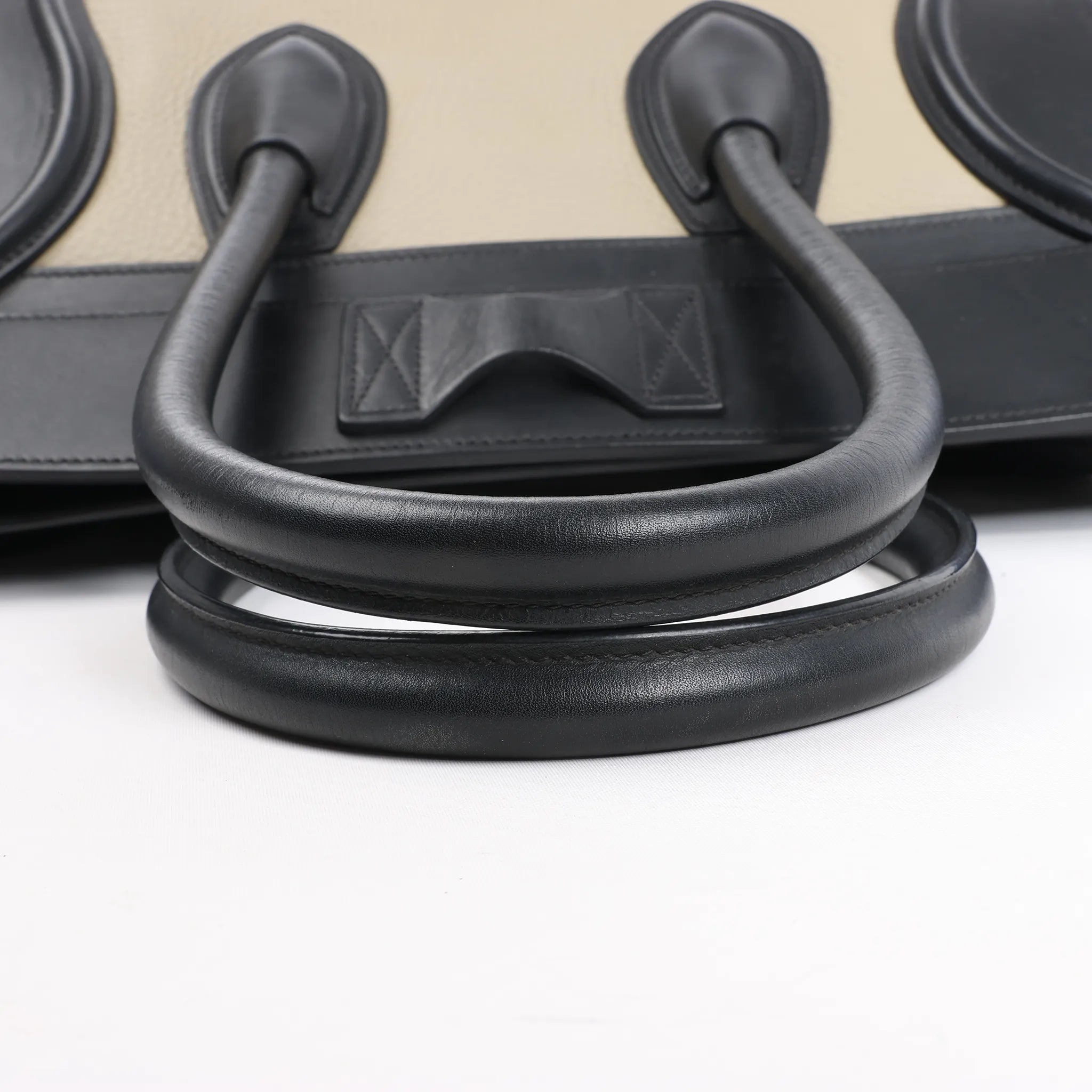 Brand: CelineModel: LuggageSize: MiniWidth: 30 cmHeight: 30 cmExterior Condition: ExcellentInterior Condition: ExcellentCondition Details: Exterior leather is clean and beautiful in excellent condition, with some small scratches and rubbings at the corners. The handles are firm and in great condition. The hardware is crisp and in great condition. The interior lining is in great condition, but has small stains and scratches. Width at the top is 49 cm.Colour: Blue, Beige, BlackInterior Colour: BlackHardware Colour: GoldMaterial: LeatherComes With: -
