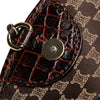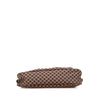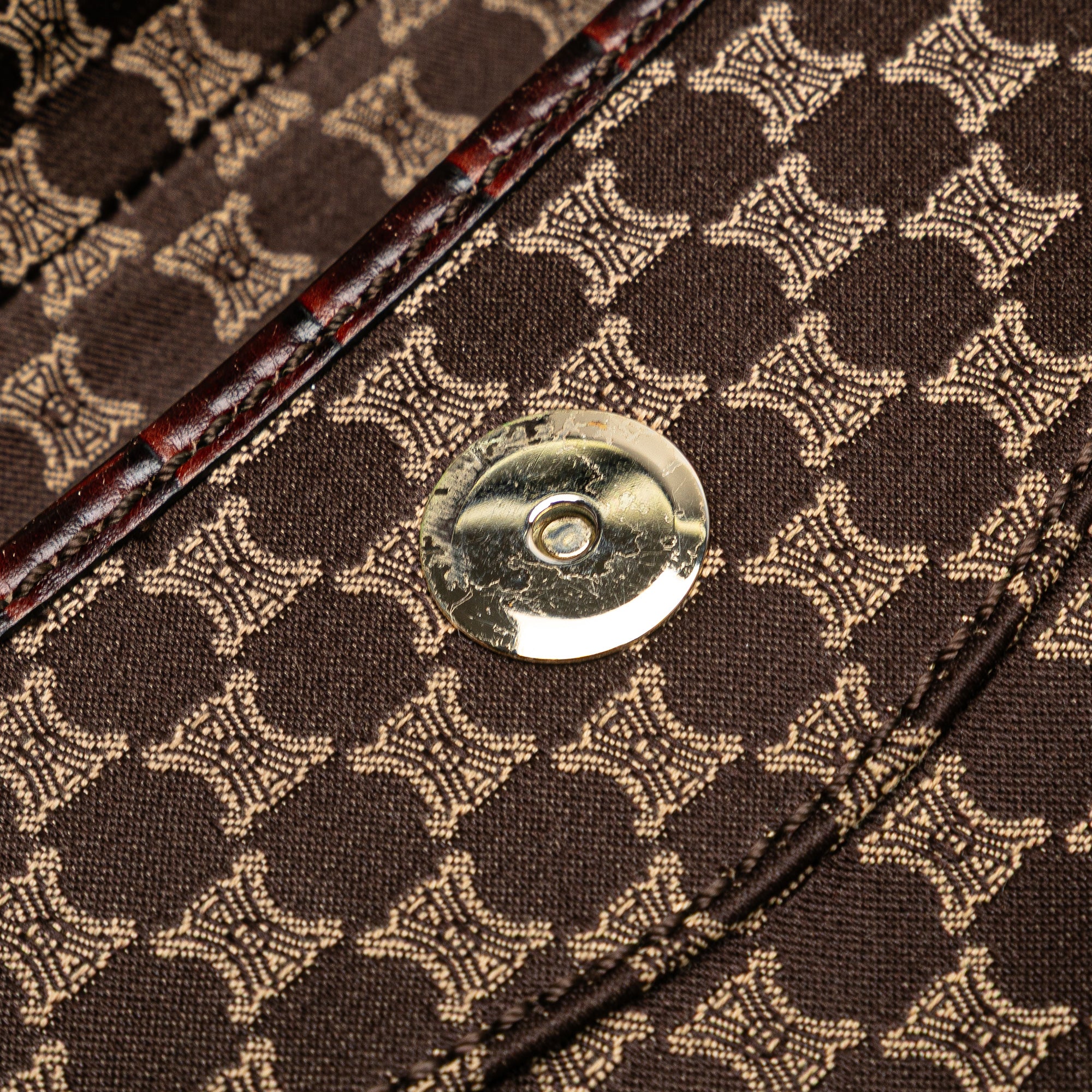 This shoulder bag features a canvas body with leather trim, a flat leather strap, a flap with magnetic snap closure, and interior zip and slip pockets. Retail Price: 711.00