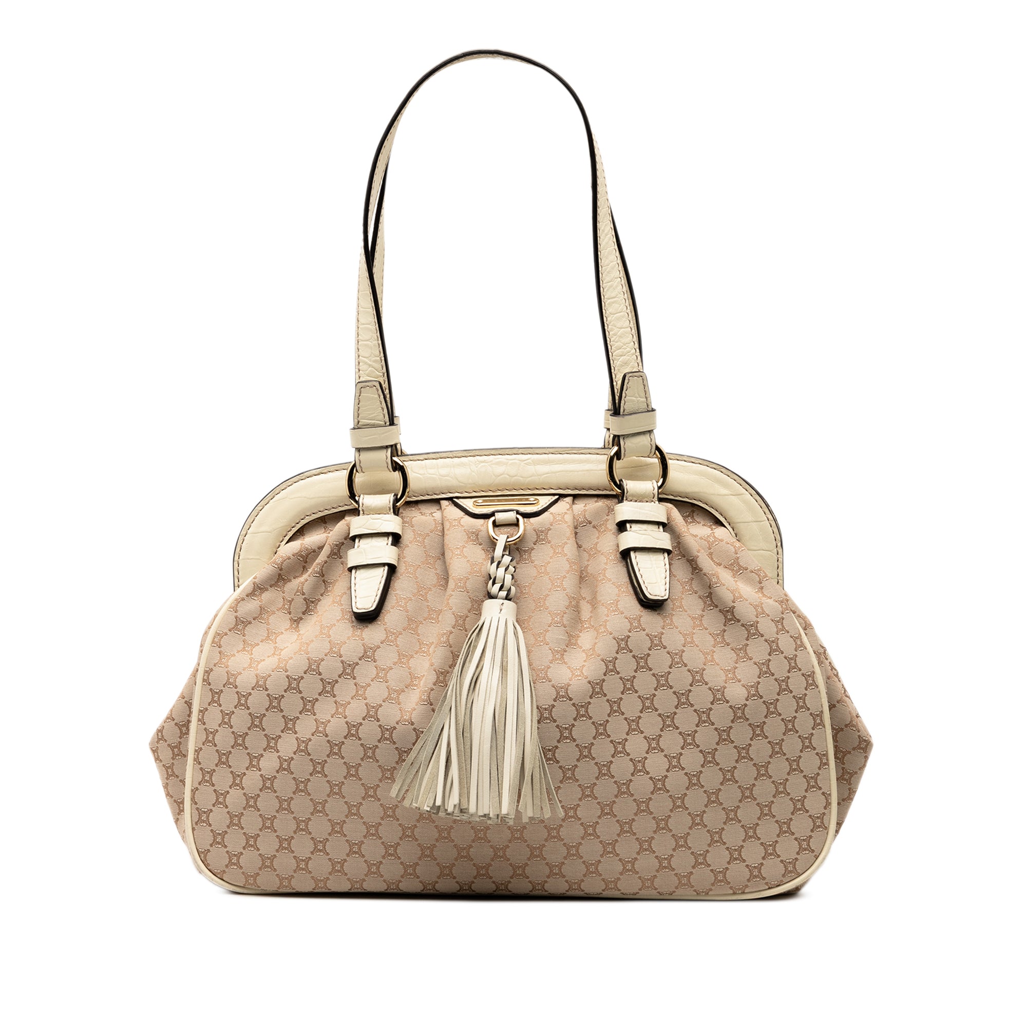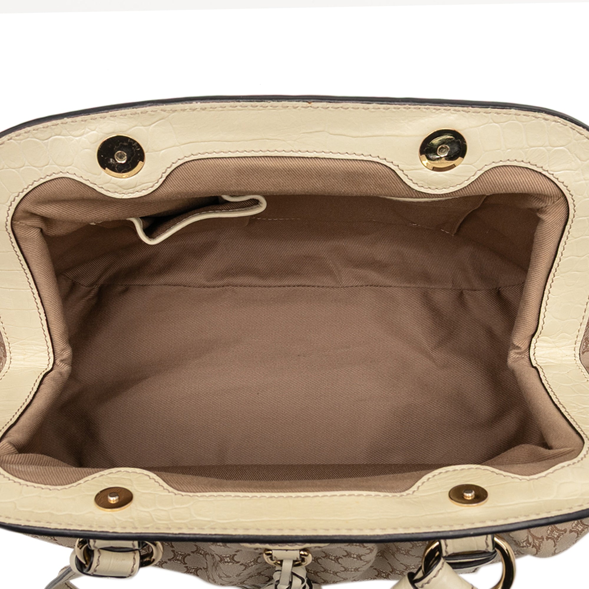 This satchel features a canvas body with leather trim, flat leather handles, a detachable flat leather strap, a frame top with magnetic snap closures, and interior slip pockets. Retail Price: 780.00