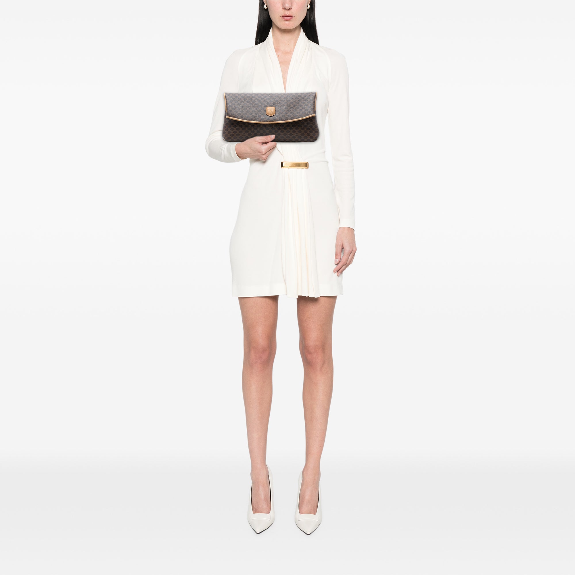 This clutch bag features a coated canvas body with leather trim, a fold-over top with magnetic snap closure, and an interior slip pocket. Retail Price: 500.00