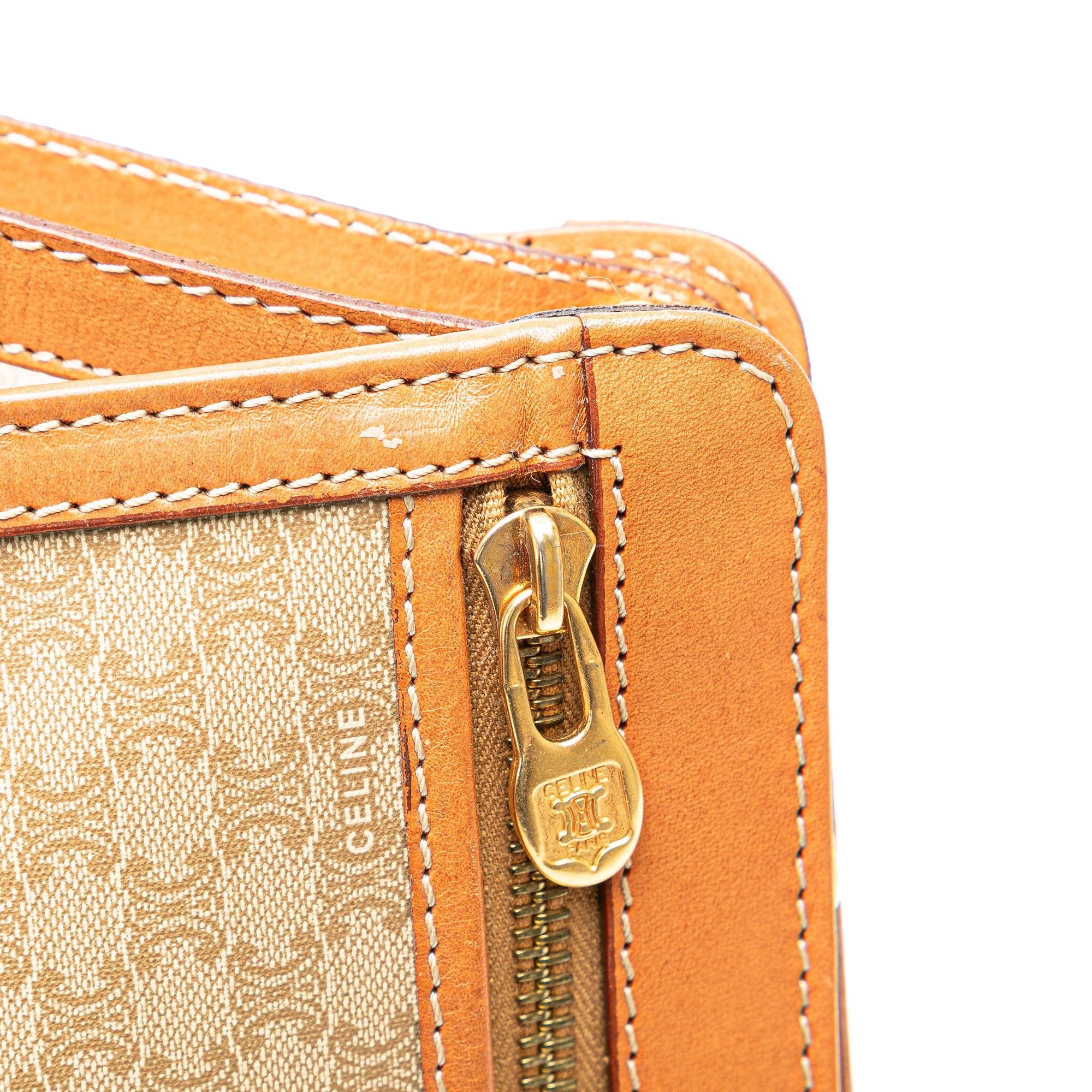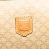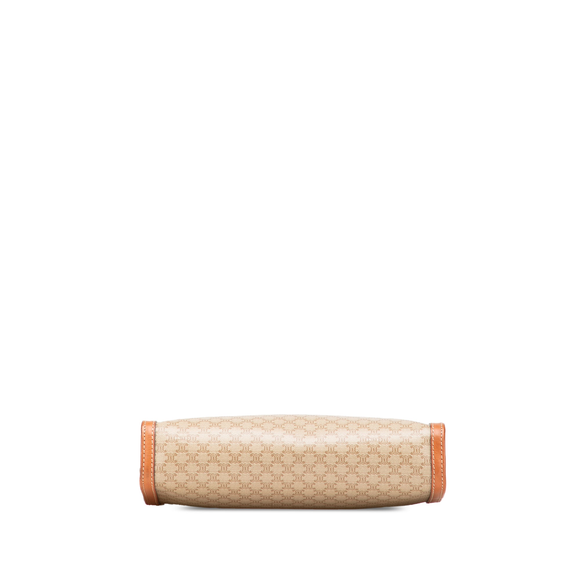 This clutch bag features a coated canvas body with leather trim, a flat leather wrist strap, a top zip closure, an exterior front zip pocket, and an interior zip pocket. Retail Price: 489.00