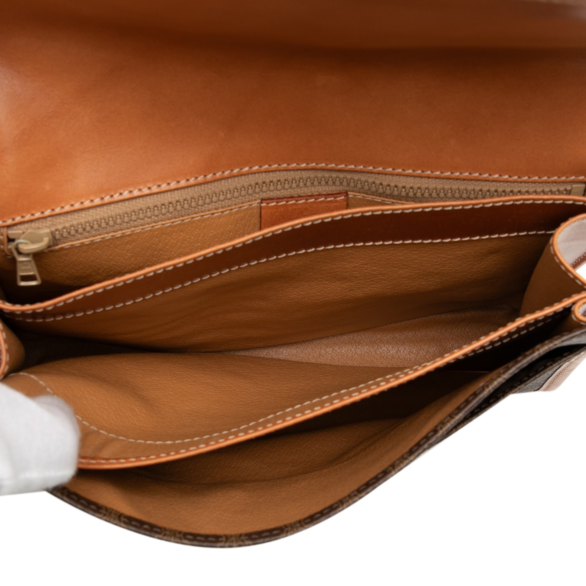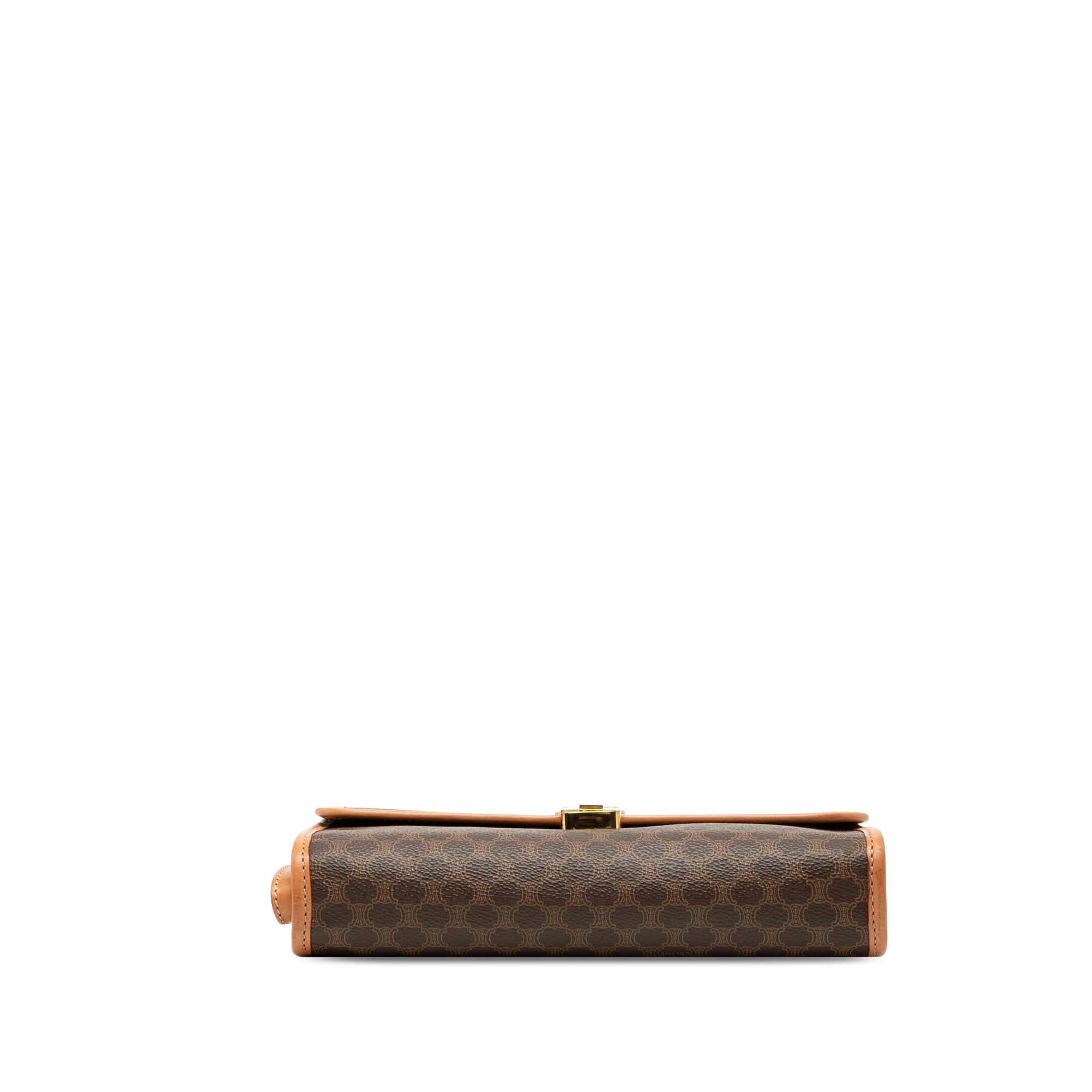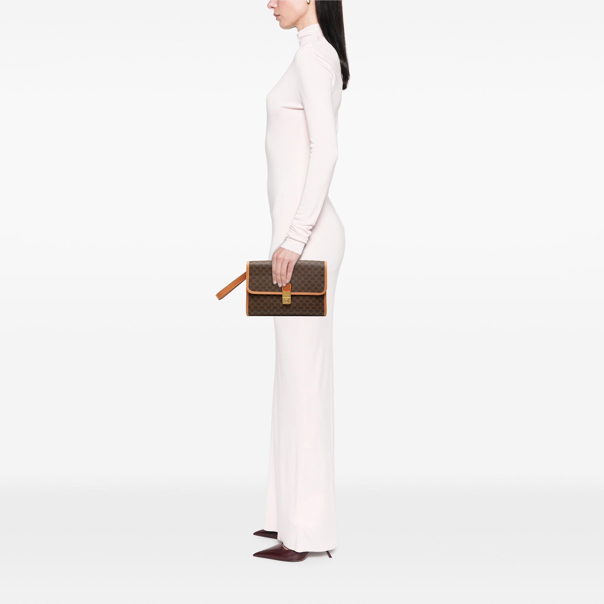 This clutch bag features a coated canvas body with leather trim, a flat leather wristlet, a top flap with push lock closure, and an interior zip pocket. Retail Price: 575.00