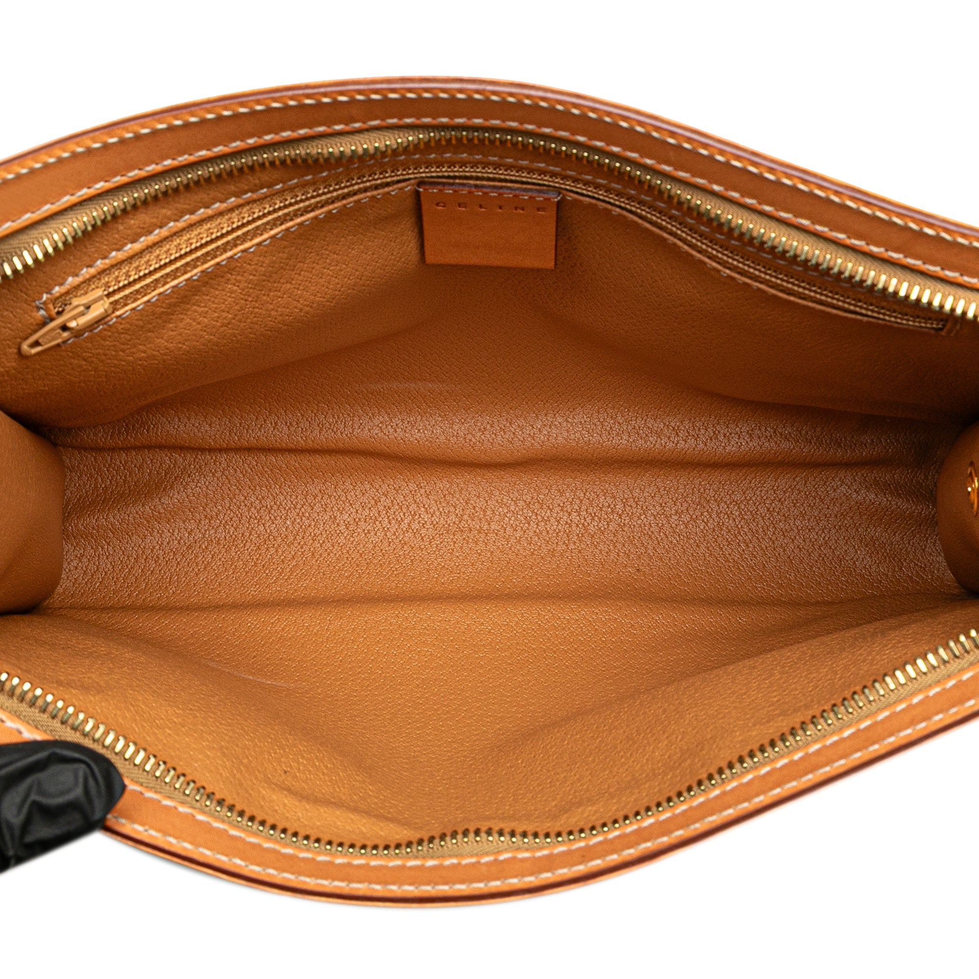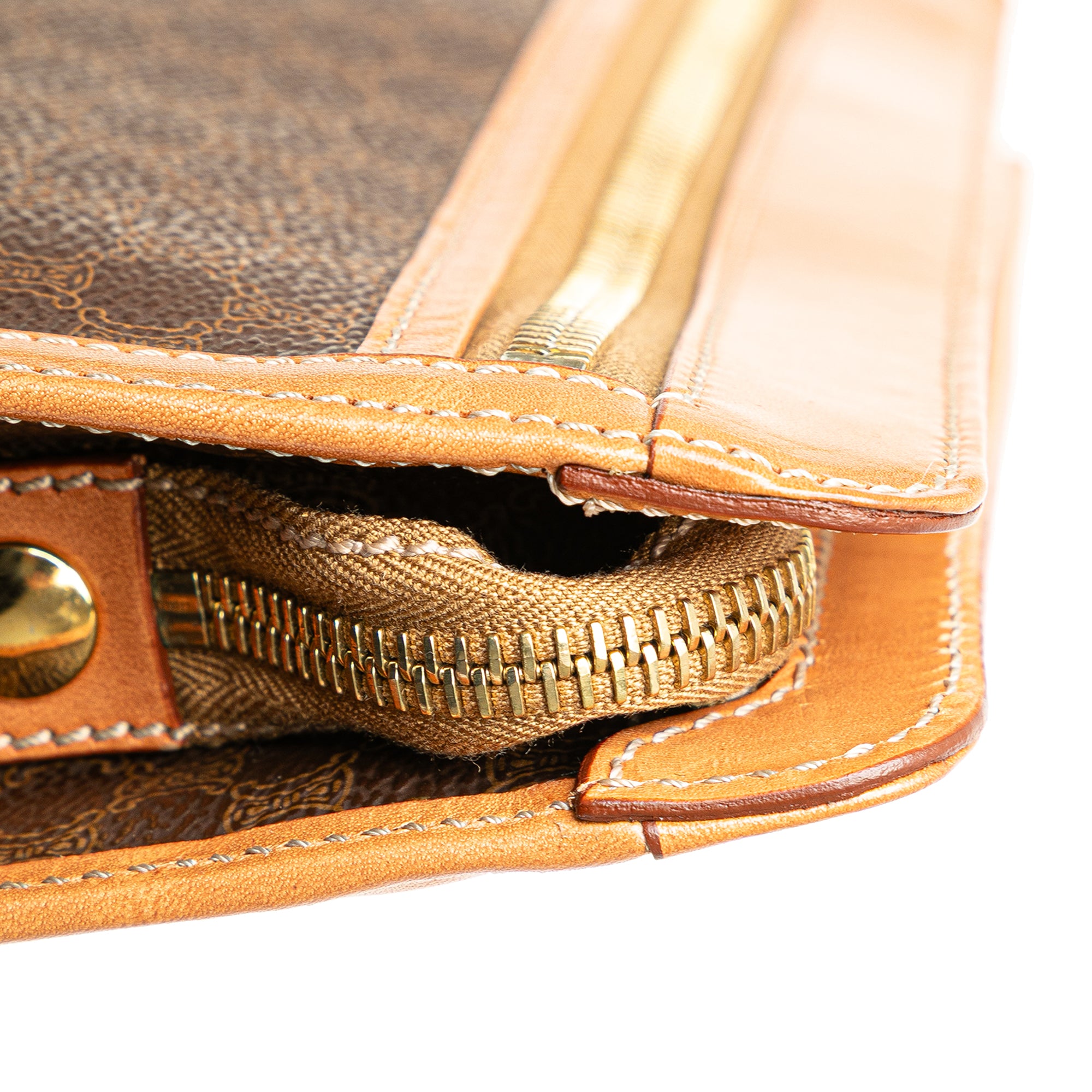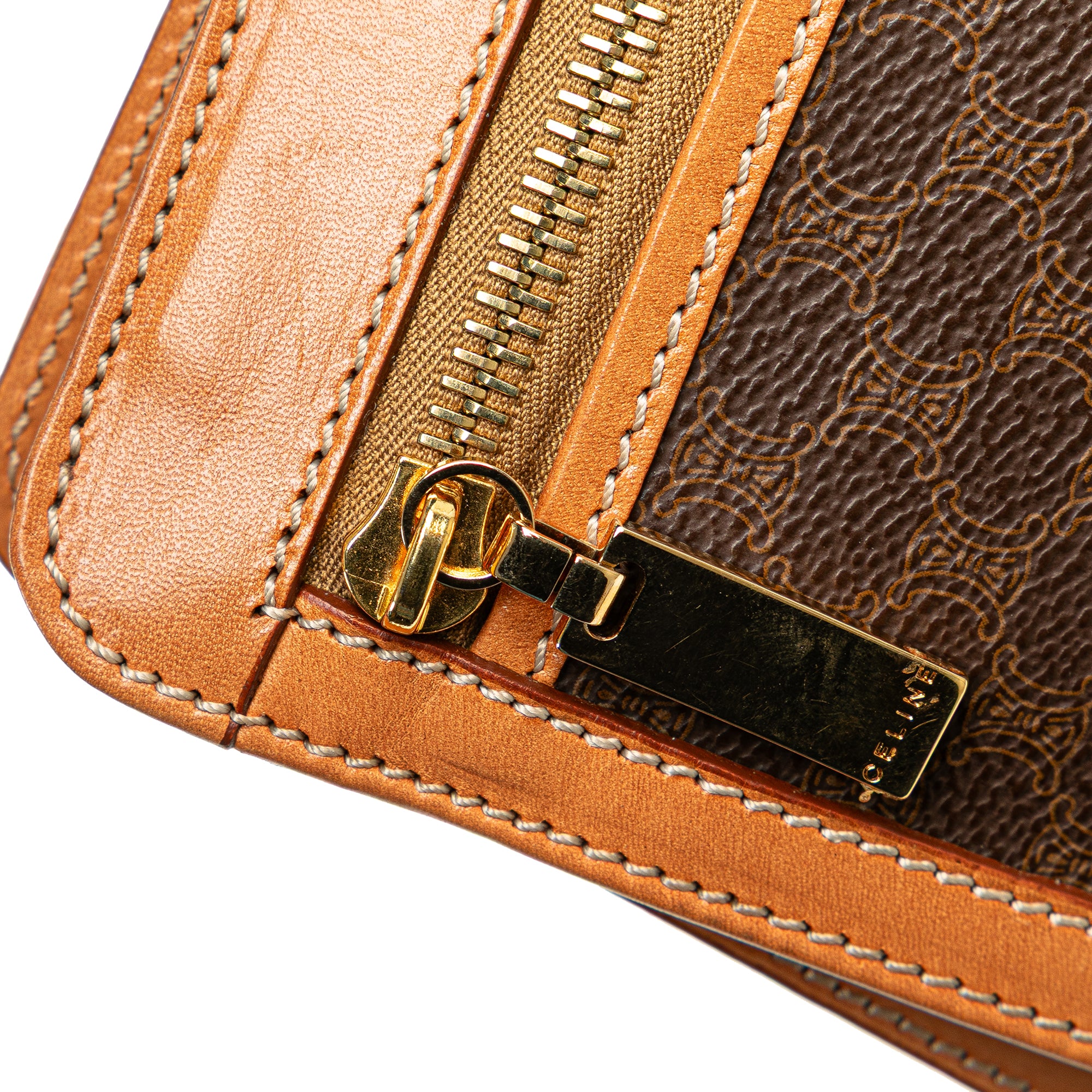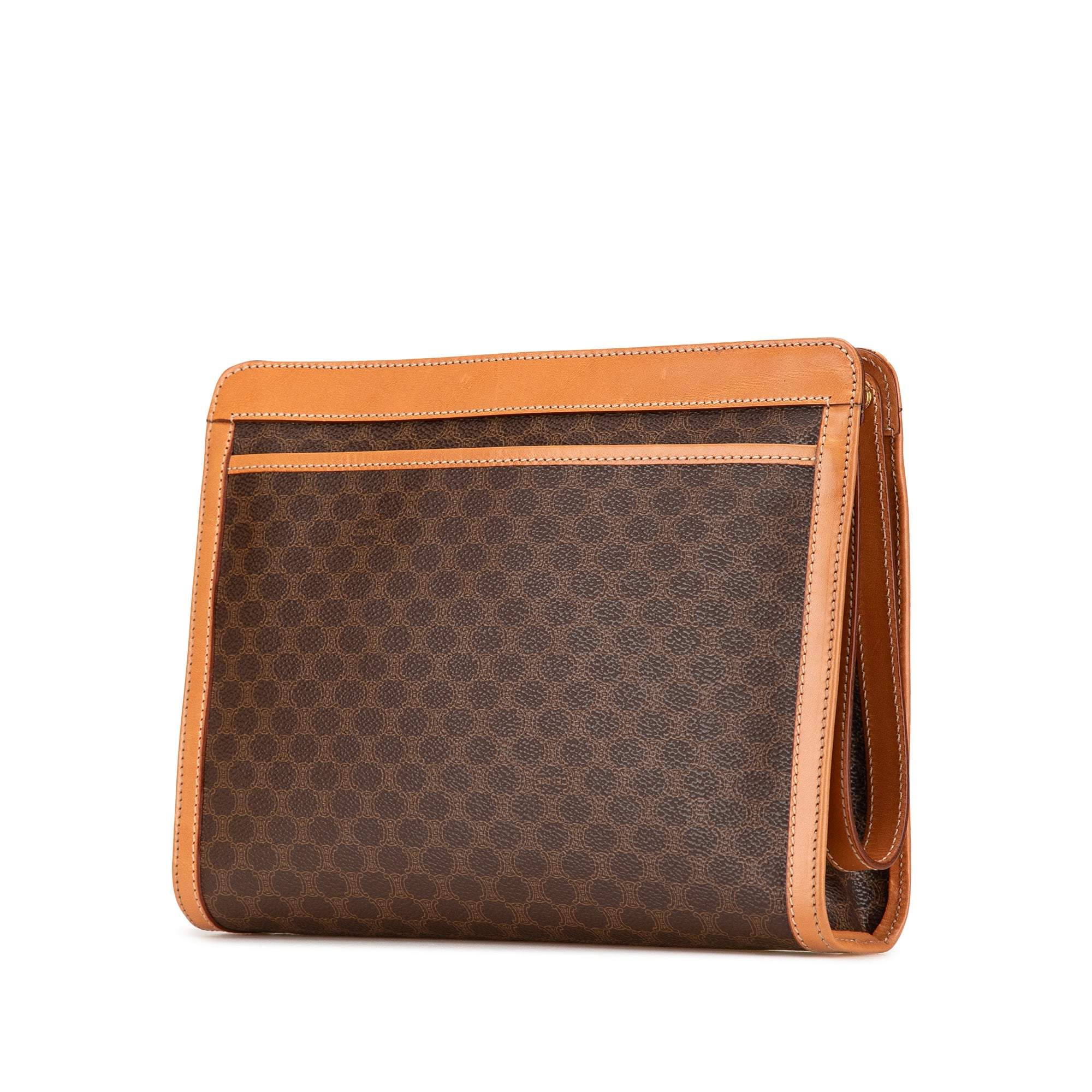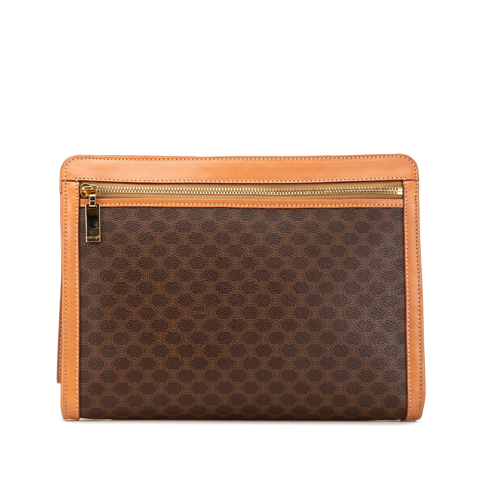 This clutch bag features a coated canvas body with leather trim, a flat leather wrist strap, a top zip closure, exterior zip and slip pockets, and an interior zip pocket. Inclusion: Dust bag. Retail Price: 495.00