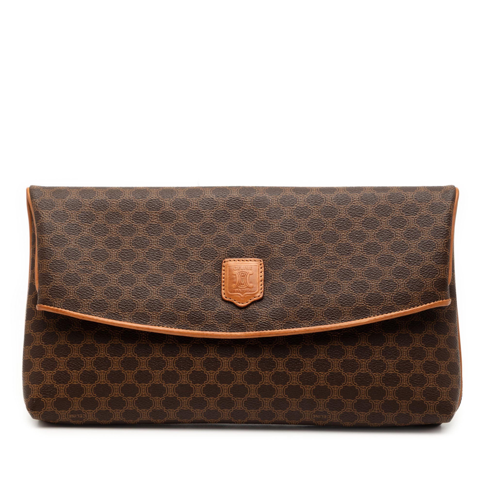 This clutch bag features a coated canvas body with leather trim, a fold-over top with magnetic snap closure, and an interior zip pocket. Retail Price: 500.00