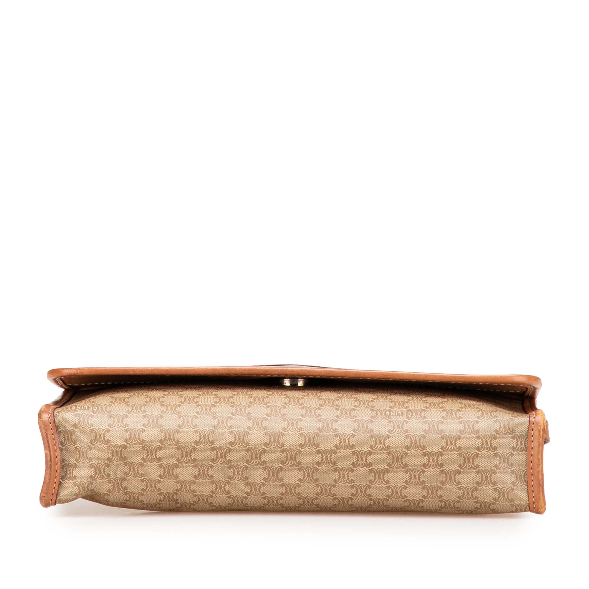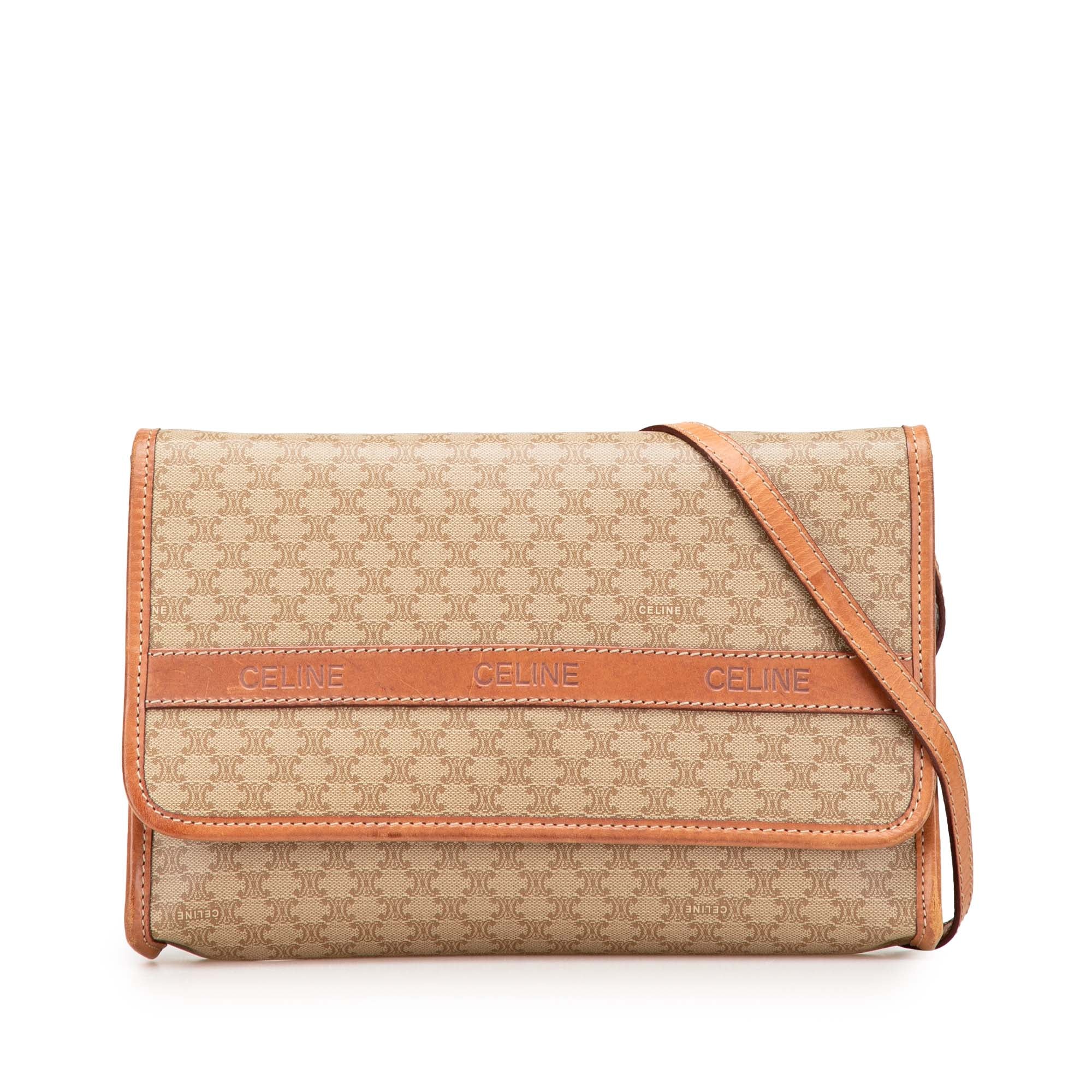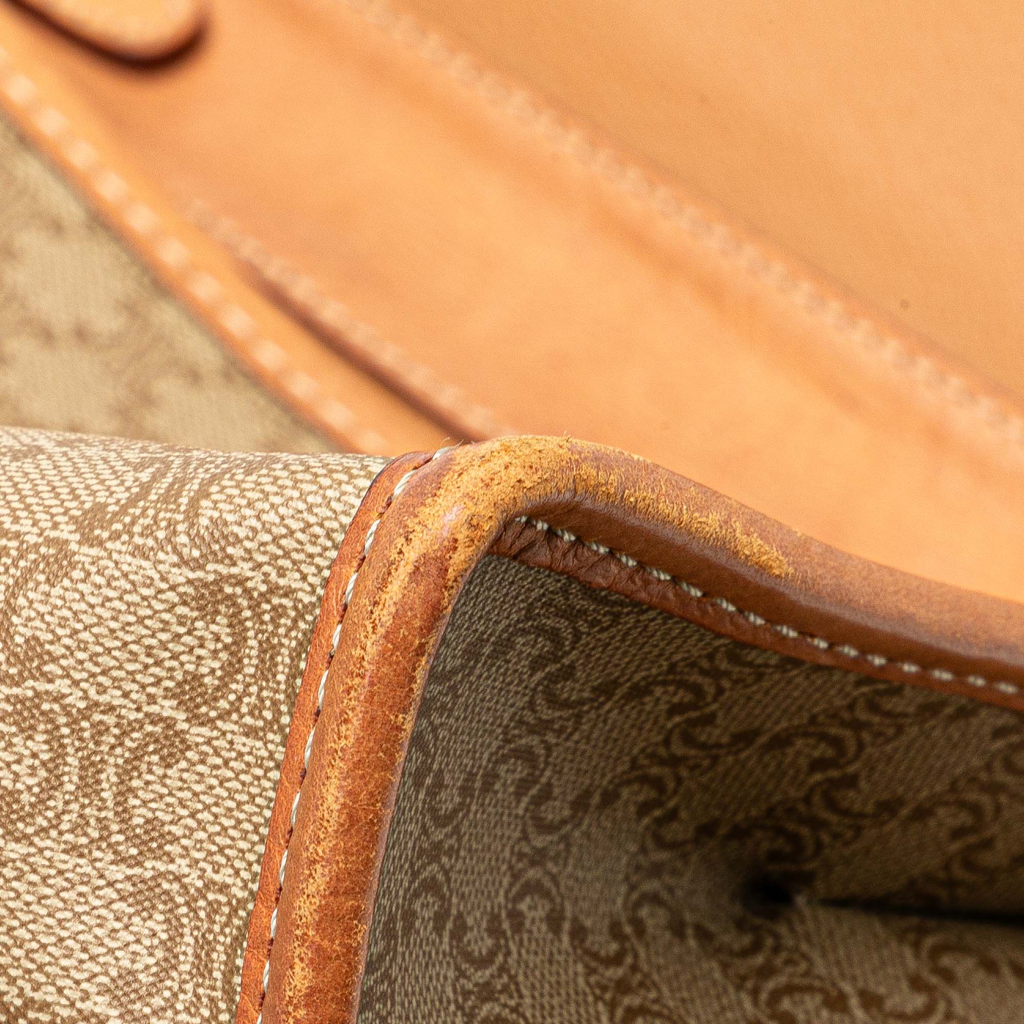 This crossbody bag features a coated canvas body with leather trim, a flat leather strap, a front flap with magnetic snap closure, and an interior zip pocket. Retail Price: 780.00