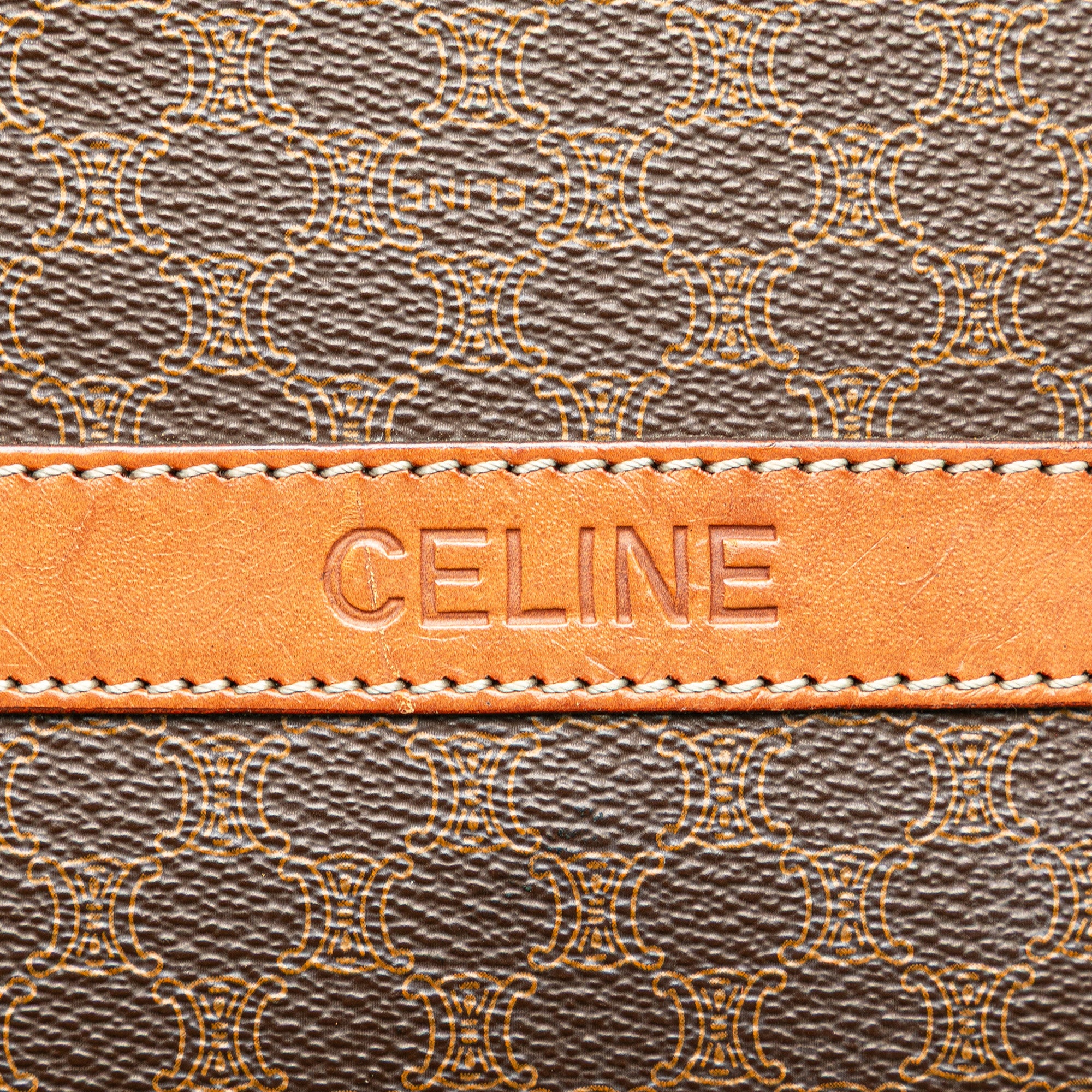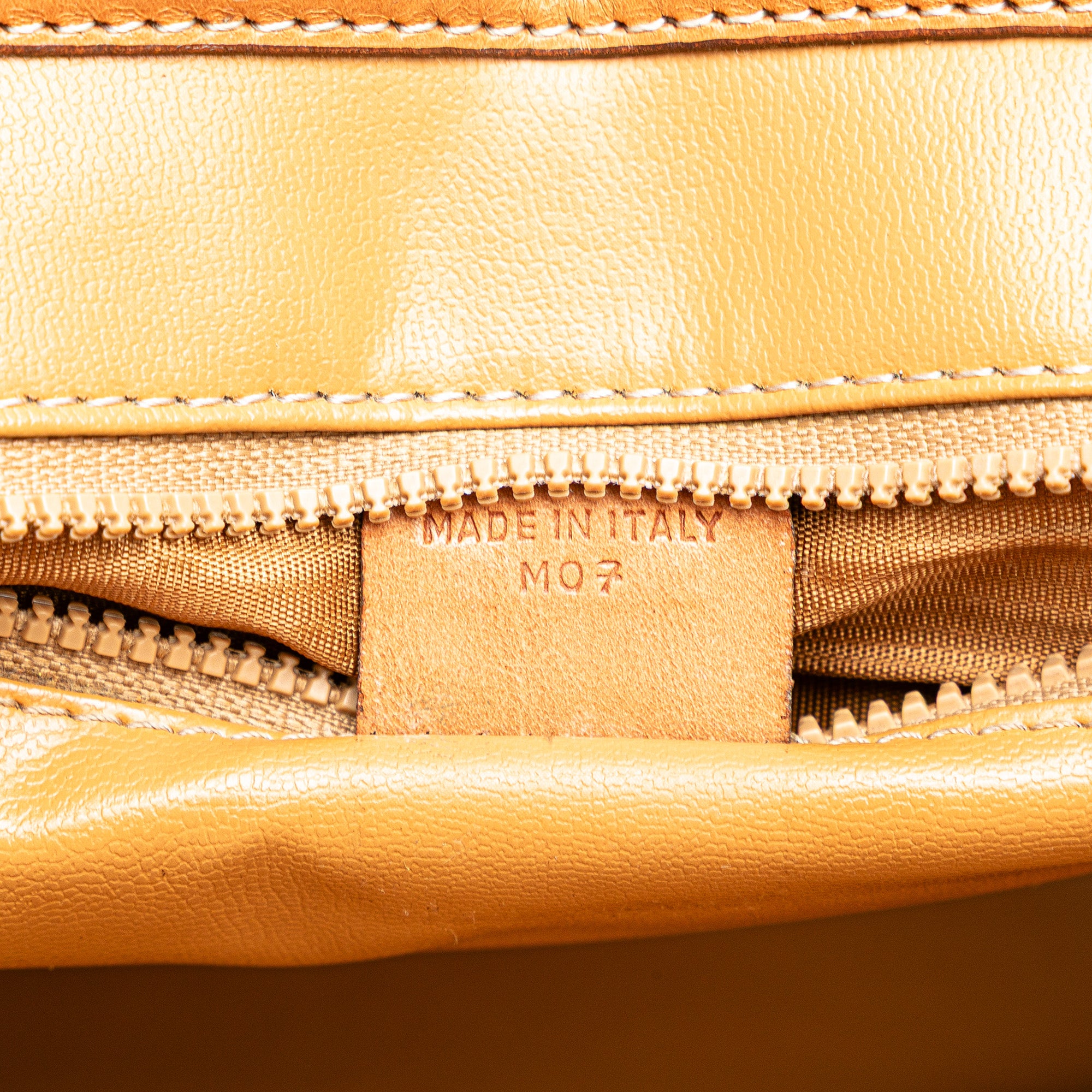 This crossbody bag features a coated canvas body with leather trim, a flat leather strap, a front flap with magnetic snap closure, and an interior zip pocket. Retail Price: 780.00