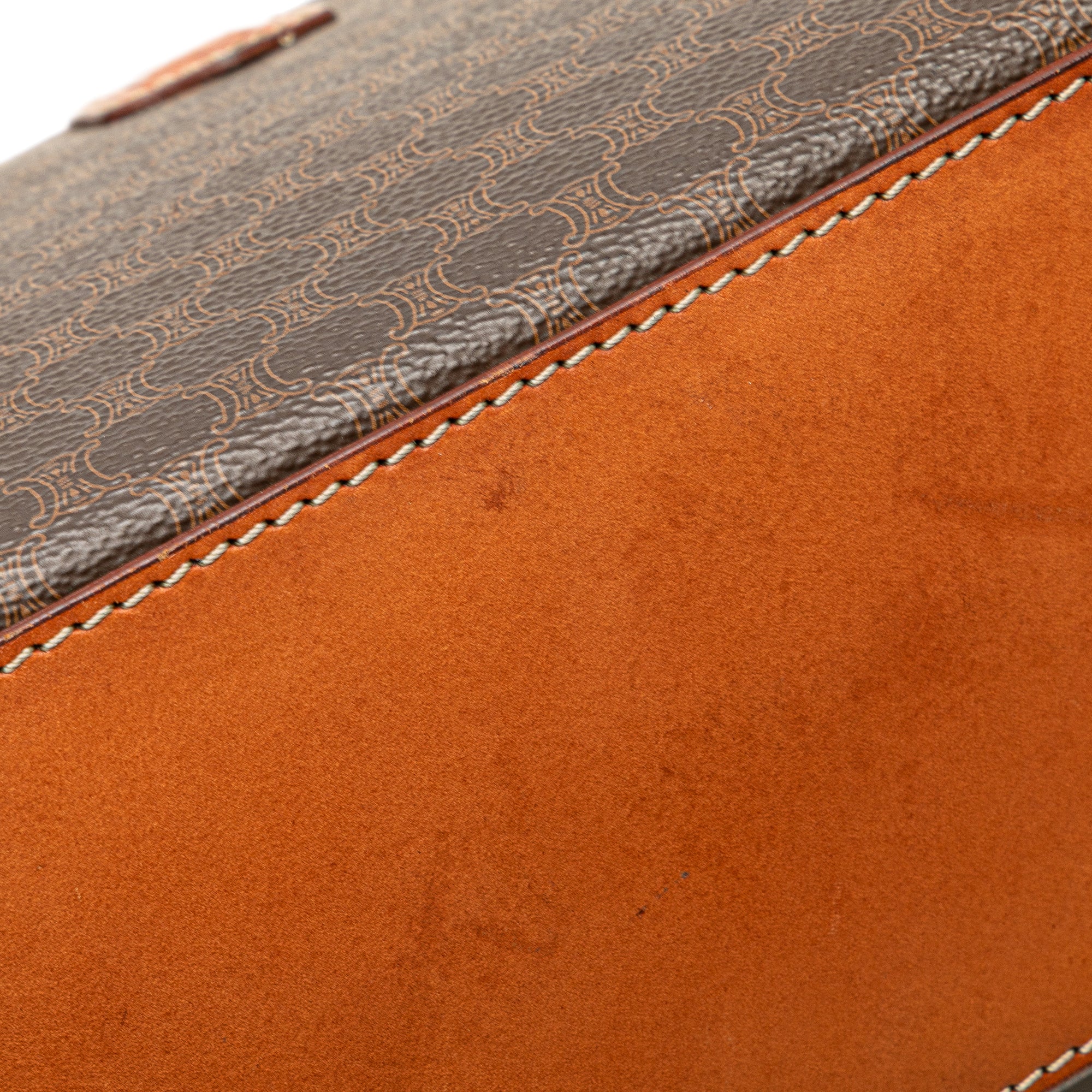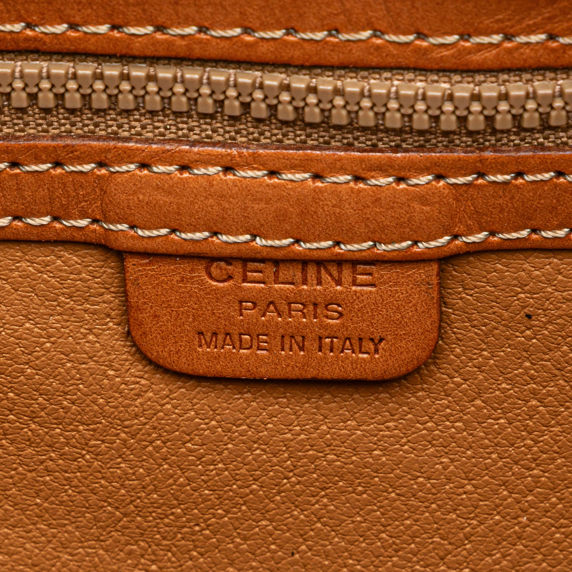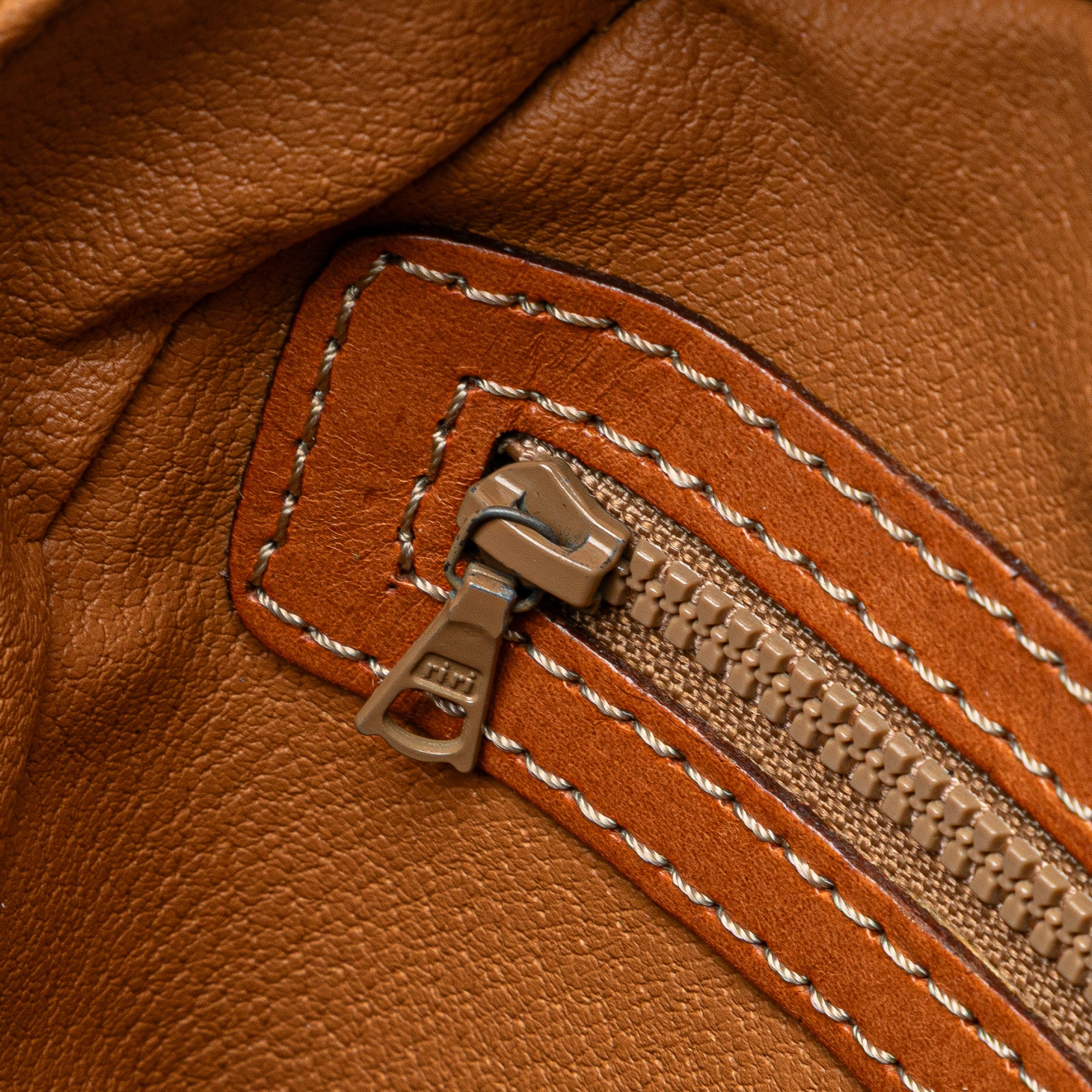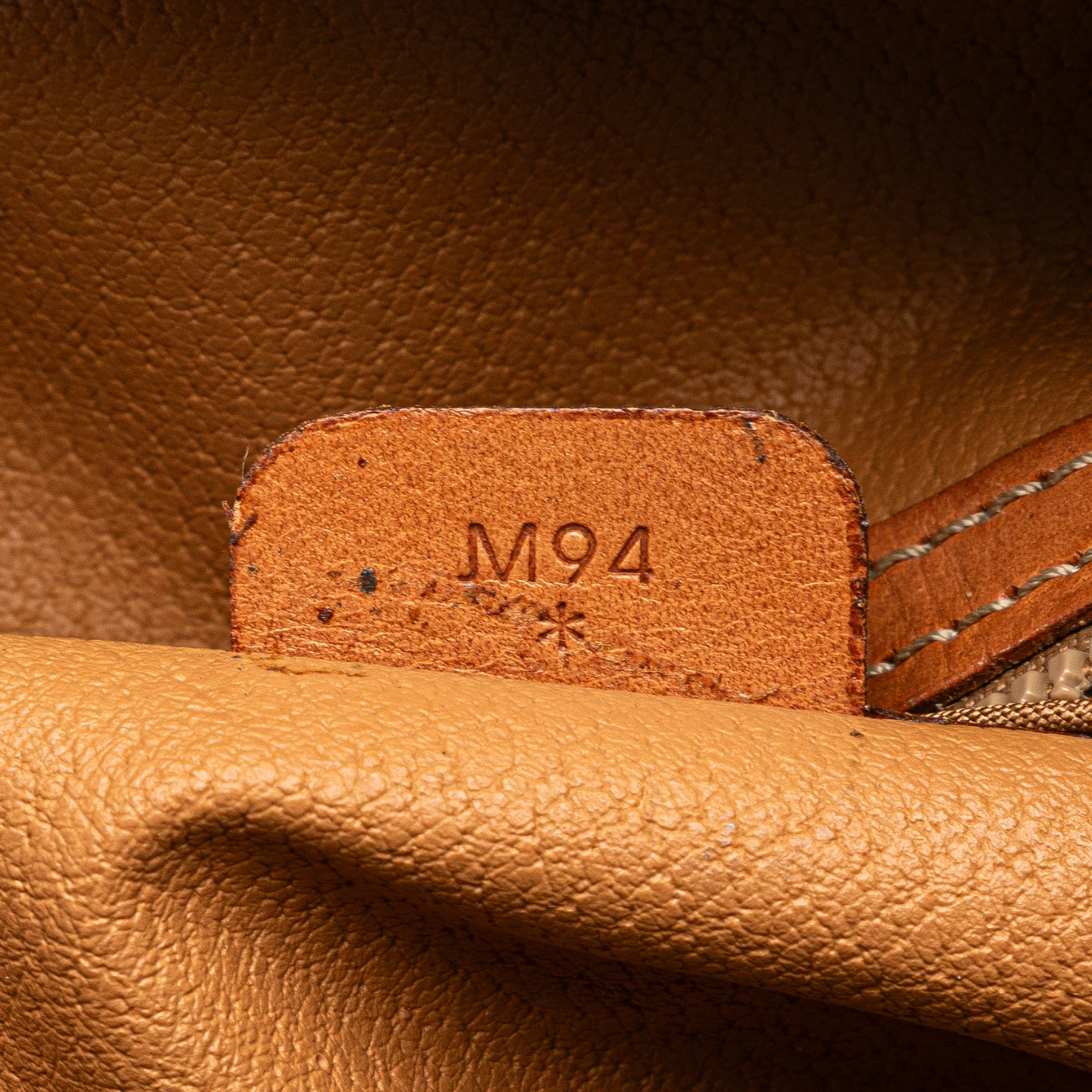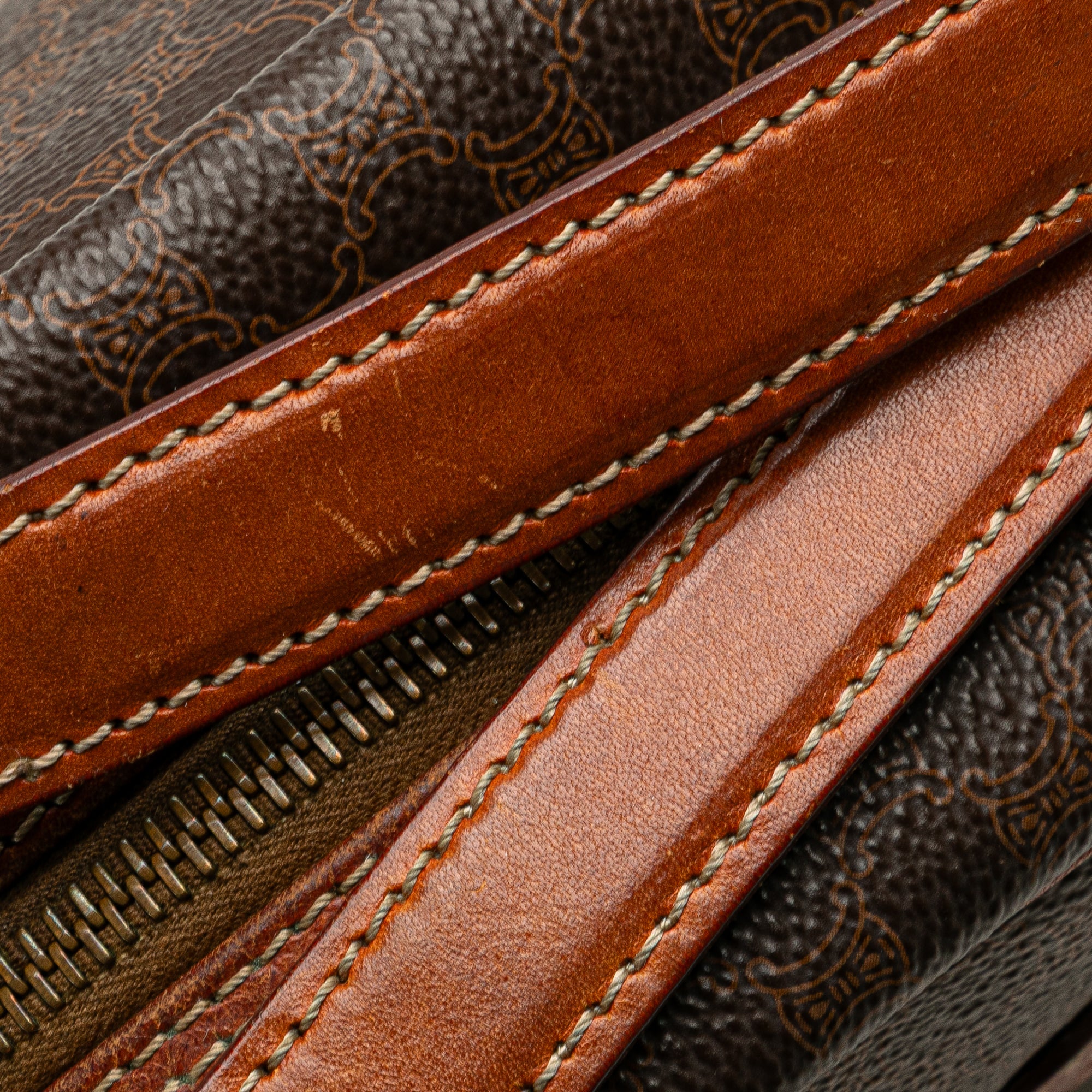 This handbag features a coated canvas body with leather trim, flat leather handles, a top zip closure, and an interior zip pocket. Retail Price: 600.00