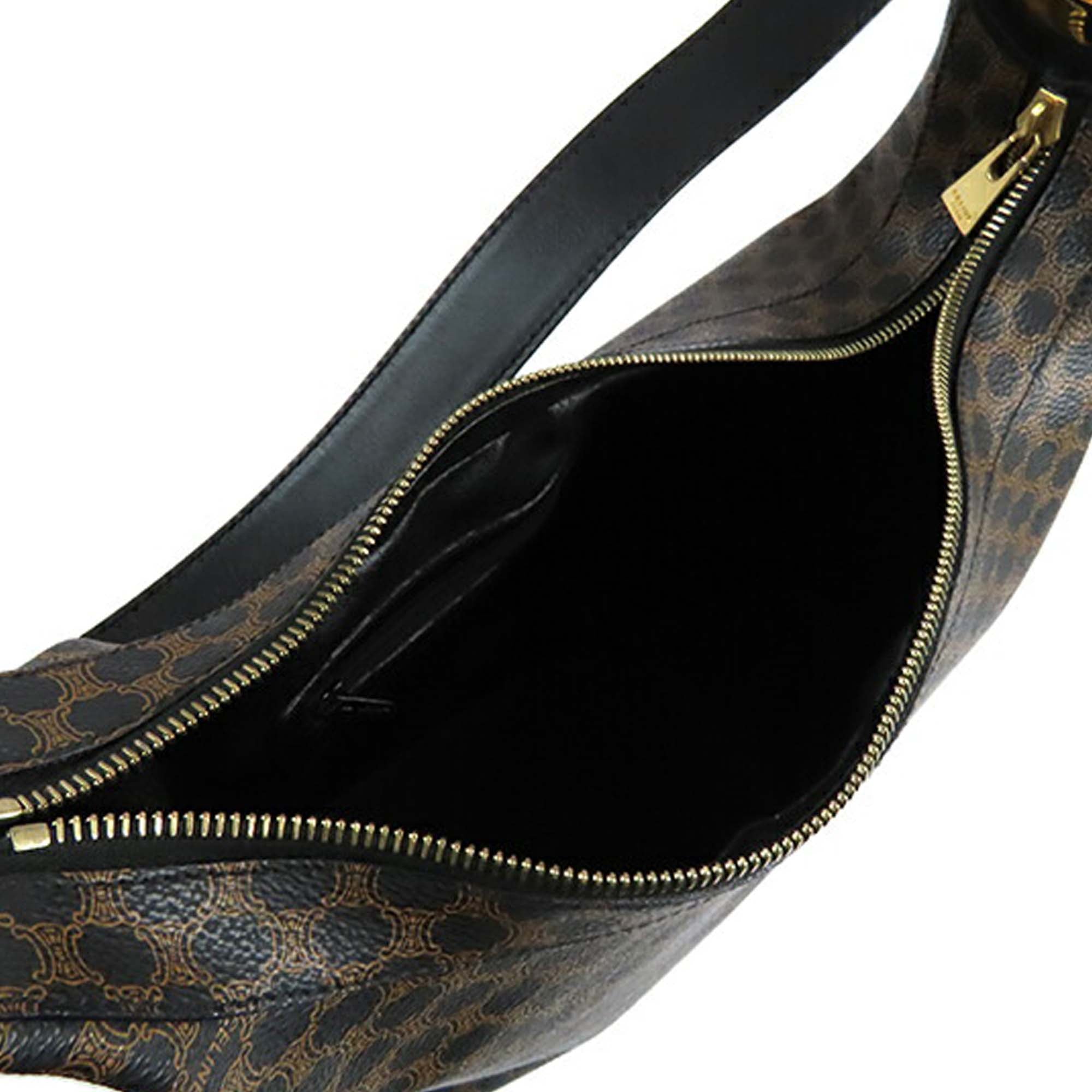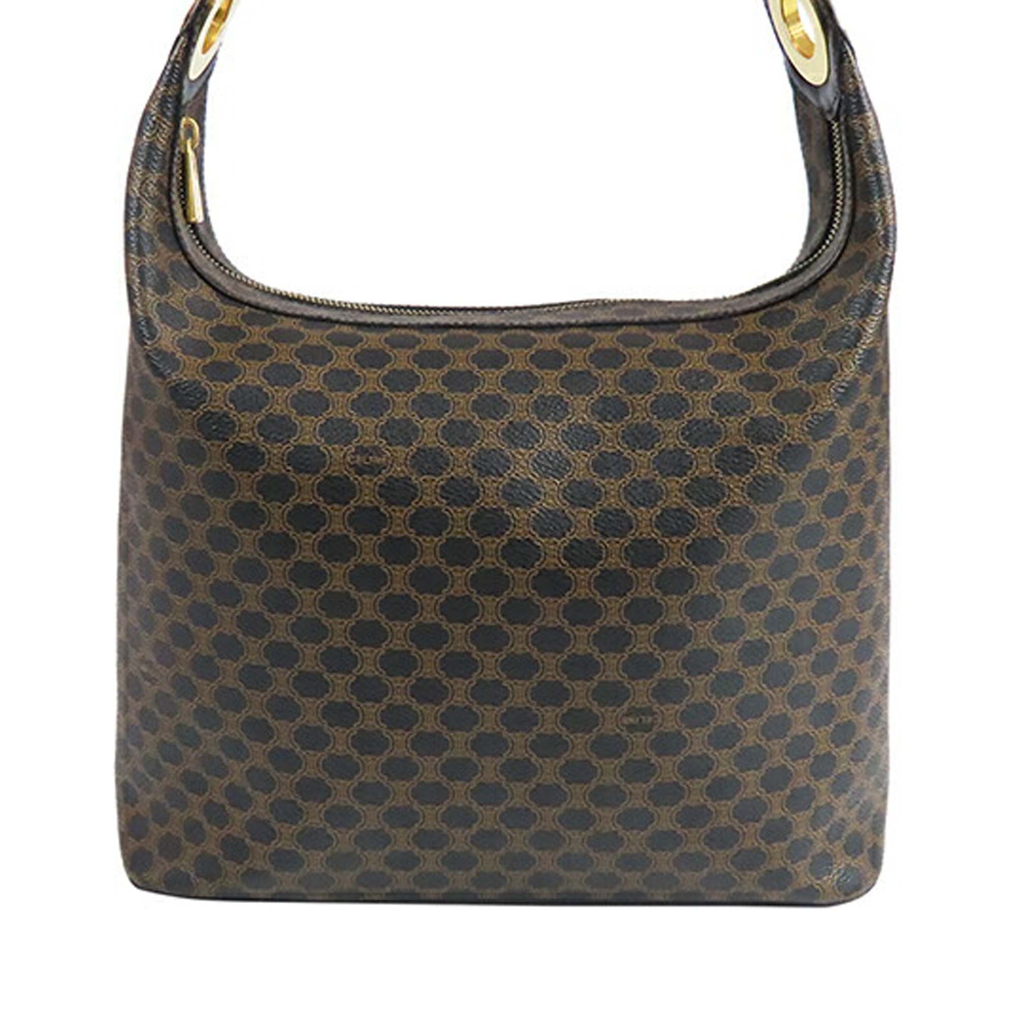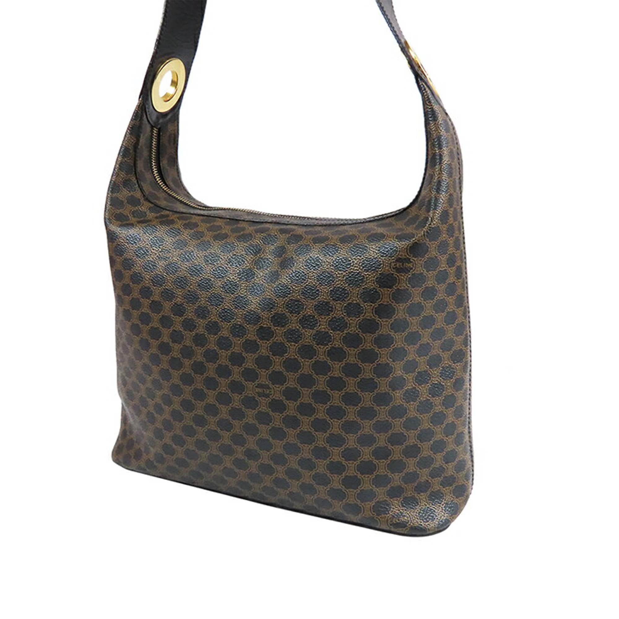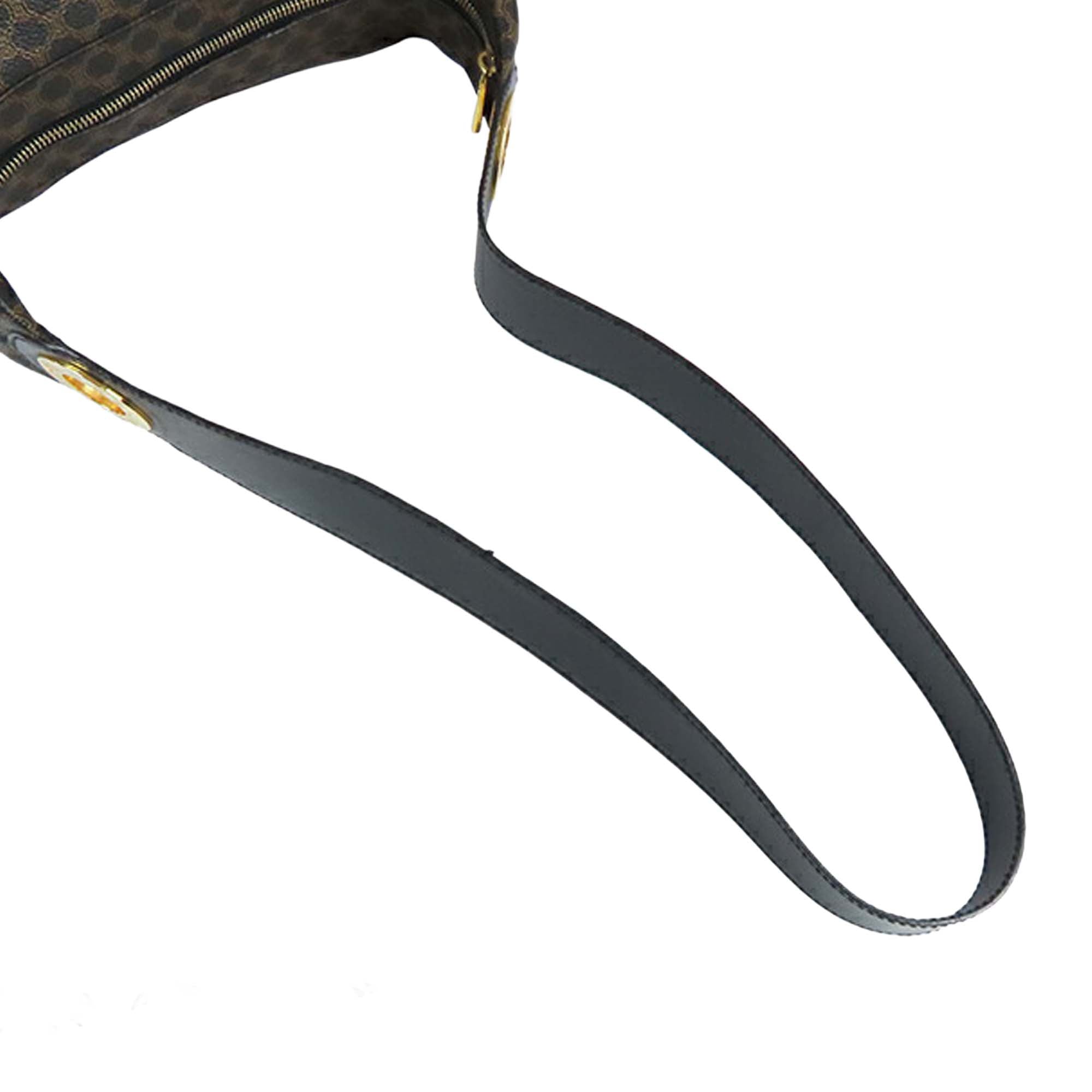 This shoulder bag features a coated canvas body, a flat leather strap, a top zip closure, and interior zip and slip pockets. Retail Price: 1400.00