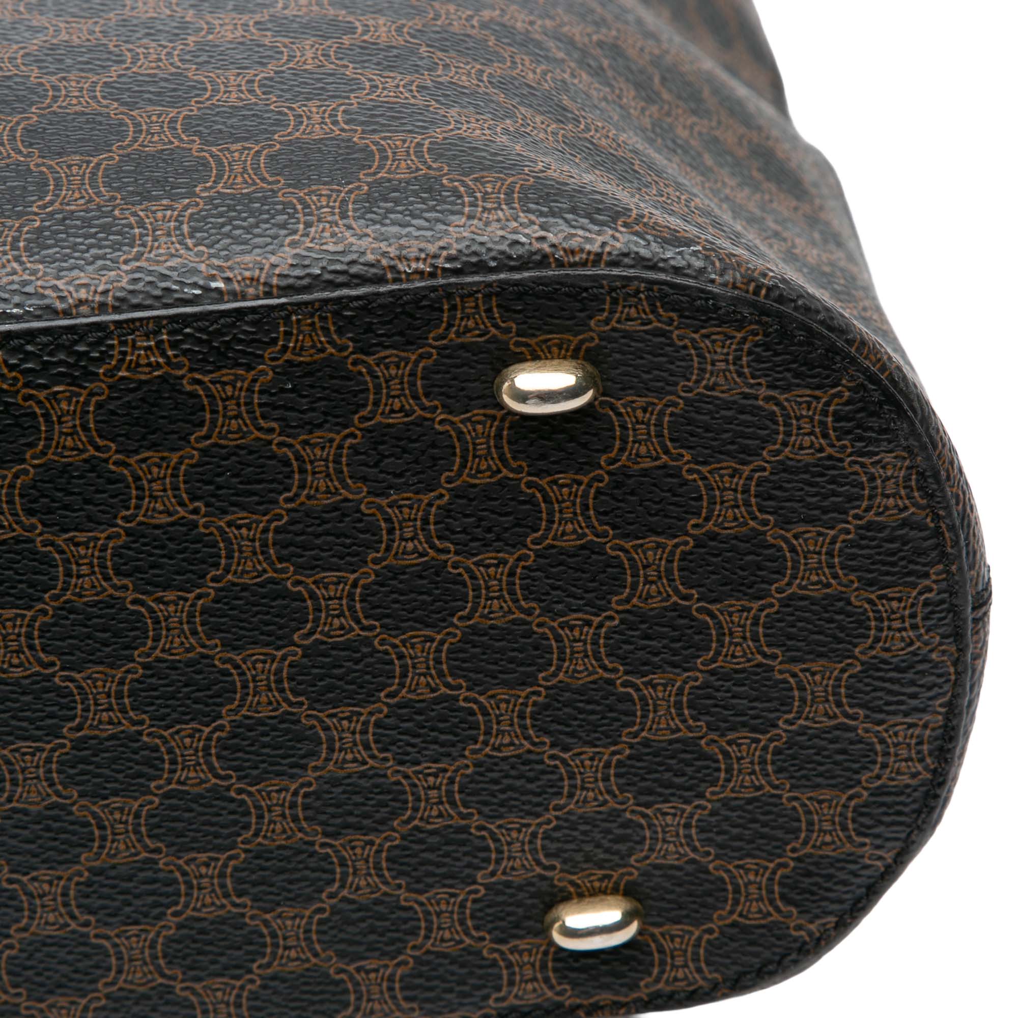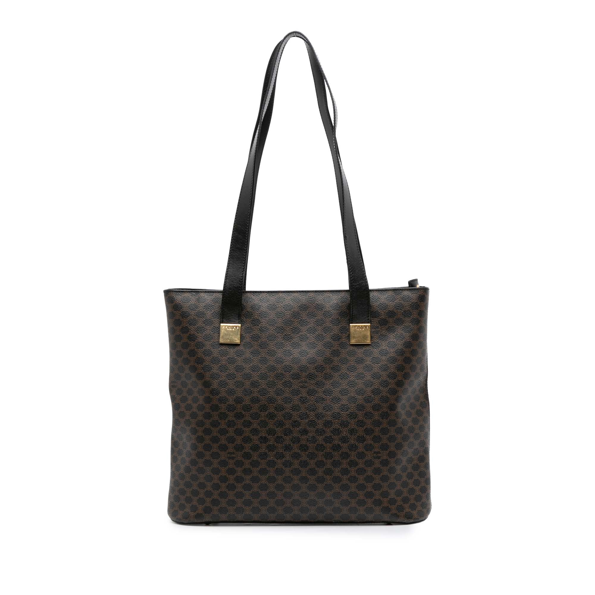 This tote bag features a coated canvas body with leather trim, flat leather straps, an open top with button closure, and interior zip pocket. Retail Price: 895.00