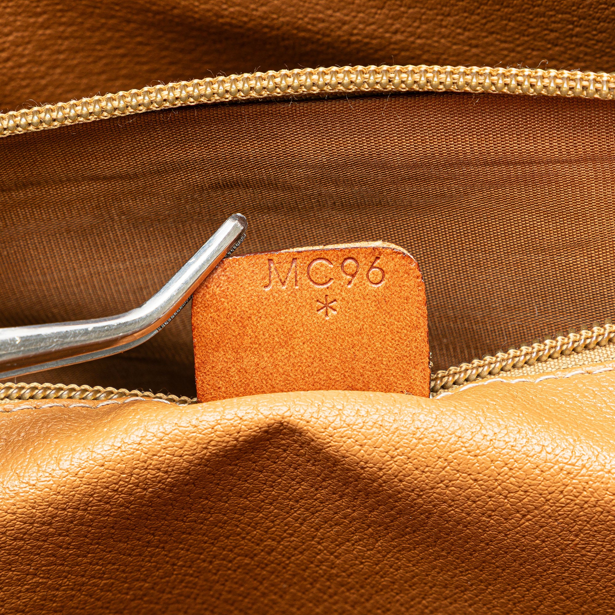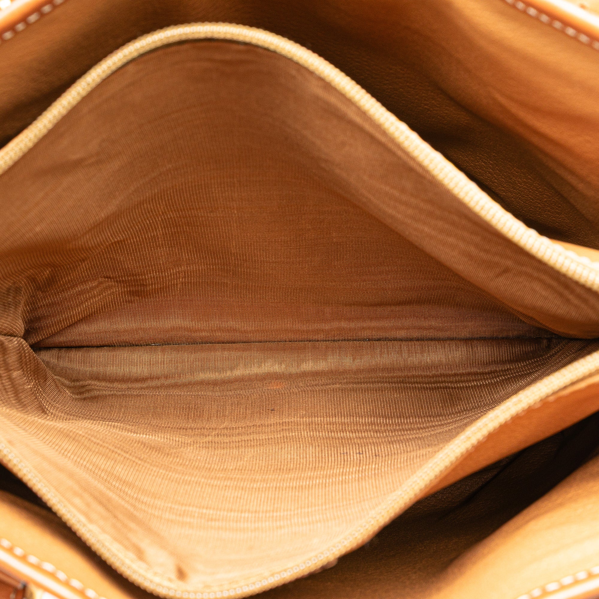 This tote bag features a coated canvas body with leather trim, flat leather shoulder straps, an open top, and an interior zip compartment. Retail Price: 800.00