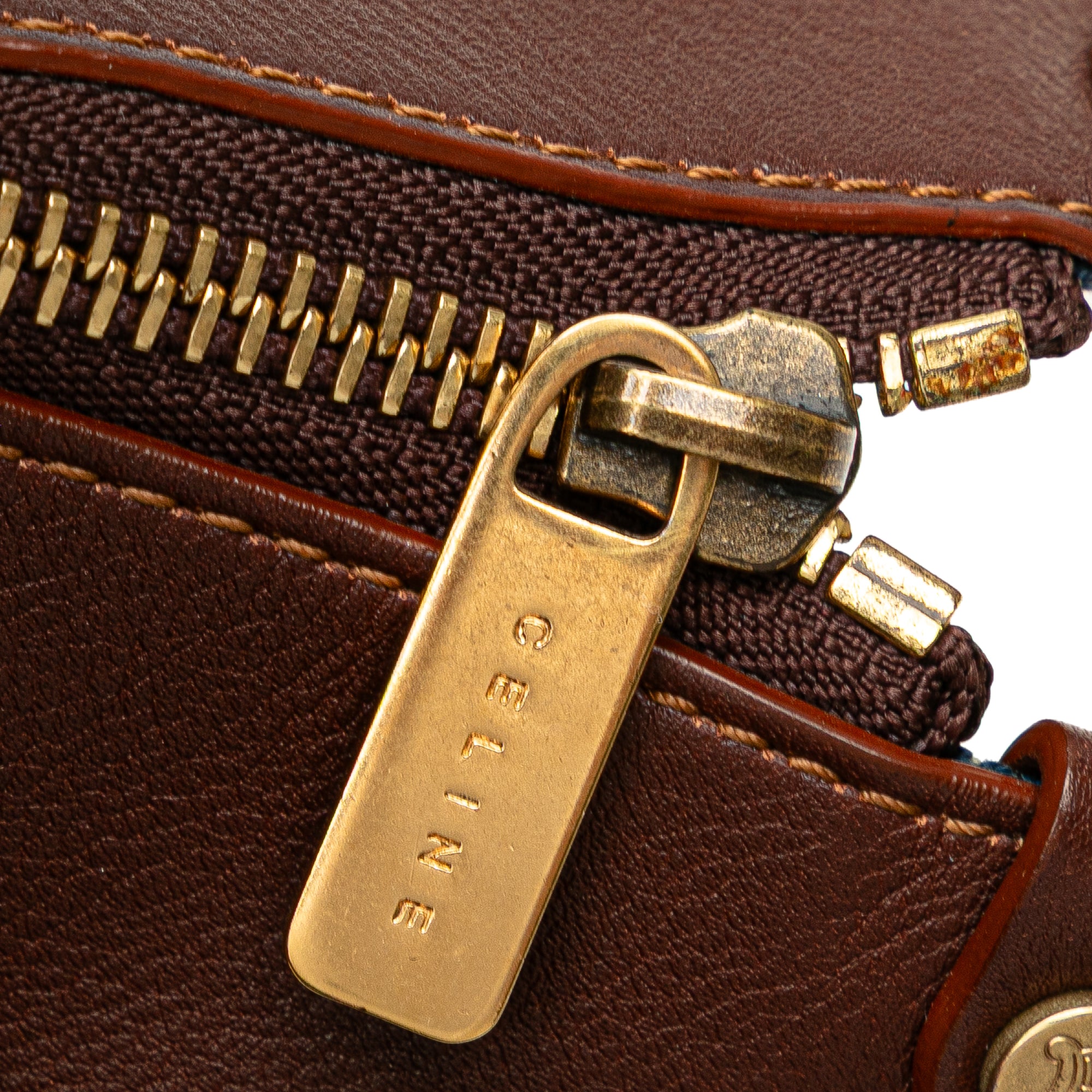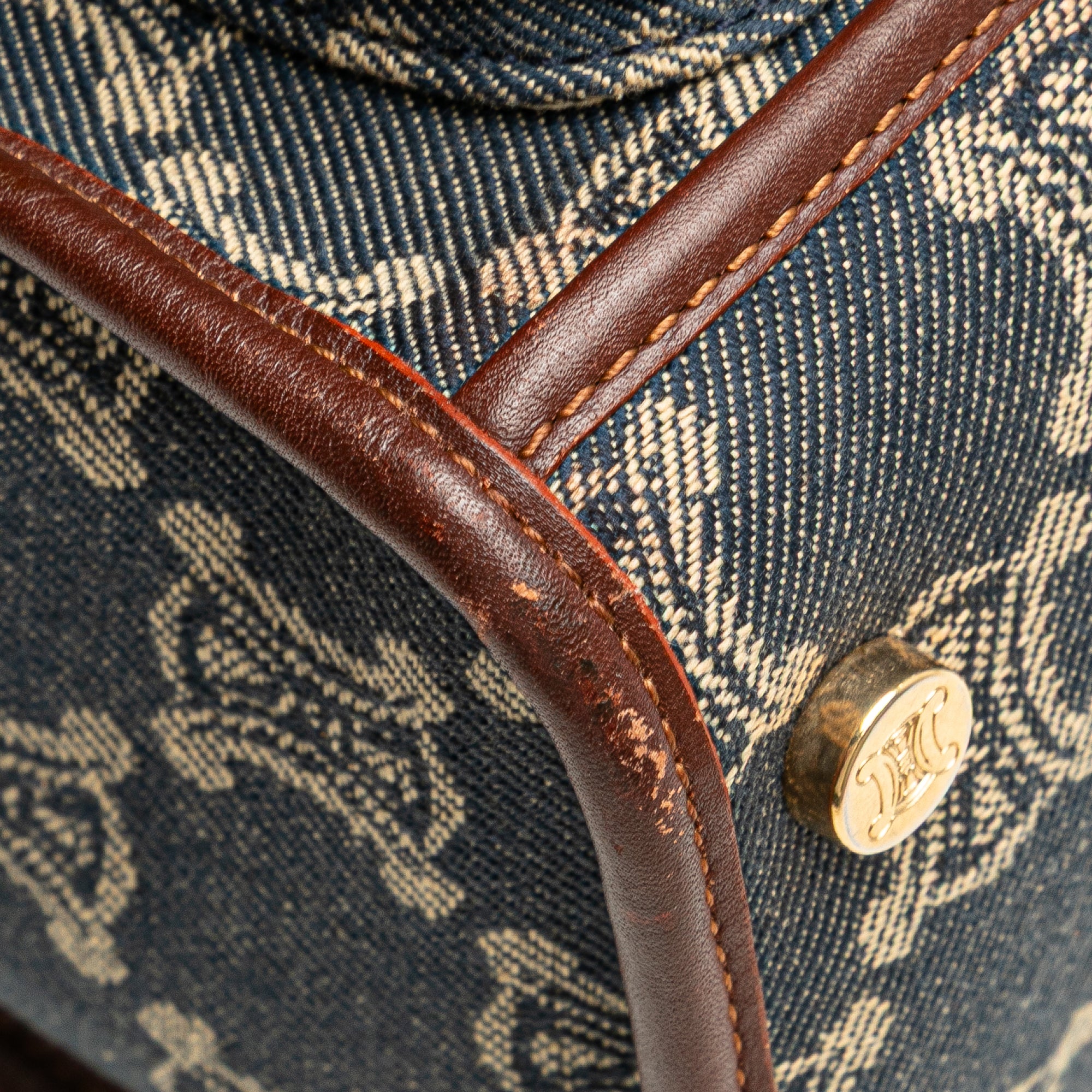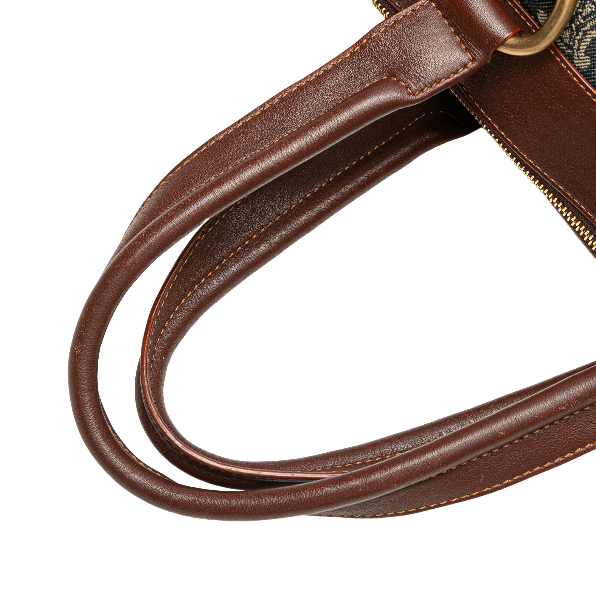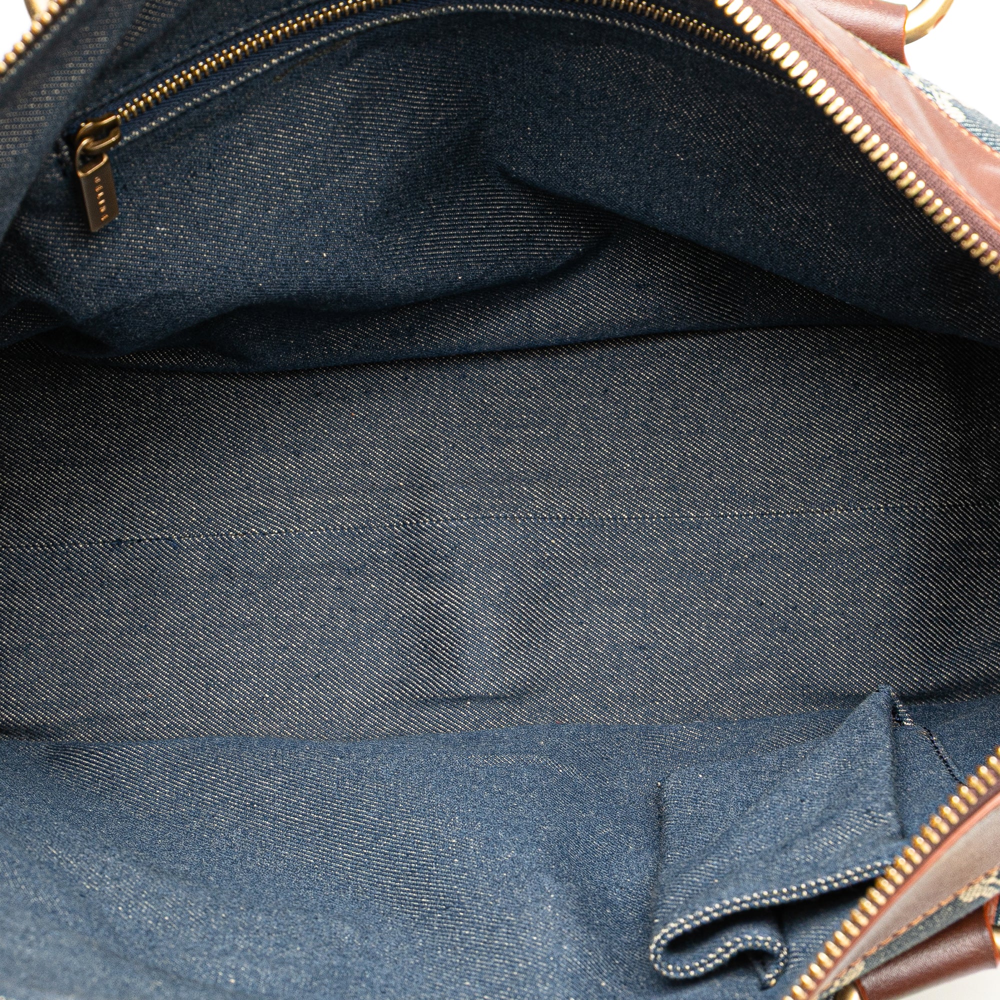 This tote bag features a denim body with leather trim, flat leather handles, a top zip closure, front flap pockets with buckle closure, and interior zip and slip pockets. Retail Price: 500.00