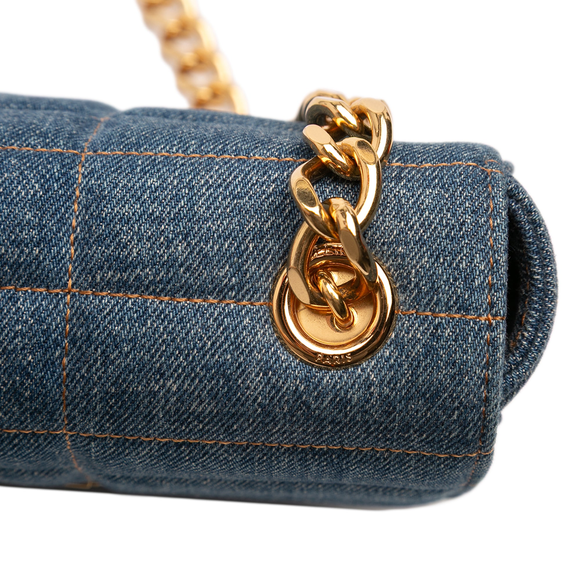 This shoulder bag features a quilted denim body, a chain link shoulder strap, a front flap with a snap button closure, and an interior slip pocket. Inclusion: Dust bag. Retail Price: 1356.00