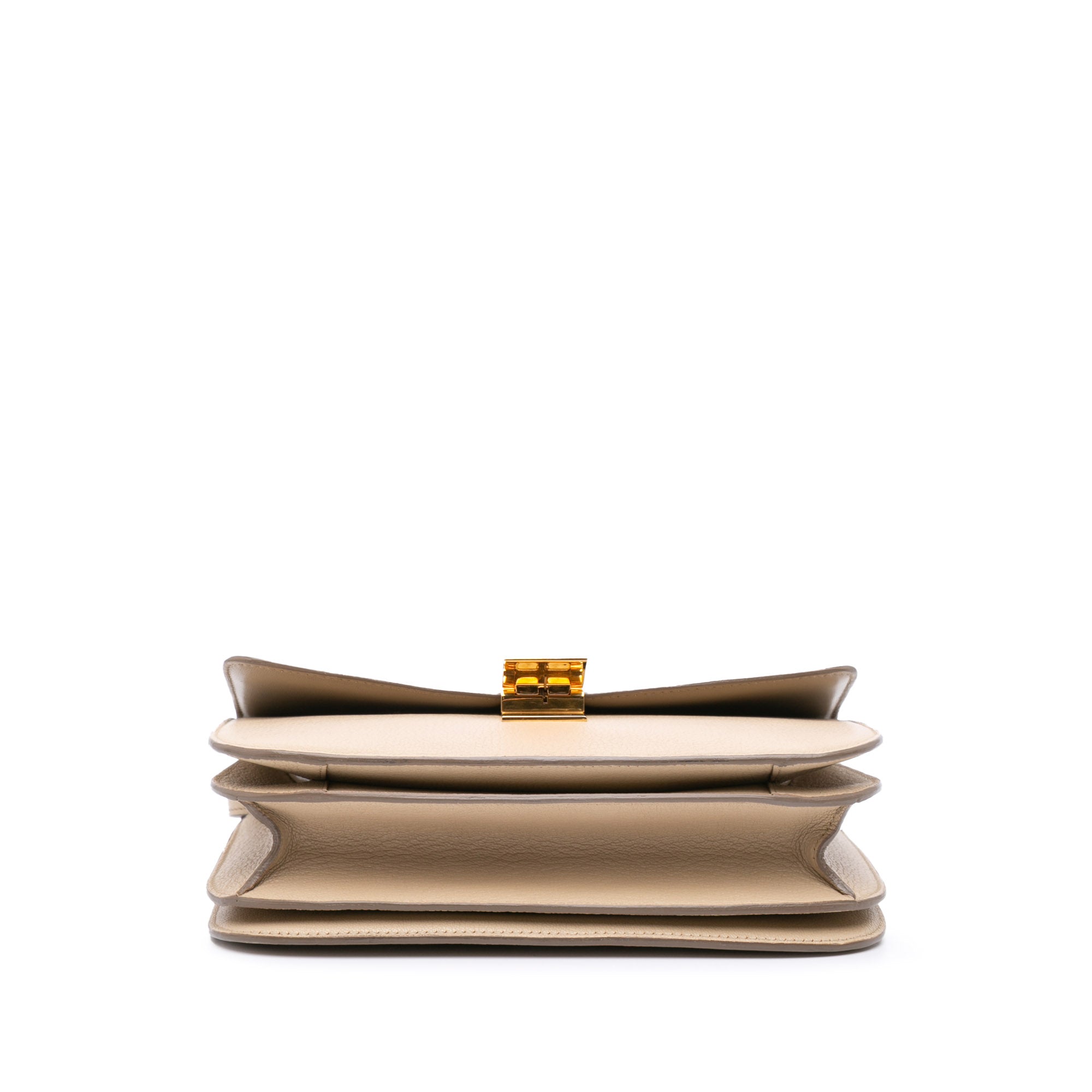 The Classic Box bag features a leather body, an adjustable flat leather strap, a front flap with a push lock closure, and interior slip pockets. Retail Price: 3545.00