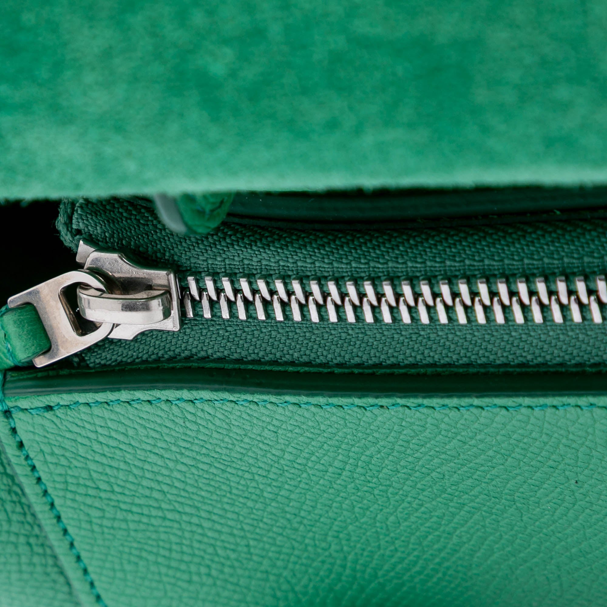 The Micro Belt Bag features a leather body, a flat leather top handle, a detachable flat leather strap, a front flap with a top zip closure, an exterior back zip pocket, and interior slip pockets. Retail Price: 2850.00